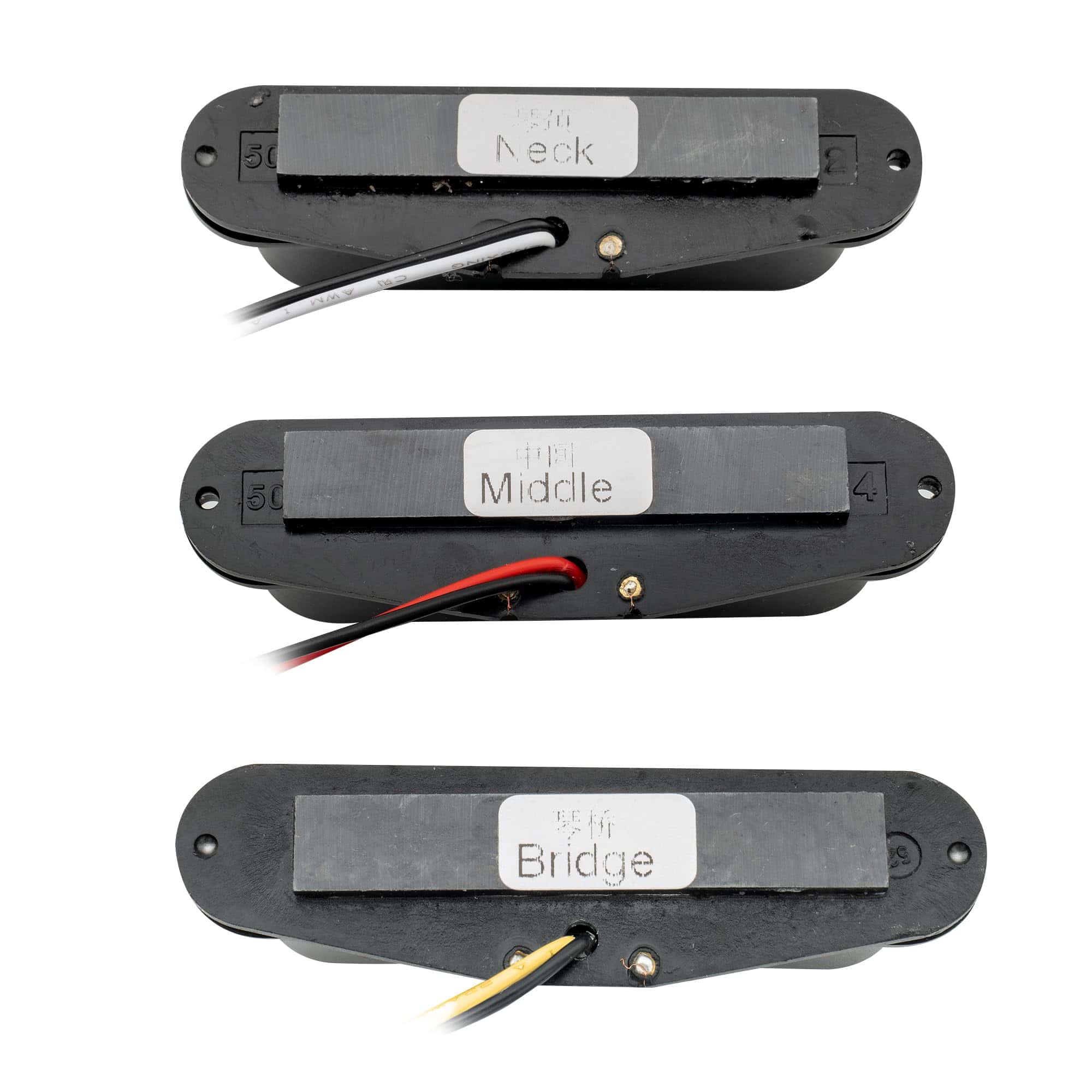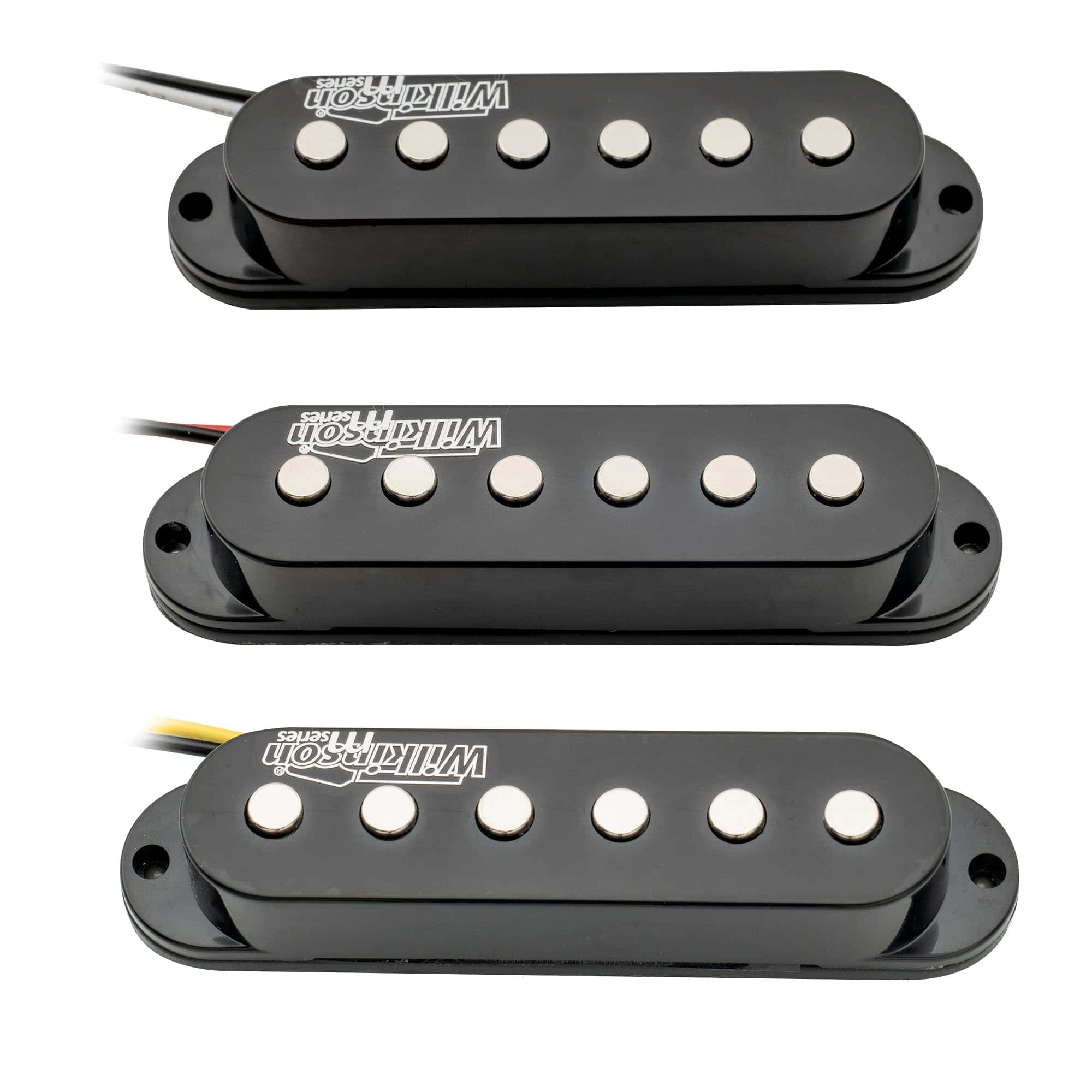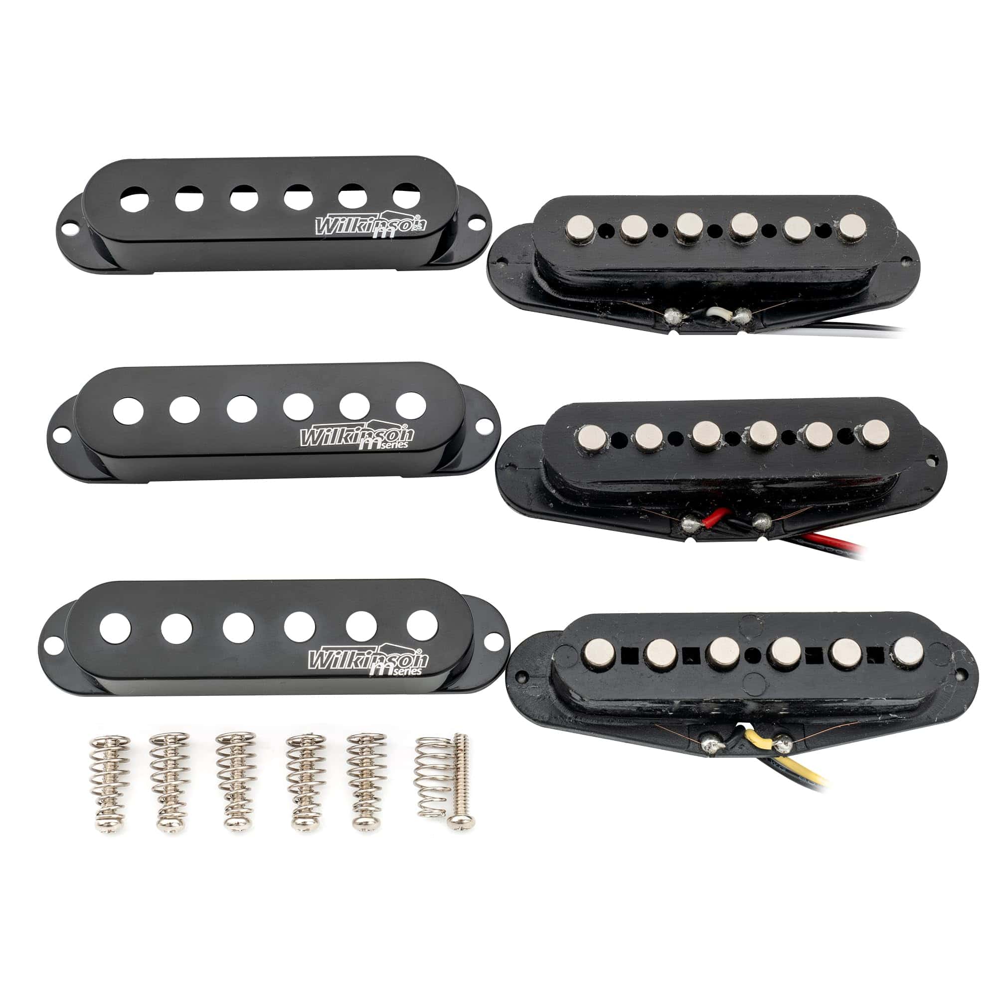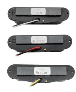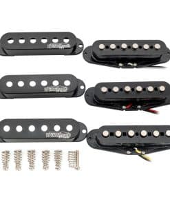 Set de pastillas de bobina simple de cerámica de alta potencia Wilkinson para guitarra eléctrica estilo Strat, negro. Se adapta a guitarra eléctrica estilo Strat, posición de mástil/centro/puente. Espaciado de polos: 50mm (Mástil, Centro) / 52mm (Puente), bobinas simples de alta potencia con énfasis en rango medio, ideal para efectos de distorsión. Imán: Cerámica; Resistencia: 6.4K (mástil, centro) / 6.6K (puente). La pastilla central tiene polaridad invertida, ofreciendo la característica de cancelación de ruido. Paquete incluido: 3 Piezas de pastillas (mástil/centro/puente). Nota: Nuestros tornillos tal vez no se ajusten a tu uso, por favor utiliza los tuyos si puedes.