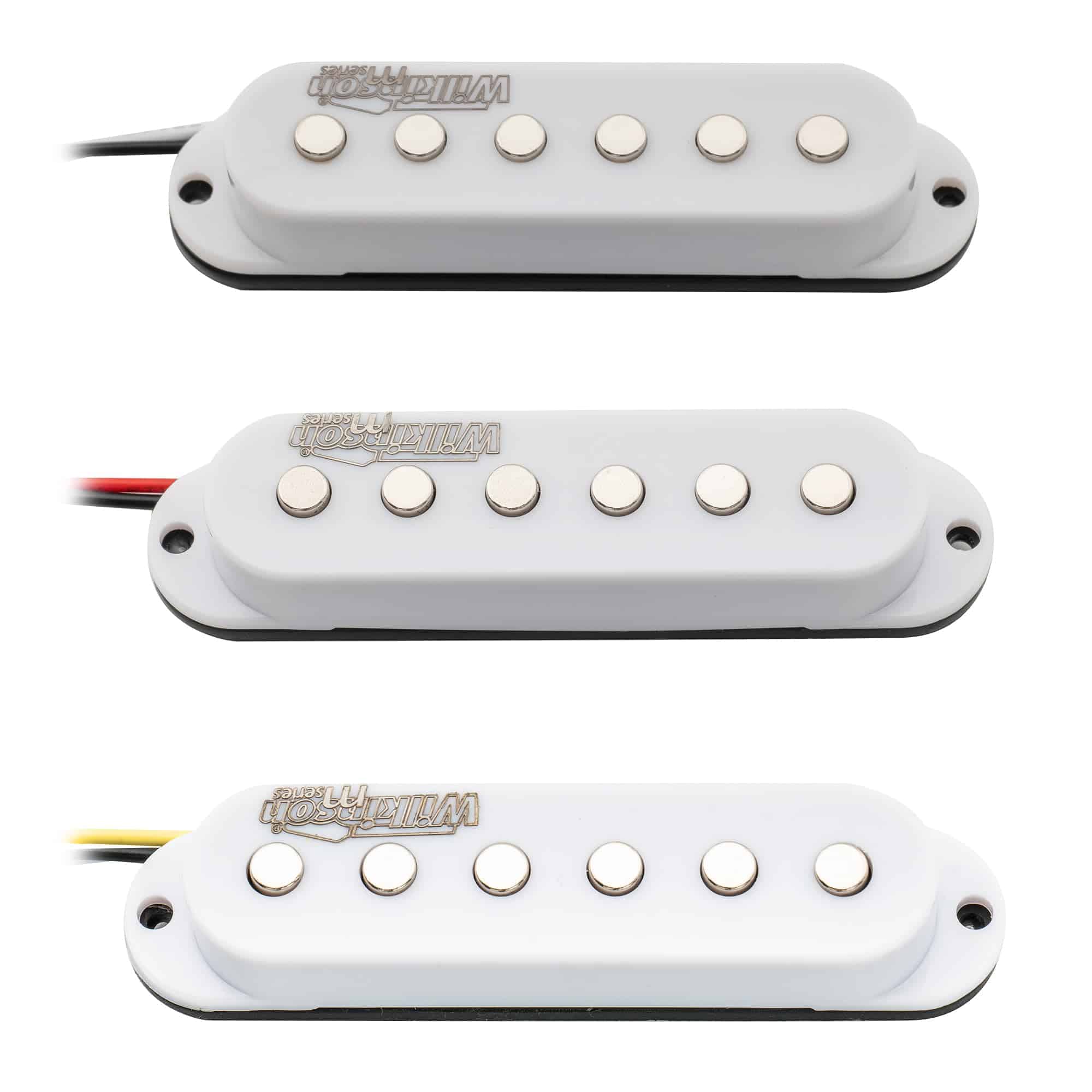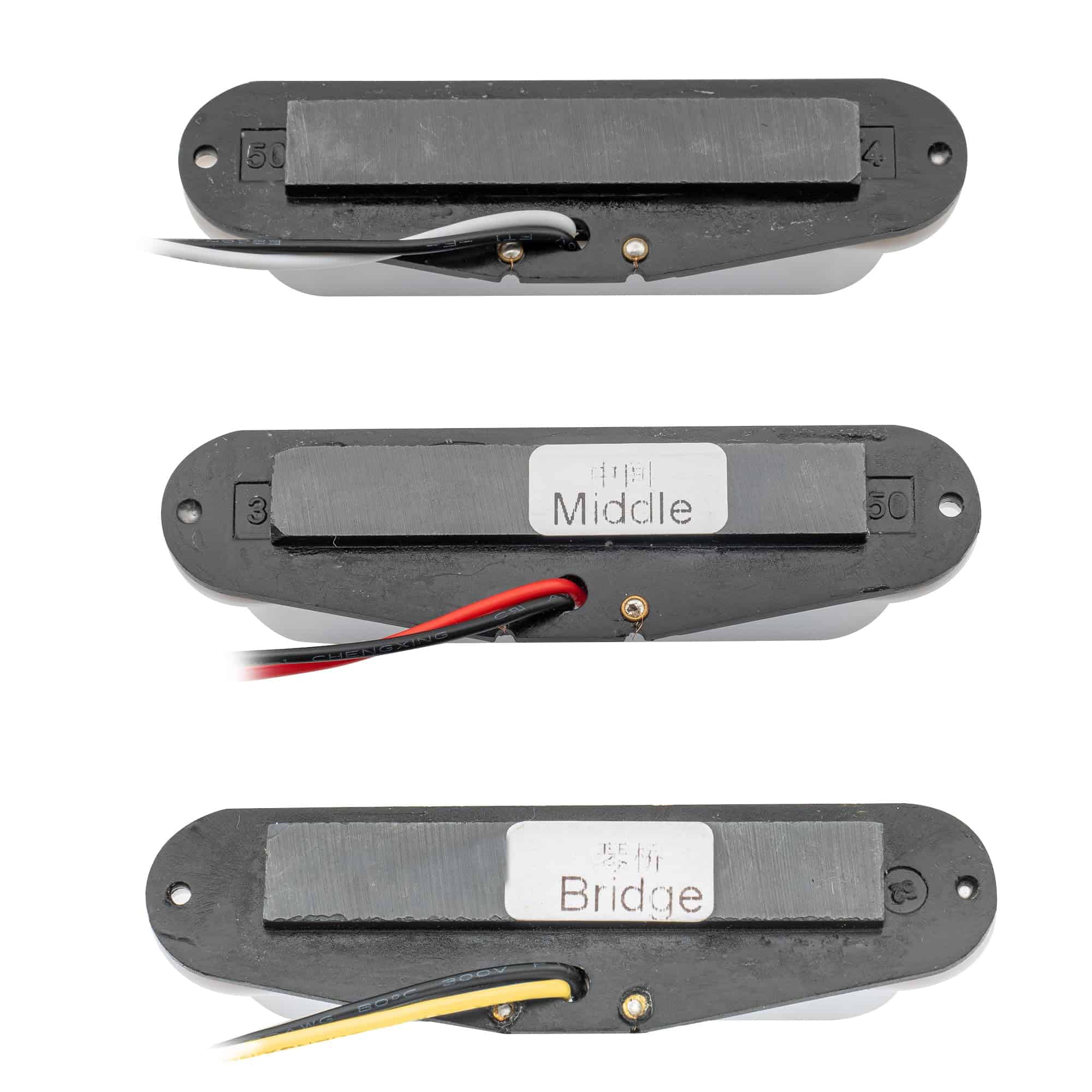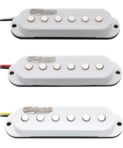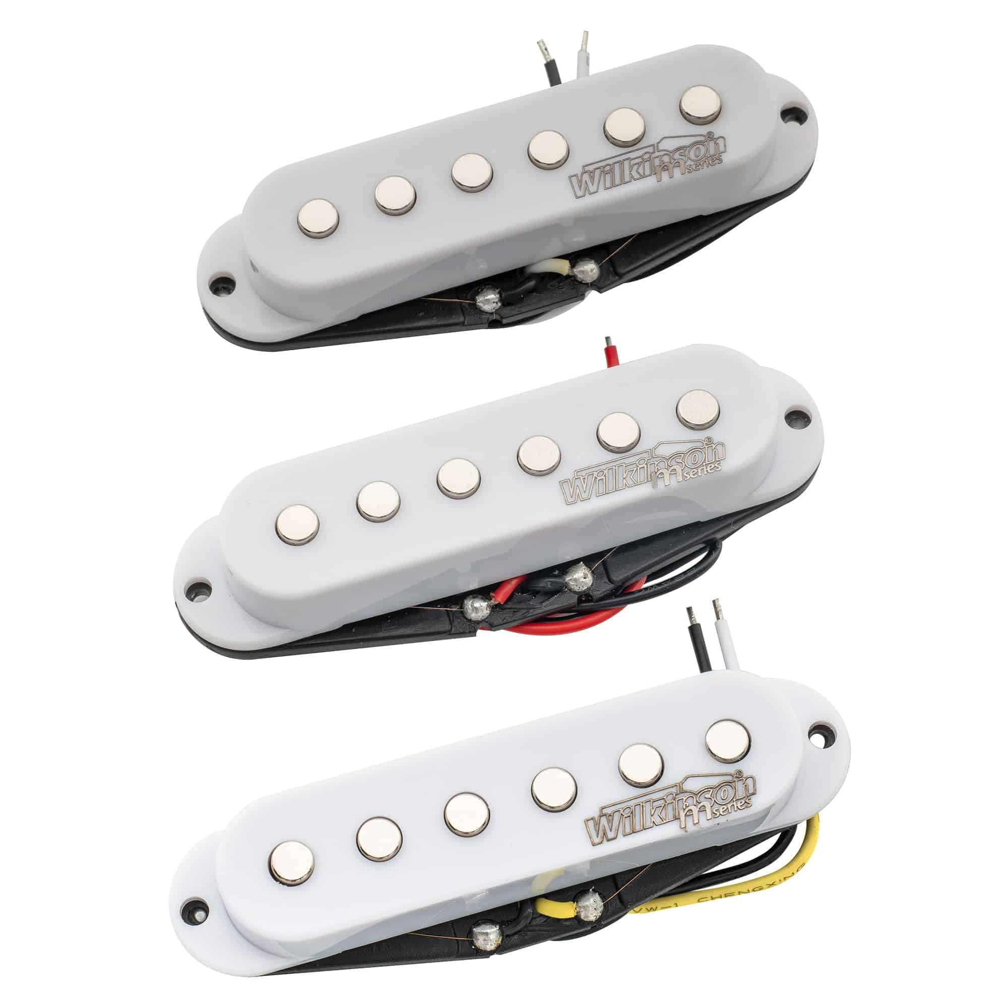 Set de Pastillas de Bobina Simple de Cerámica de Alto Rendimiento Wilkinson para Guitarra Eléctrica Estilo Strat, Blanco. Se adapta a la guitarra eléctrica estilo Strat, posición de mástil/centro/puente. Espaciado de polos: 50mm (Mástil, Centro) / 52mm (Puente), bobinas simples de alto rendimiento con énfasis extra en el rango medio, ideales para efectos de impulsión. Imán: Cerámico; Resistencia: 6.4K (mástil, centro) / 6.6K (puente). La pastilla central tiene polaridad/inversión de bobinado inversa, ofrece una característica de cancelación de ruido. Paquete incluido: 3 piezas de pastillas (mástil/centro/puente). Nota: Nuestros tornillos quizás no se adapten a su uso, por favor use los suyos si puede.