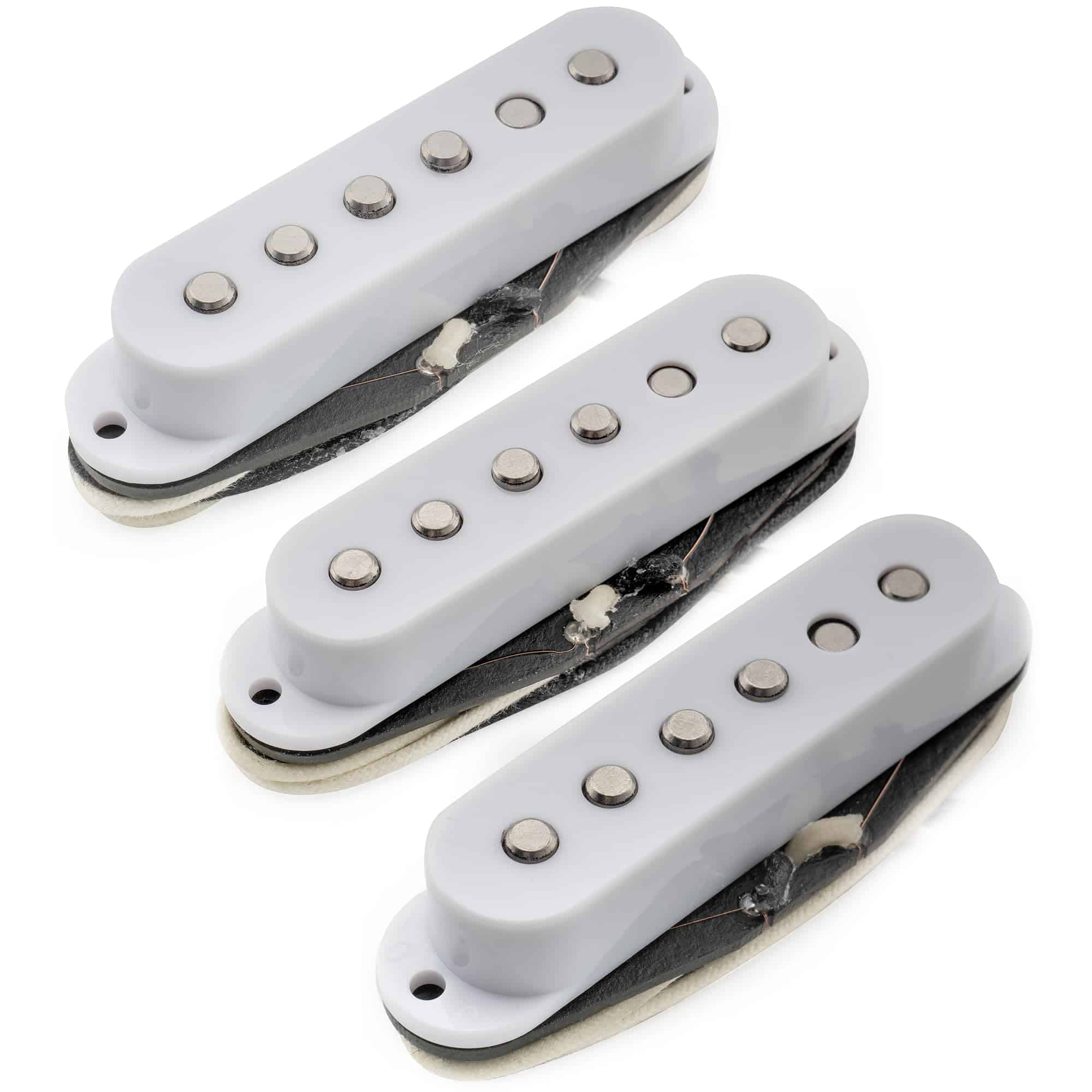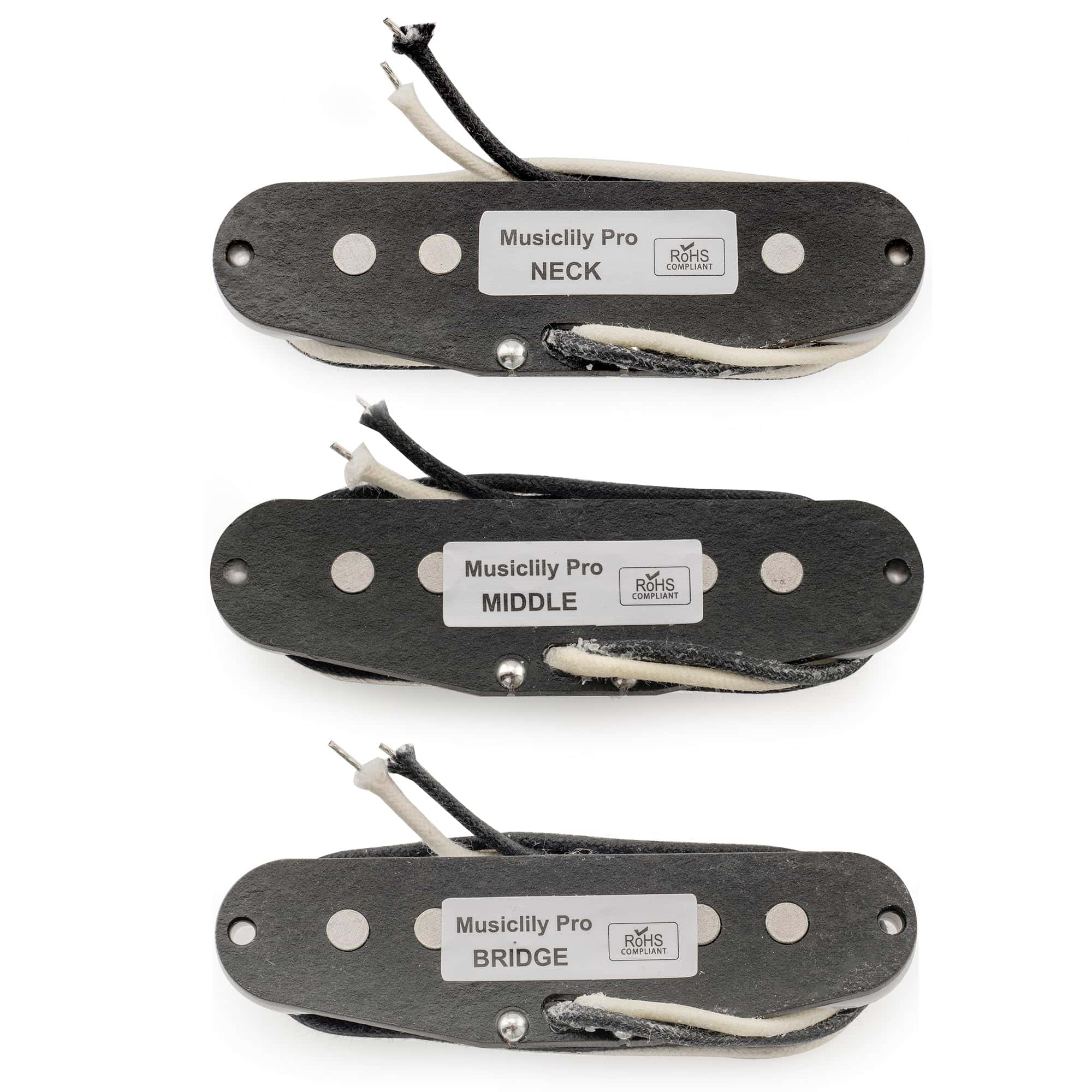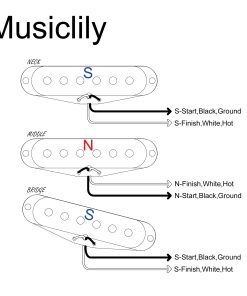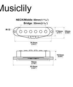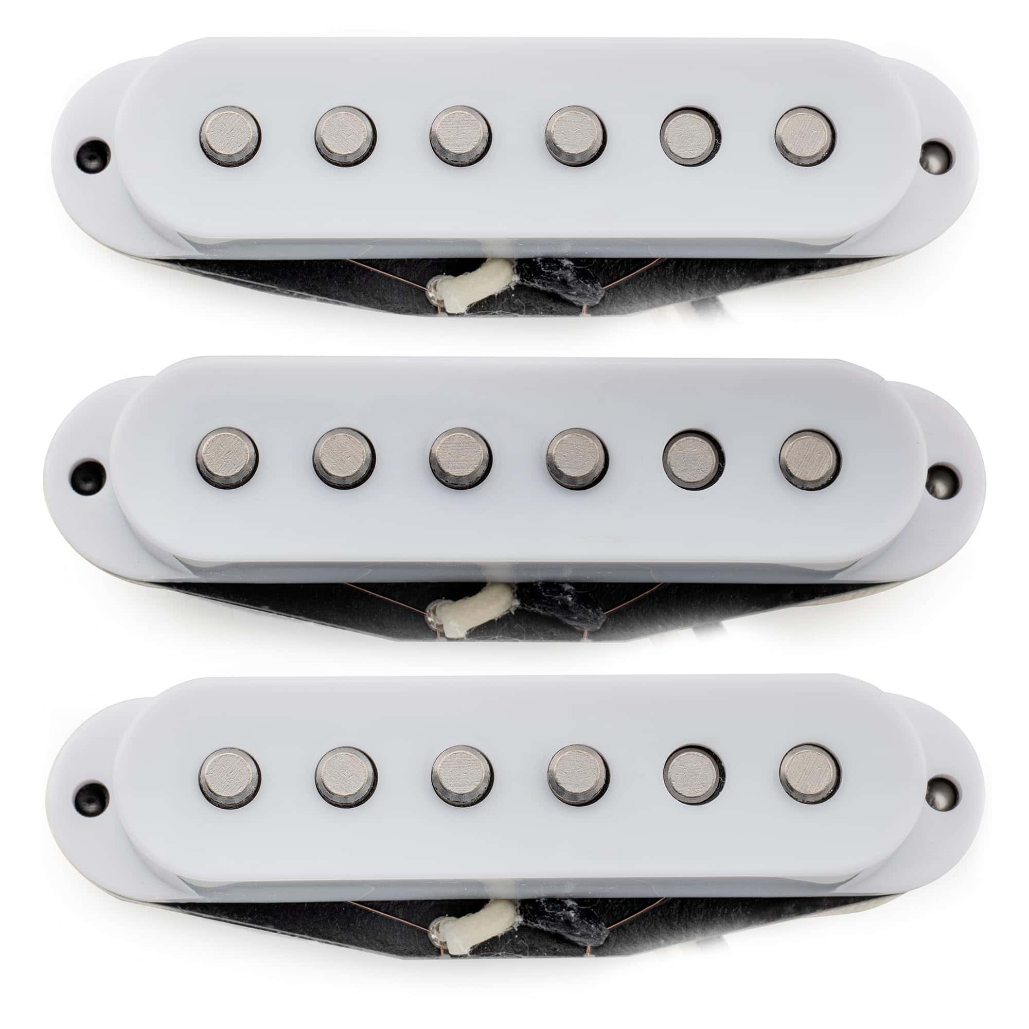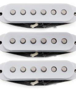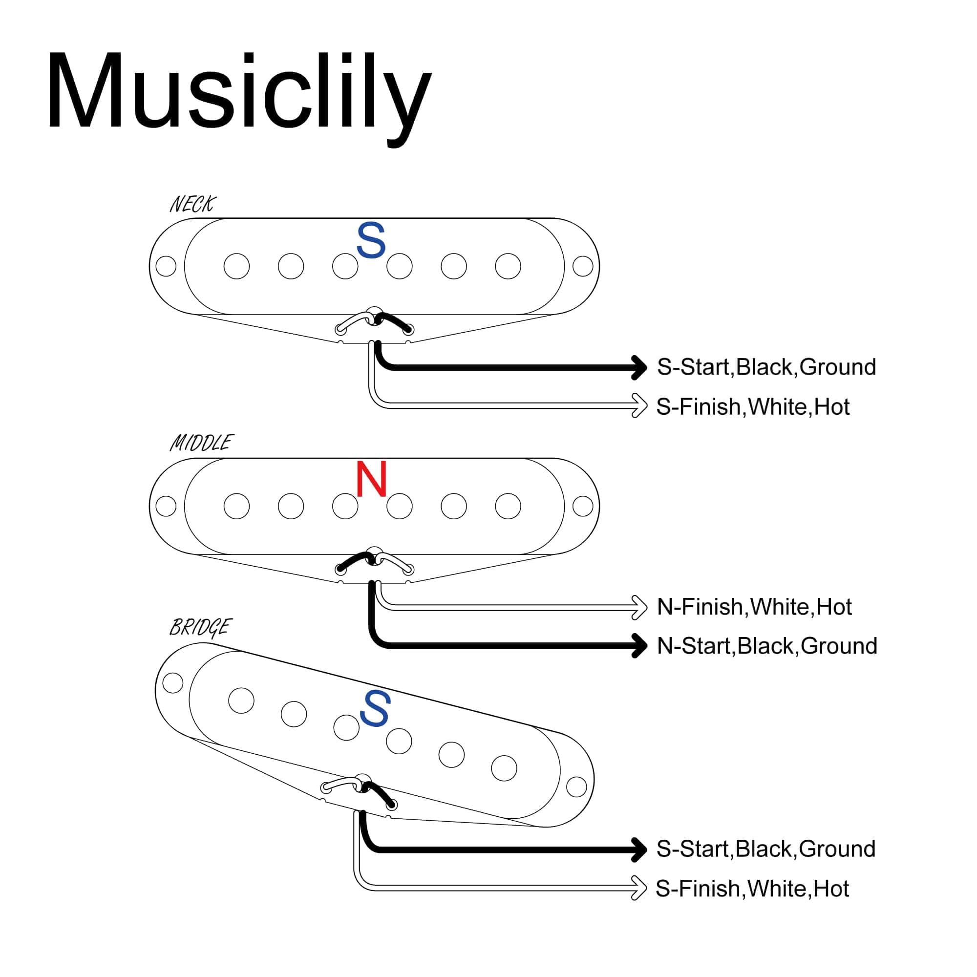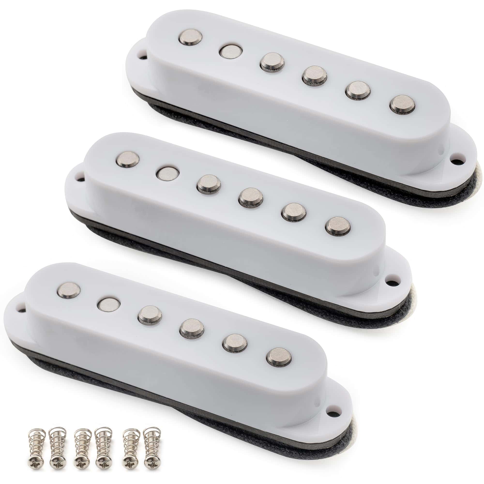 Set de Pastillas de Bobina Simple Neck Middle Bridge Musiclily Pro ST-50S Alnico 5 para Guitarra Eléctrica Estilo Strat, Blanco. Se adapta a guitarras estilo Strat, posición de mástil/centro/puente. Con imanes de Alnico 5 y polos escalonados, tonos de estilo vintage, polos escalonados para equilibrar la salida, pastilla central con polaridad reversa (RWRP), imanes Alnico 5 añaden más enfoque y dinámica mejorada, producen tonos clásicos de campana y claras mejoras armónicas, recrean auténticamente los tonos claros y el sustain mejorado que hicieron de la Strat la guitarra más venerada en la historia del rock. Espaciado de polos: mástil y centro de 50mm, puente de 52mm, distancia entre agujeros de tornillos de montaje de 76.5mm. Resistencia de 5.6K/5.9K/7K, inductancia de 2.2H/2.4H/3.2H. Imán Alnico 5, bobina y base de fibra, cableado de 2P. Incluye set de pastillas de mástil y centro y puente con accesorios de montaje. Nota: Nuestros tornillos pueden no ajustarse a su uso, use los suyos si puede.