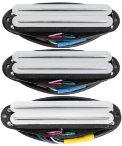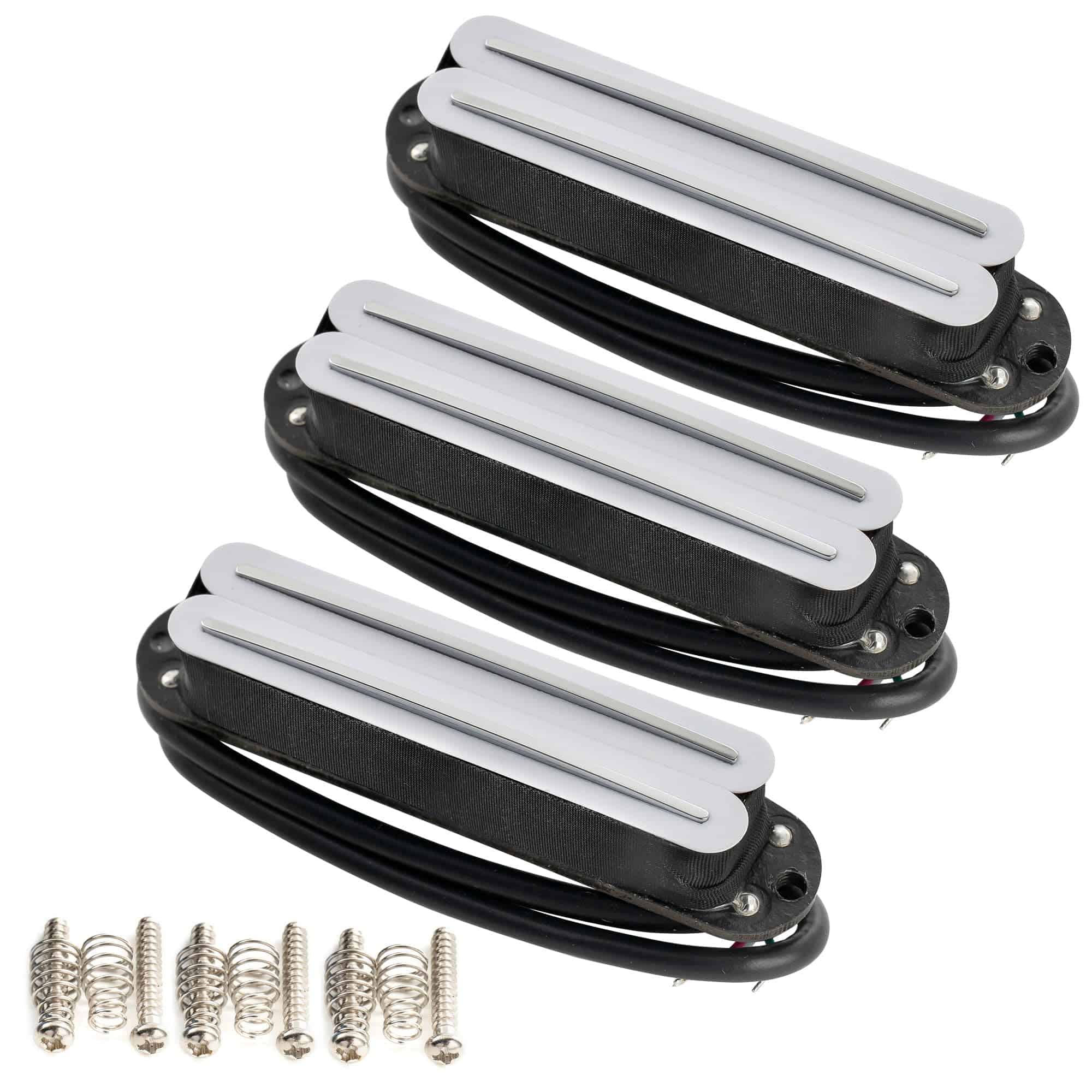 Set de pastillas de guitarra eléctrica estilo Strat con doble bobina superdistortion para mástil, centro y puente. Las pastillas cuentan con imanes Alnico 5, ofreciendo un sonido grueso y completo. Las bobinas de doble resonancia con polos dobles permiten la mejor cobertura de cuerdas y claridad, brindando un rendimiento excepcional de cancelación de ruido. La pastilla de mástil y centro ofrece una salida media de 9.2K, concentrando más potencia en los medios y bajos para un sonido más grande con más crunch, mientras que la pastilla de puente de alta salida 13.2K está diseñada para emular el famoso sonido Super Distortion, ideal para distorsión, hard rock o metal. La longitud del riel es de 60 mm (2-23/64 pulgadas) y la distancia entre agujeros de montaje es de 76.5mm (3-1/64 pulgadas). Las resistencias de las pastillas varían según la posición – mástil 9.2K, centro 9.2K, puente 13.2K -, con inductancias de 5.4H/5.4H/11.2H. El set incluye pastillas de mástil, centro y puente, así como accesorios de montaje. Nota: Nuestros tornillos pueden no adaptarse a tu uso, por favor utiliza los tuyos si puedes