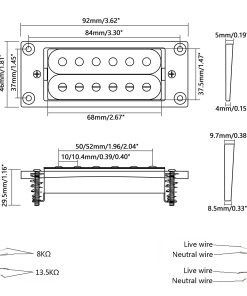 Características: 1. Esta pastilla humbucker de guitarra se ajustará a la mayoría de las guitarras como reemplazo directo. 2. Las pastillas de guitarra cuentan con piezas polares de níquel sólido. Completamente encapsuladas y selladas. 3. Par de pastillas humbucker con cara zebra abierta. 4. Con herramienta cortadora de cuerdas de guitarra 3 en 1. 5. Compatible con guitarras eléctricas que pueden instalar pastillas humbucker. Especificaciones: Nombre del Artículo: Pastilla humbucker de guitarra Material: Metal Resistencia: Mástil 8K y Puente 13.5K. Espaciado de polos de pastilla: Mástil 50 mm y Puente 52 mm Tamaño del Sacacorchos de Cuerdas: 10 12 5.5 cm Paquete incluye: 2 pastillas humbucker 1 Sacacorchos de Cuerdas 1 Destornillador