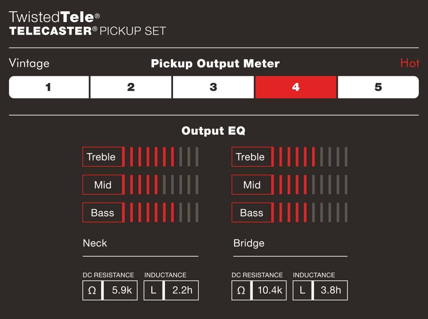 Las pastillas Twisted Tele de Fender ofrecen un tono caliente de alta salida para guitarras Telecaster con un toque del característico sonido chispeante de las guitarras Stratocaster. Cada pastilla está adaptada a su posición (mástil y puente) para lograr su carácter sonoro individual. El bobinado más alto de la pastilla del mástil está diseñado para acomodar más vueltas, combinado con un bobinado ligeramente más corto para la pastilla del puente para obtener medios oscuros y completos.