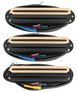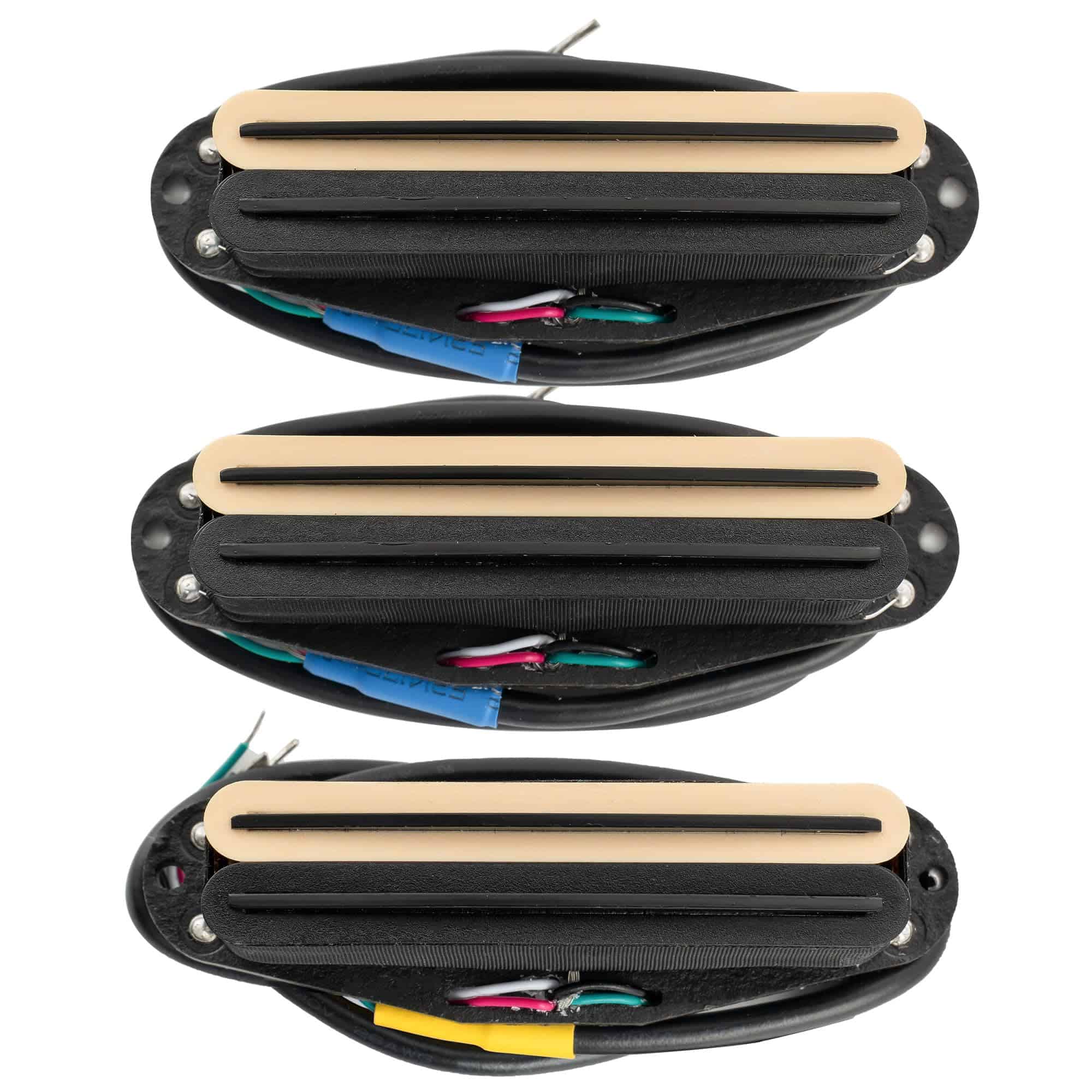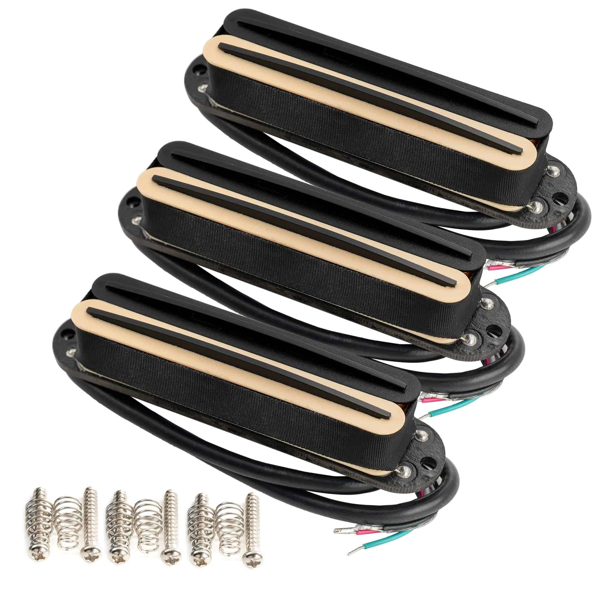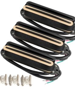 Set de pastillas Humbucker de bobina simple dual Alnico 5 Super Distortion del cuello, medio y puente para guitarra eléctrica estilo Stratocaster, cuerpo de zebra y riel negro de Musiclily Pro. Este set de pastillas ofrece un sonido grueso y completo, ideal para quienes buscan un tono potente y versátil en sus guitarras. Con imanes de Alnico 5 y bobinas de doble resonancia, estas pastillas ofrecen una cobertura de cuerdas excepcional y una claridad notable. La pastilla de cuello y medio con una salida de 9.2K es perfecta para concentrar la potencia en los medios y bajos, proporcionando un sonido más grande con mayor crunch. Mientras tanto, la pastilla de puente de alta salida de 13.2K está diseñada para emular el famoso sonido Super Distortion, ideal para estilos de música más agresivos como la distorsión, hard rock o metal. Con un diseño de rieles y un cuerpo de zebra y negro, este set de pastillas no solo ofrece un rendimiento excepcional, sino que también agrega un toque de estilo a su guitarra eléctrica.