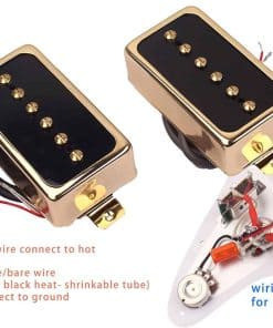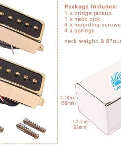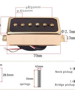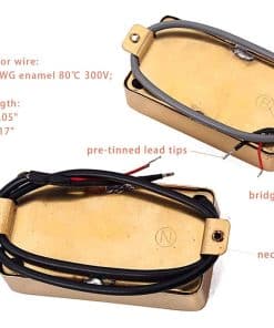 1. Imanes de Alnico V cargados tanto en la pastilla del puente como en la del cuello, carcasa de metal ayuda a reducir el zumbido; cableado esmaltado magnético de calibre 42, encerado, cableado blindado. 2. La altura de espaciado de polo de la pastilla es ajustable individualmente, el espaciado de polos de la pastilla del puente es de 50 mm / del cuello es de 48 mm. 3. Especificación de resistencia de CC del cable de doble conductor (extremo pre-estañado): 2547 26 AWG esmalte 80 300V; longitud del cable del puente – 9.05″ / cuello – 14.17″; la resistencia de CC de la pastilla es solo de referencia. 4. Pastillas de Tono P90 de Single Coil de tamaño Estándar Humbucker, Ampliamente Compatibles con un sonido suave y rico, como un buen juego de repuesto o para nuevas construcciones en una guitarra con cavidad de pastilla de tamaño humbucker. 5. El paquete incluye 1 x pastilla del puente y 1 x pastilla del cuello, 4 x resortes para ajustar la altura de los polos y 4 x tornillos de montaje