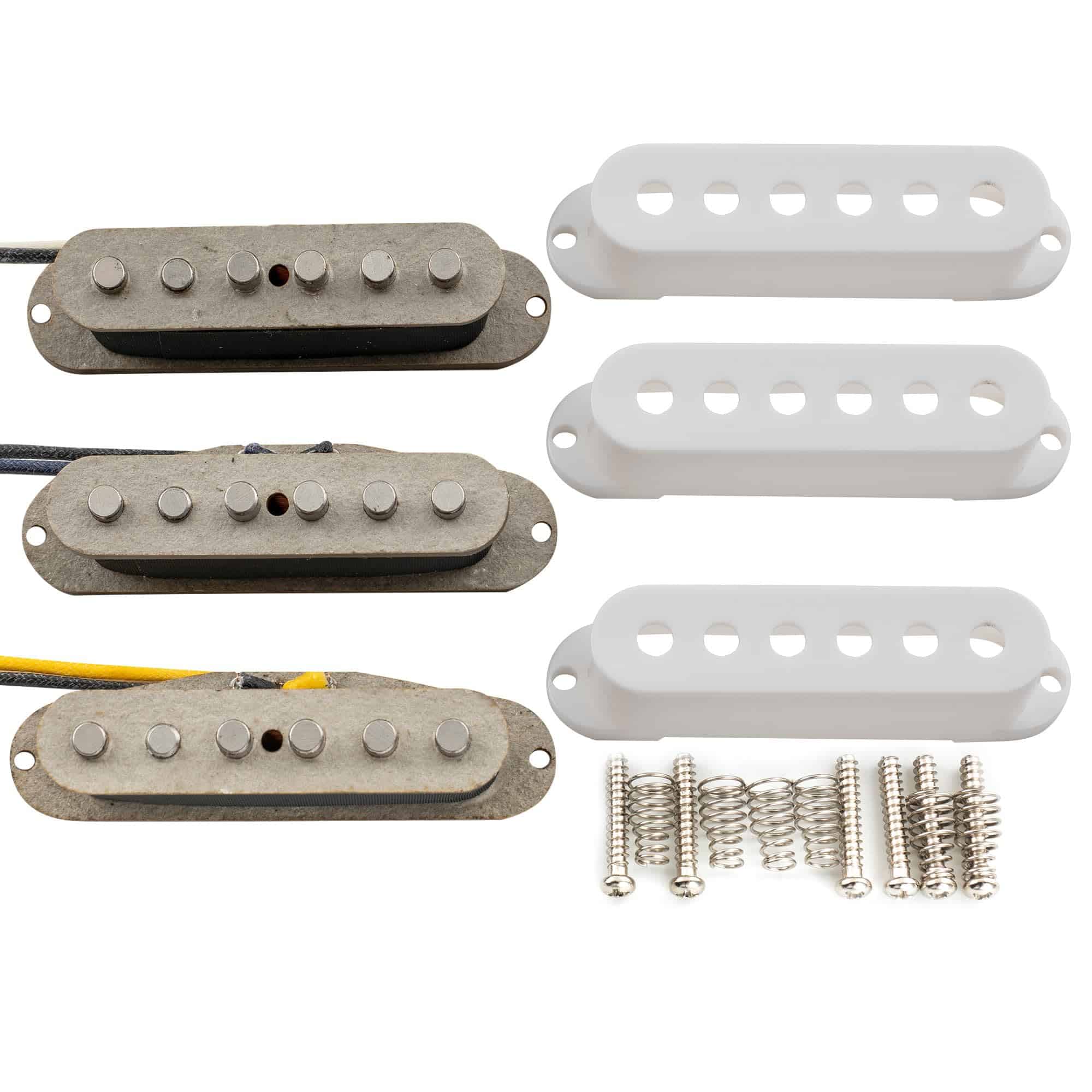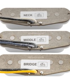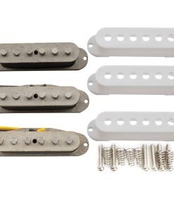Set de pastillas Musiclily Pro con imán Alnico 5 escalonadas de bobina simple para mástil, medio y puente de guitarra eléctrica estilo Strat, blancas. Las pastillas ofrecen tonos vintage, con piezas de polo escalonadas para equilibrio en la salida, pastilla media de bobinado y polaridad inversa para cancelación de ruido, y producen agudos claros y graves potentes que funcionan bien con pedales. Recomendadas para estilos musicales como Blues, Rock y Rock Clásico. El paquete incluye set de pastillas y accesorios de montaje. Tenga en cuenta que nuestros tornillos pueden no adaptarse a su uso, por favor utilice los suyos si es posible.