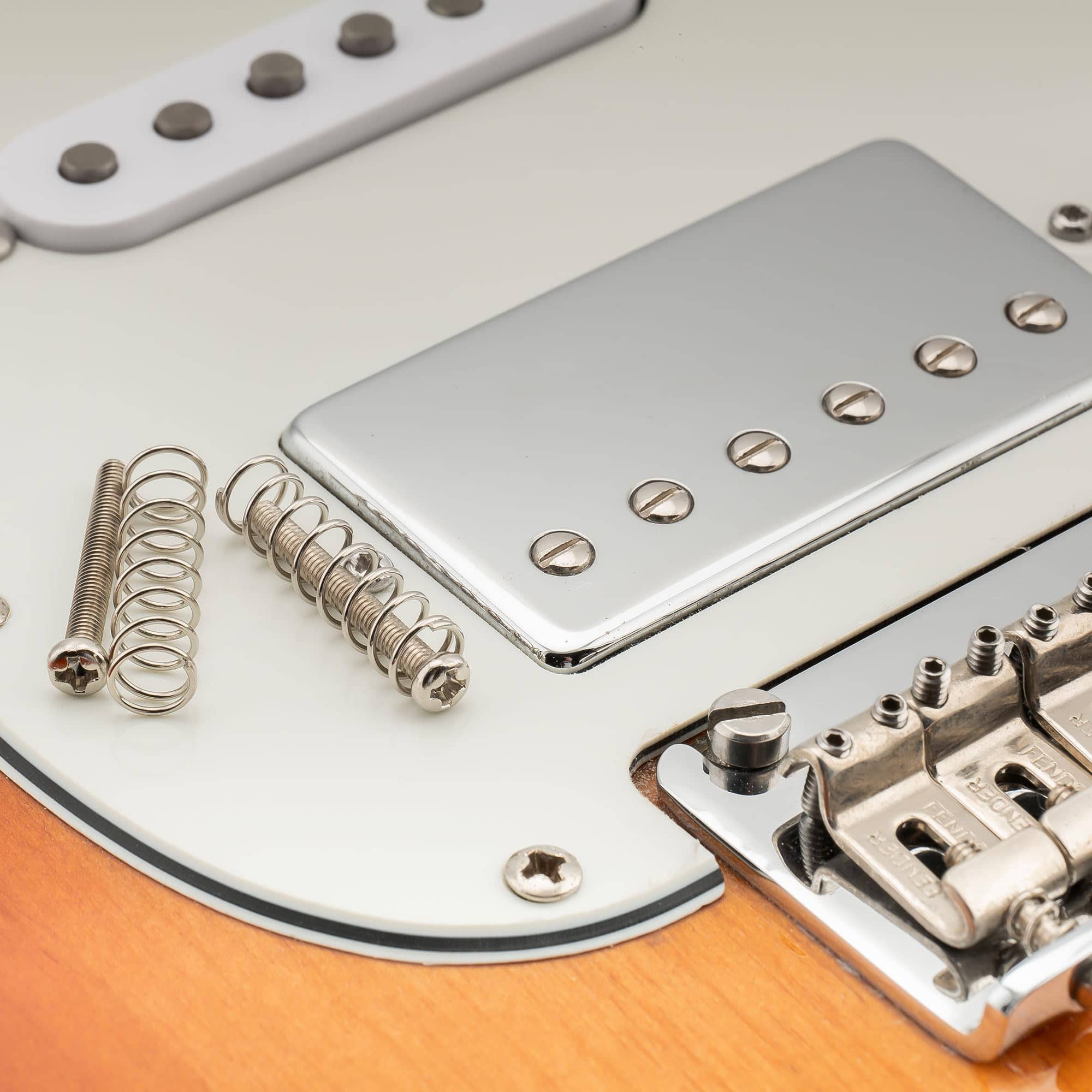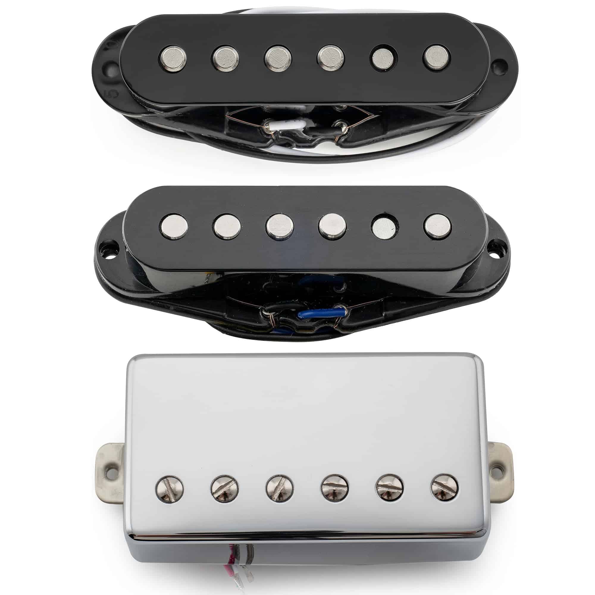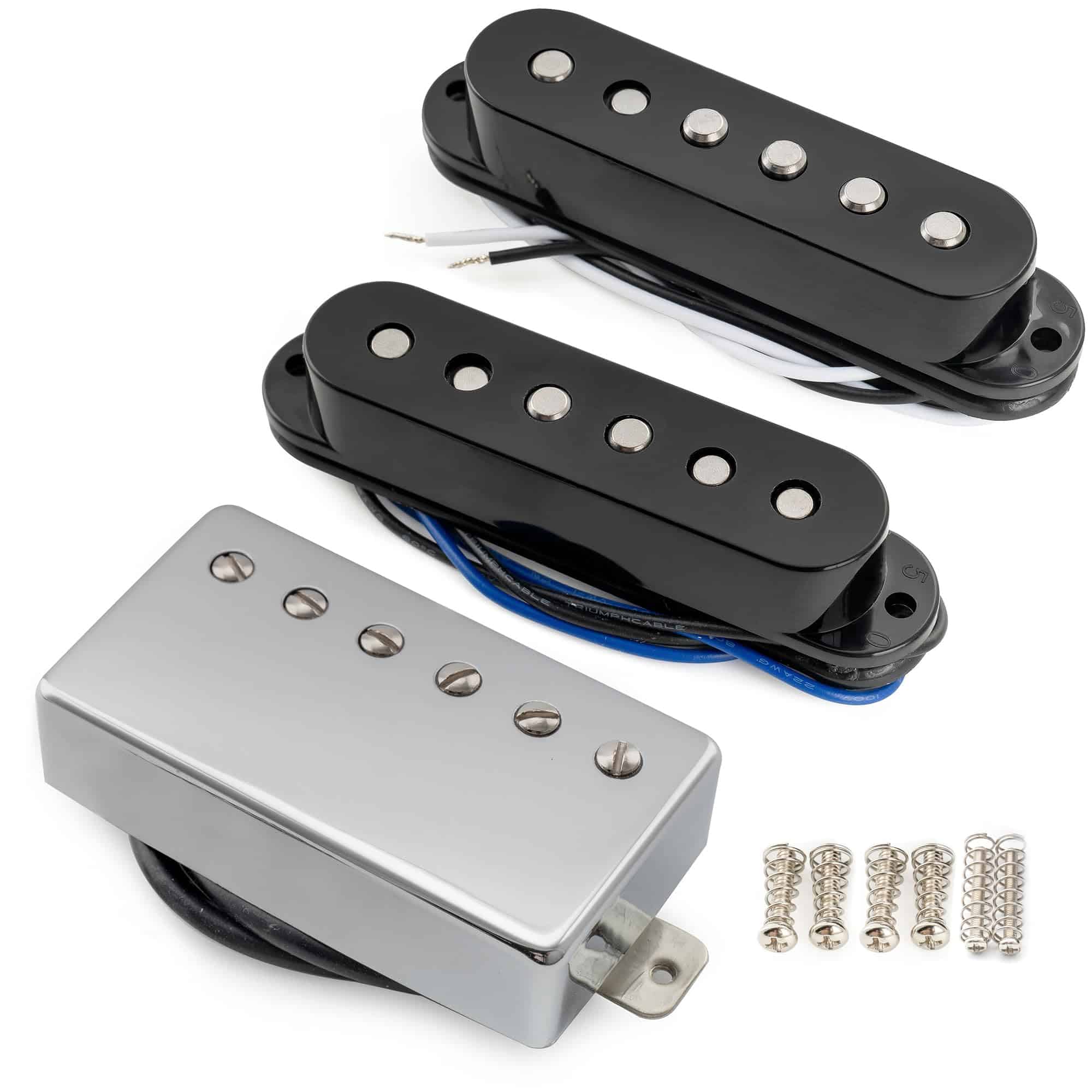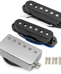 Set de Pastillas Musiclily Pro ST-60SE Alnico 5 Staggered Single Coil y Covered Humbucker ST-HSS Neck Middle Bridge para Guitarra Eléctrica Estilo Strat, Negro. Este set de pastillas está diseñado para guitarras eléctricas estilo Strat ST-HSS y ofrece tonos vintage y versátiles. Las pastillas de mástil y centro cuentan con imanes de Alnico 5 escalonados para una salida equilibrada, mientras que la pastilla de puente cubierta de 8.8K humbucker proporciona un sonido potente y cálido. Con polos escalonados y una pastilla central con polaridad invertida para cancelación de ruido, este set es ideal para una variedad de estilos musicales. El espaciado de los polos y los agujeros de montaje se adaptan perfectamente a guitarras Strat ST-HSS. Fabricadas con materiales de alta calidad, estas pastillas ofrecen un excelente rendimiento y durabilidad. El paquete incluye el set completo de pastillas y accesorios de montaje para una fácil instalación.