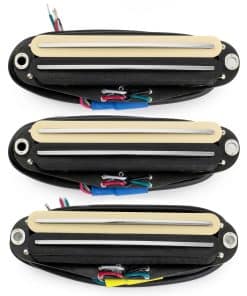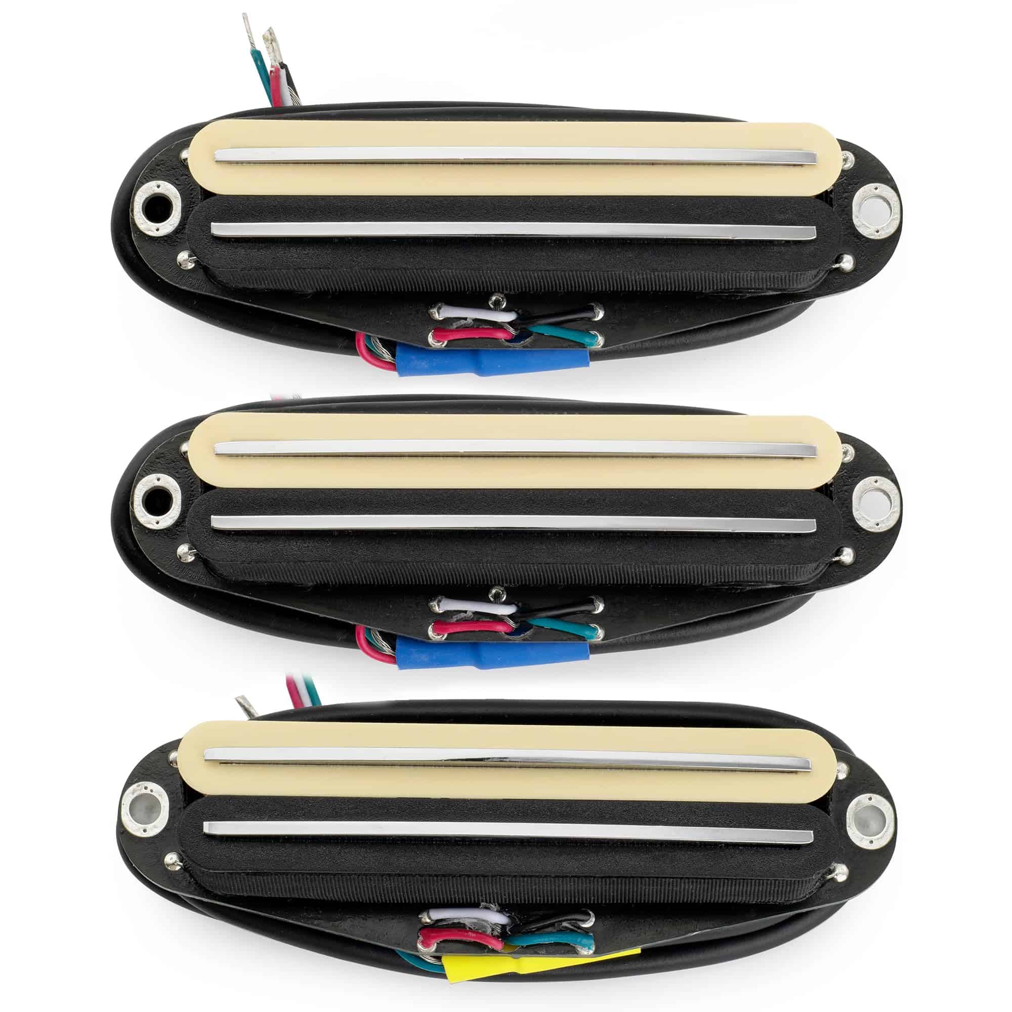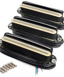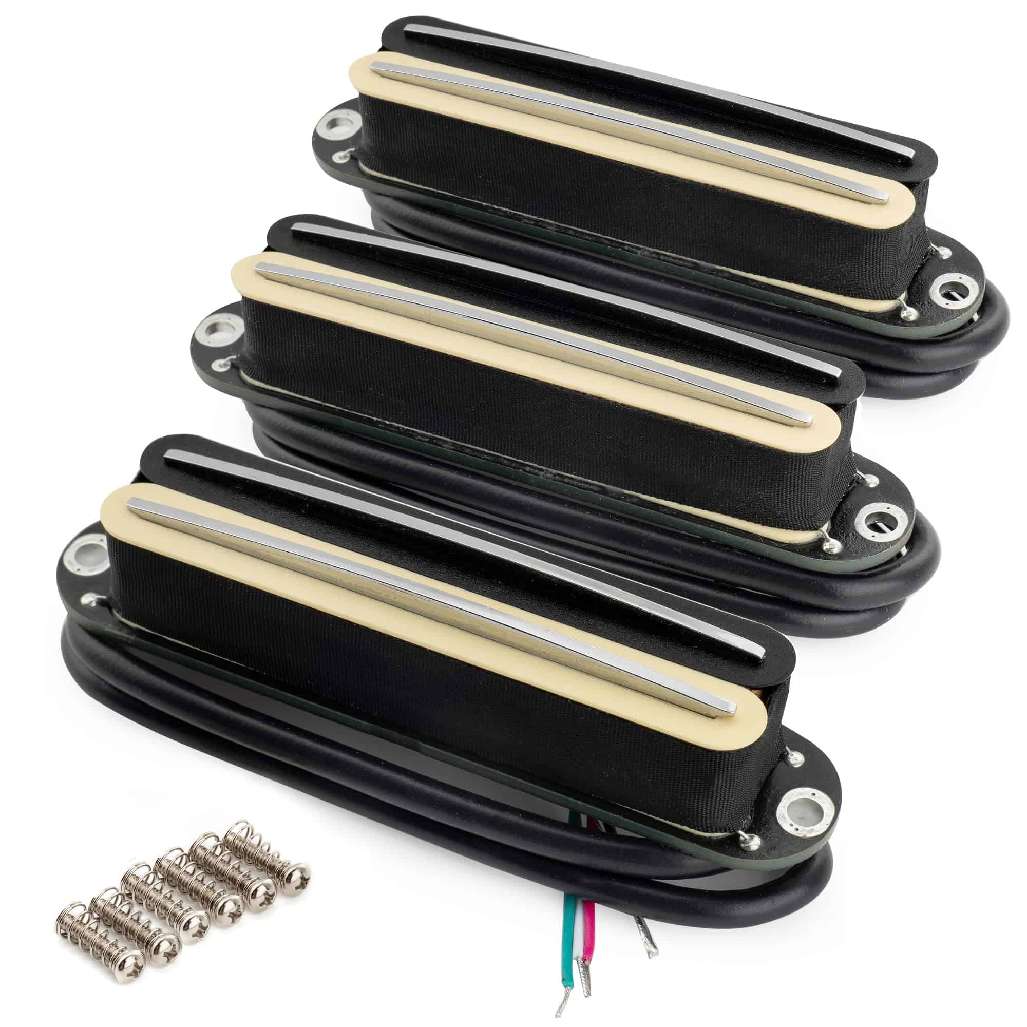 Set de pastillas Musiclily Pro ST-DPHC Ceramic Rail Blade Single Coil Sized Humbucker Super Distortion para guitarra eléctrica estilo Strat, cuerpo Zebra con rieles cromados. Se adapta a guitarras eléctricas estilo Strat, posición de mástil/centro/puente. Humbucker de cuchilla tipo riel de tamaño de bobina simple, con imanes cerámicos, que suenan claros y brillantes. Bobinas de doble resonancia con polos gemelos permiten la mejor cobertura y claridad de cuerdas, brindando un rendimiento de cancelación de zumbido excepcional. Salida media de mástil y centro de 9.2K, con más potencia concentrada en los medios y graves para un sonido más potente con más definición; puente de alta salida de 13.2K, diseñado para emular el famoso sonido Super Distortion, ideal para distorsión, hard rock o metal. Longitud del riel: 60mm (2-23/64 pulgadas), distancia entre agujeros de tornillo de montaje: 76.5mm (3-1/64 pulgadas). Resistencia (mástil/centro/puente): 9.2K/9.2K/13.2K, inductancia (mástil/centro/puente): 4.9H/4.9H/9.0H. Tolerancia: 0.5K para bobina simple, 1K para humbucker. El valor de resistencia cambiará según la temperatura y humedad. Por lo general, el valor de resistencia será alto en clima caliente y seco, y bajo en clima frío y húmedo. En casos extremos, la tolerancia del valor de resistencia será mayor. Imán: cerámica; bobina PC; base de PCB, cableado: 4P Shield. El paquete incluye: set de pastillas de mástil y centro y puente y accesorios de montaje. Nota: Nuestros tornillos pueden que no se adapten a su uso, por favor use los suyos si puede
