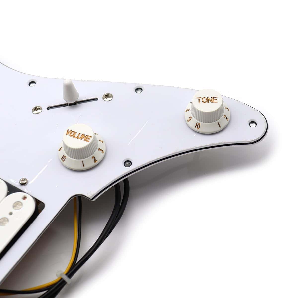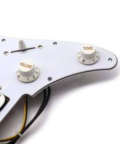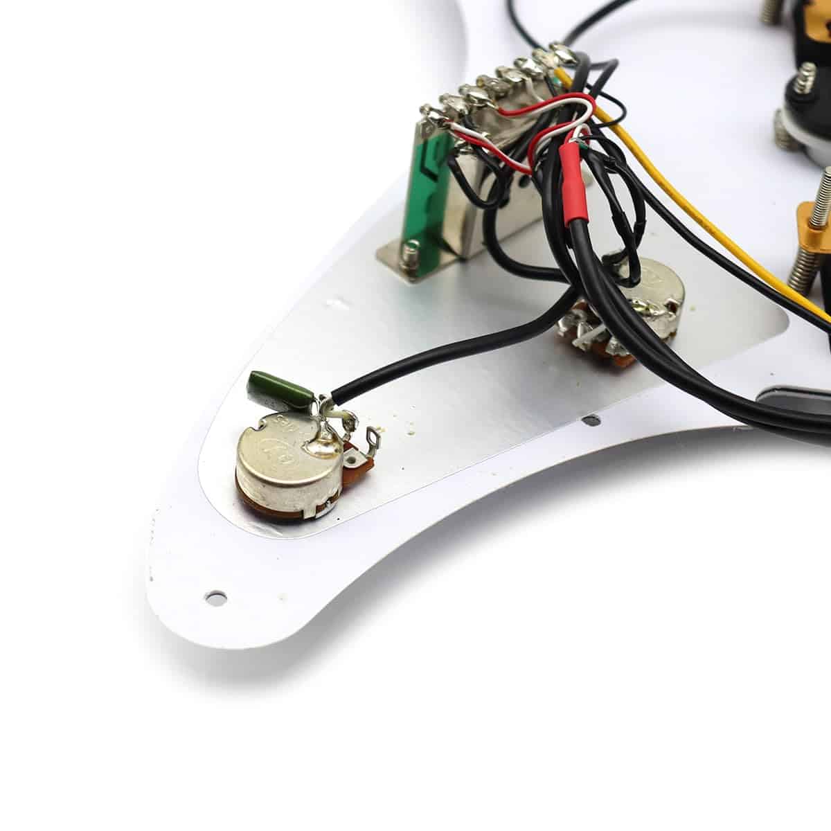 Set de pickguard cargado de 3 capas blanco/negro/blanco con 10 agujeros de montaje cargado con 2 pastillas humbuckers y una pastilla simple en configuración H-S-H. Este pickguard cargado es COMPLETO. 1 pastilla simple, con polo empotrado y tapa de imán cerámico. 2 pastillas humbuckers con polos empotrados, con respaldo de latón. Arnés de cableado (potenciómetros CF 500K – 1 volumen, 1 tono – capacitor, interruptor de 5 posiciones) y perillas. Material: ABS, cobre. No puedo garantizar que los agujeros de tornillo se alineen con los de su guitarra dada la gran variedad de modelos en el mercado. Es una excelente manera de ahorrar dinero y acelerar la finalización de su guitarra de cuerpo sólido, solo necesita unos minutos para conectar los cables a su jack de salida y a tierra de su puente de guitarra. Color: Negro. Material: ABS, cobre. Tamaño: Como se muestra en la imagen. El paquete incluye: 1 x Set de Pickguard Cargado.
