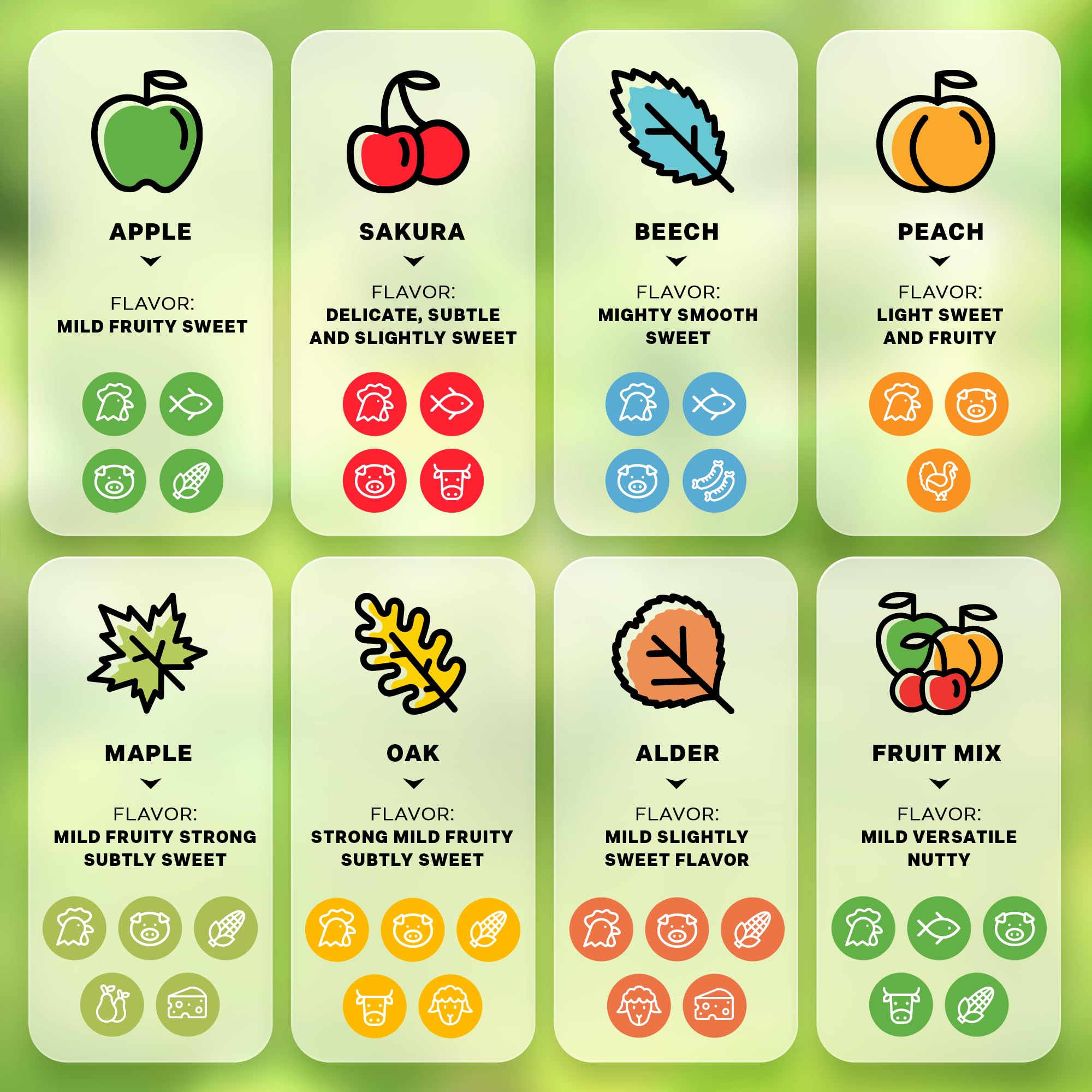 1. Pellets para ahumar para parrilla Este set incluye pellets de madera de cerezo, roble, aliso y manzana para ahumar, proporcionando sabores ricos y ahumados perfectos para cocinar a la parrilla o ahumar tus carnes y verduras favoritas.
