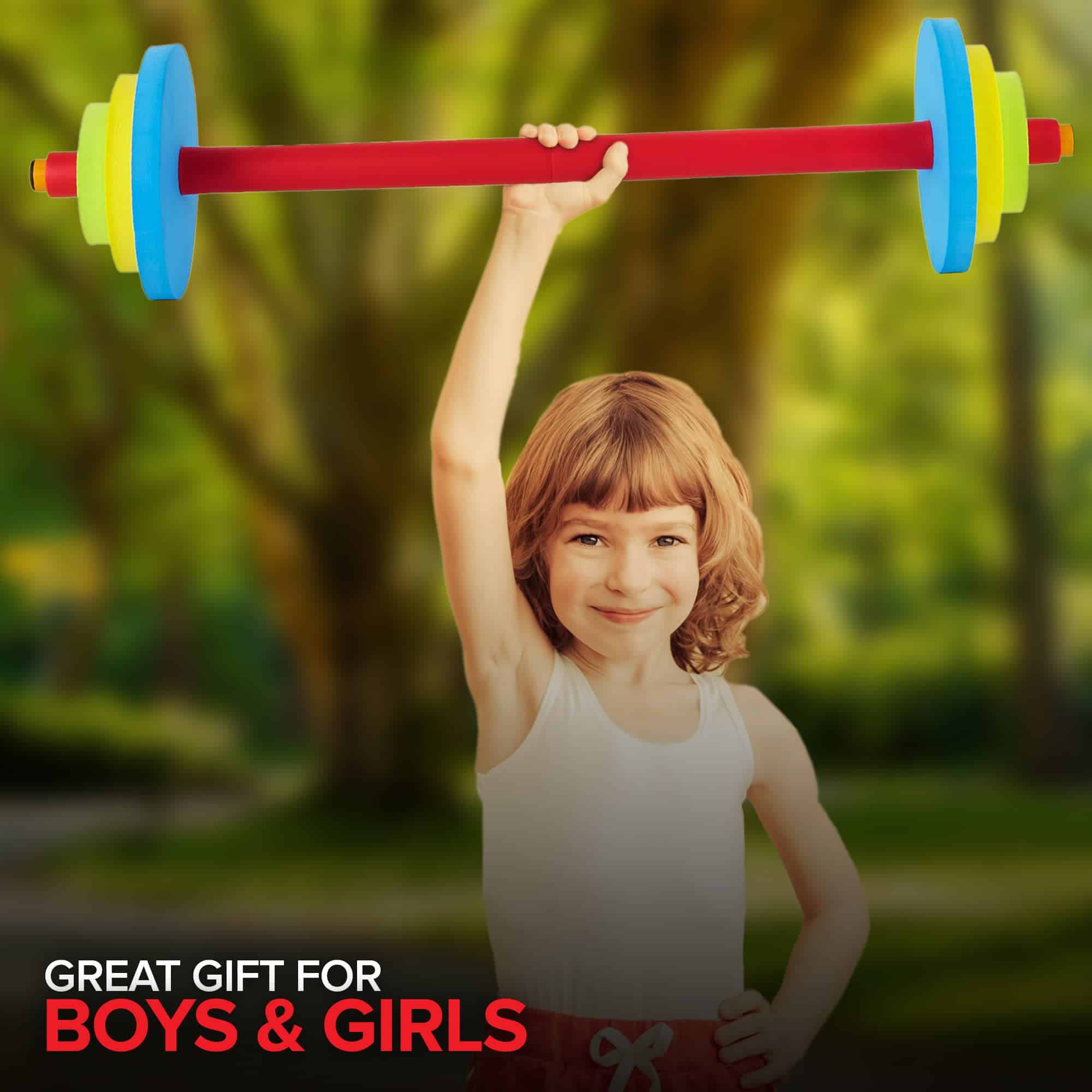 4. Fácil de armar: Todo lo que tienes que hacer es deslizar un disco negro grande en cada lado de la barra. Luego desliza el disco gris de tamaño mediano y finalmente el disco gris pequeño. Repite en el otro lado. Nuestras pesas son excelentes regalos para niños y niñas.