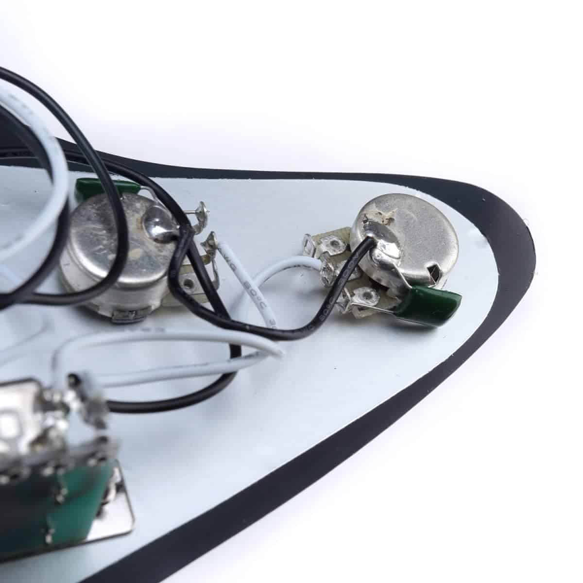 Set de Pickguard precableado SSS de Musiclily Pro con set de pastillas para Fender Stratocaster Strat ST Guitarra eléctrica, 3 capas de negro. Se adapta a guitarras de estilo Squier Strat SSS u otras importadas similares, también se adapta a la mayoría de las guitarras eléctricas Strat SSS de estilo moderno estándar americano/mexicano. Pickguard estándar ST americano con 11 agujeros de tornillo de montaje, rutina de pastillas SSS con set de pastillas de cerámica de imán, proporciona un sonido potente de rango medio. Incluye cuello 5.5K 3.4H, medio en sentido inverso 5.5K 3.4H, puente 6.0K 4.0H con polos planos de pastilla y potentes imanes de cerámica. Viene con perillas de plástico, punta de interruptor y cubiertas de pastillas, junto con tornillos de pickguard para una instalación fácil. El paquete incluye un pickguard precableado con pastillas (Cuello/Medio/Puente), imanes de cerámica, espaciado de polo de 50mm/50mm/52mm, potenciómetros A250K(T) x 2 + B250K(V), interruptor de 5 posiciones de estilo importado, condensador de .033uF y cables de PVC.