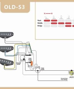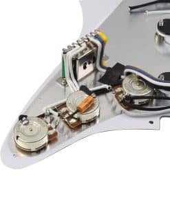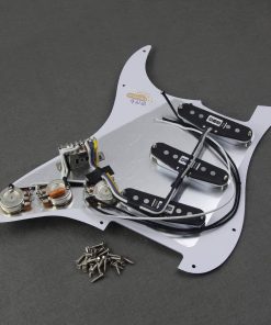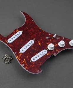 Set de pickguard Strat precableado que se ajusta a guitarras Fender Stratocaster estándar modernas de fabricación estadounidense/mexicana. Incluye pickguard de 1 capa de celuloide y 3 capas de PVC (color rojo concha de tortuga) con 11 agujeros de tornillo, 3 agujeros para pastillas de bobina simple. Pastillas de bobina simple Alnico 5 escalonada con bobina de fibra vulcanizada; espaciado de polos: 50/50/52mm (N/M/B); Resistencia: N-5.8K, M-5.9K, B-6.9K. Cables trenzados de tela AWG44 (cables de empuje), perillas de control 2T1V, 2 potenciómetros A250k para tono, 1 potenciómetro B250k para volumen. Interruptor de 5 posiciones y condensador MKP 223J 400V. Incluye juego completo de pastillas, interruptor, perillas y circuito precableado, todo lo que tiene que hacer es soldar el jack de entrada y está listo para tocar.
