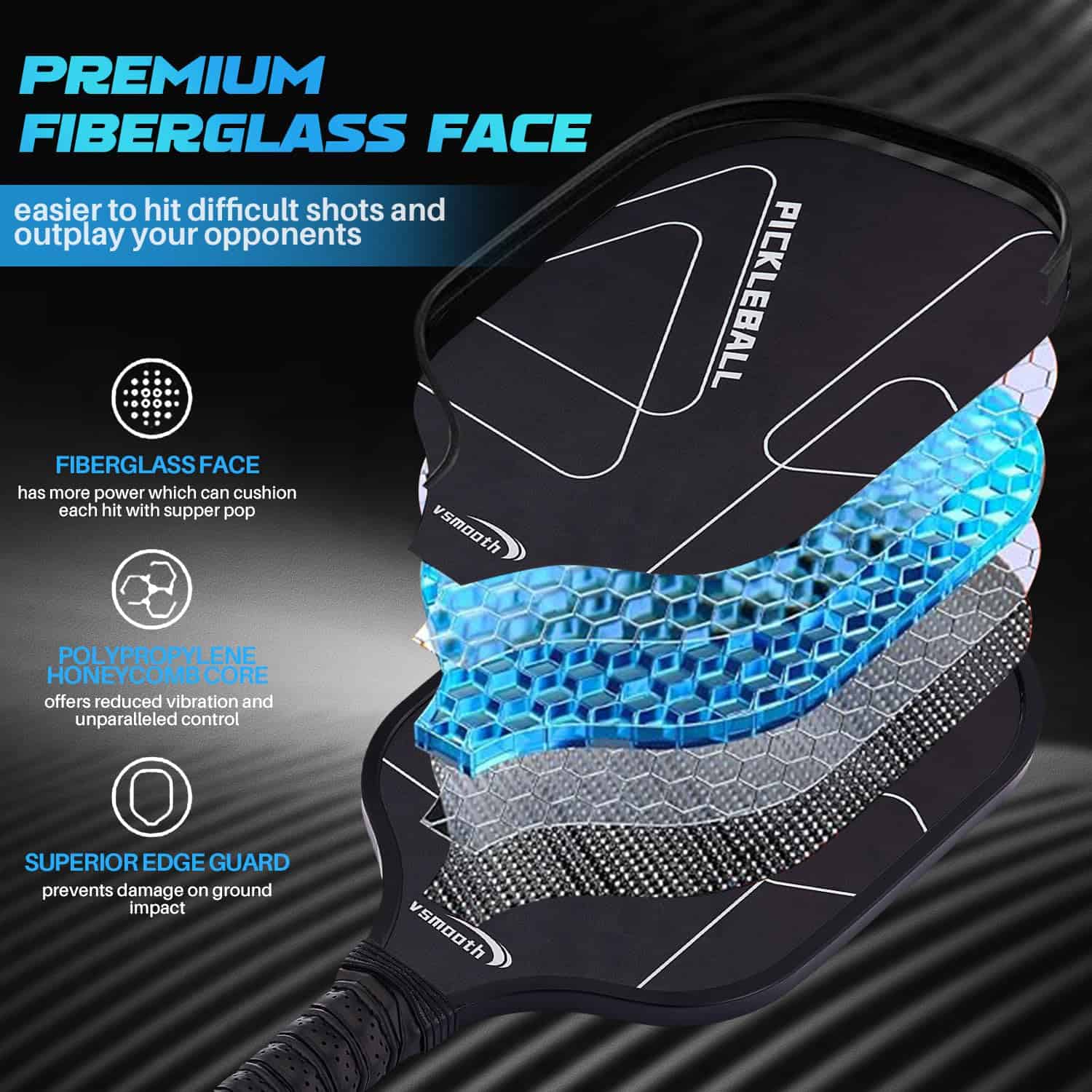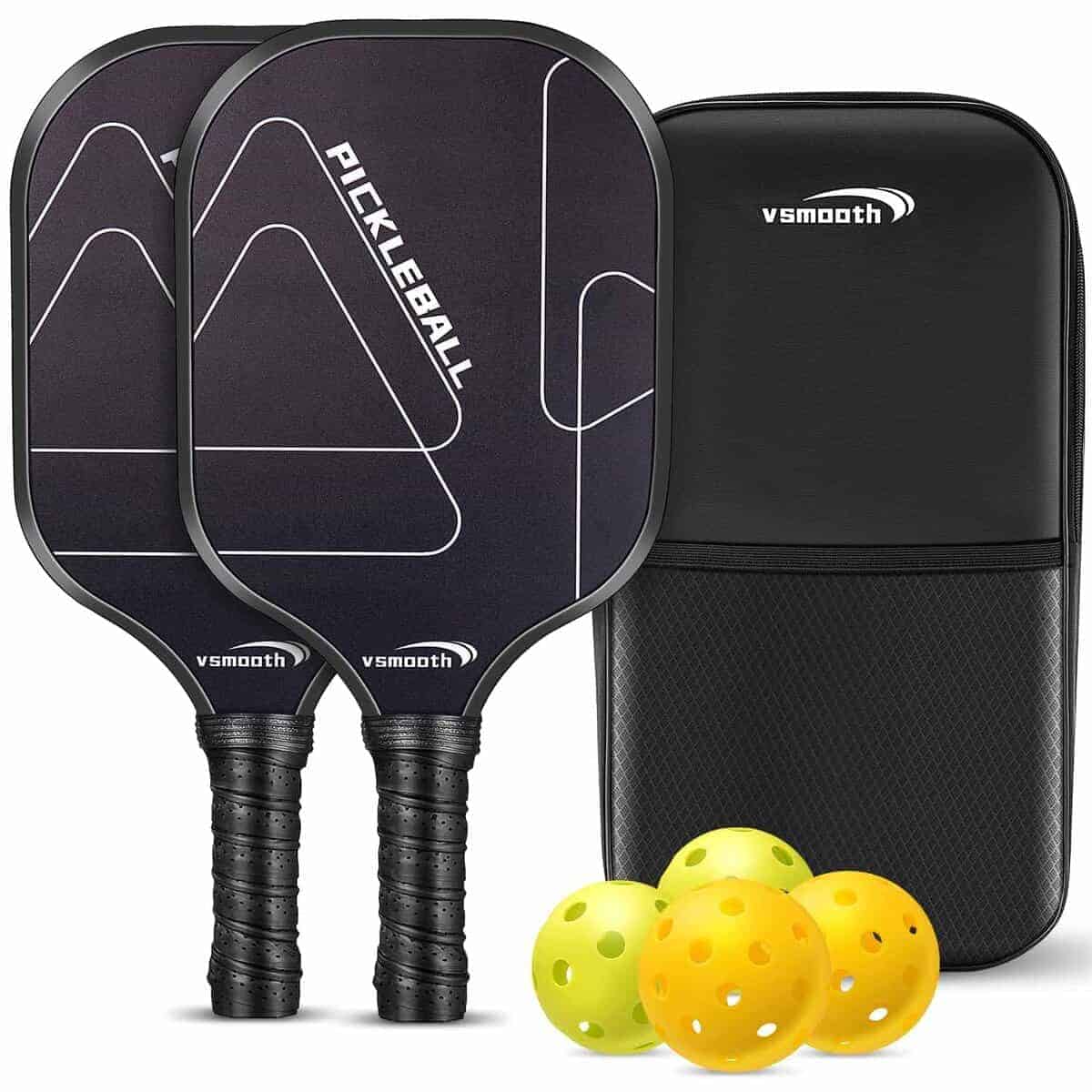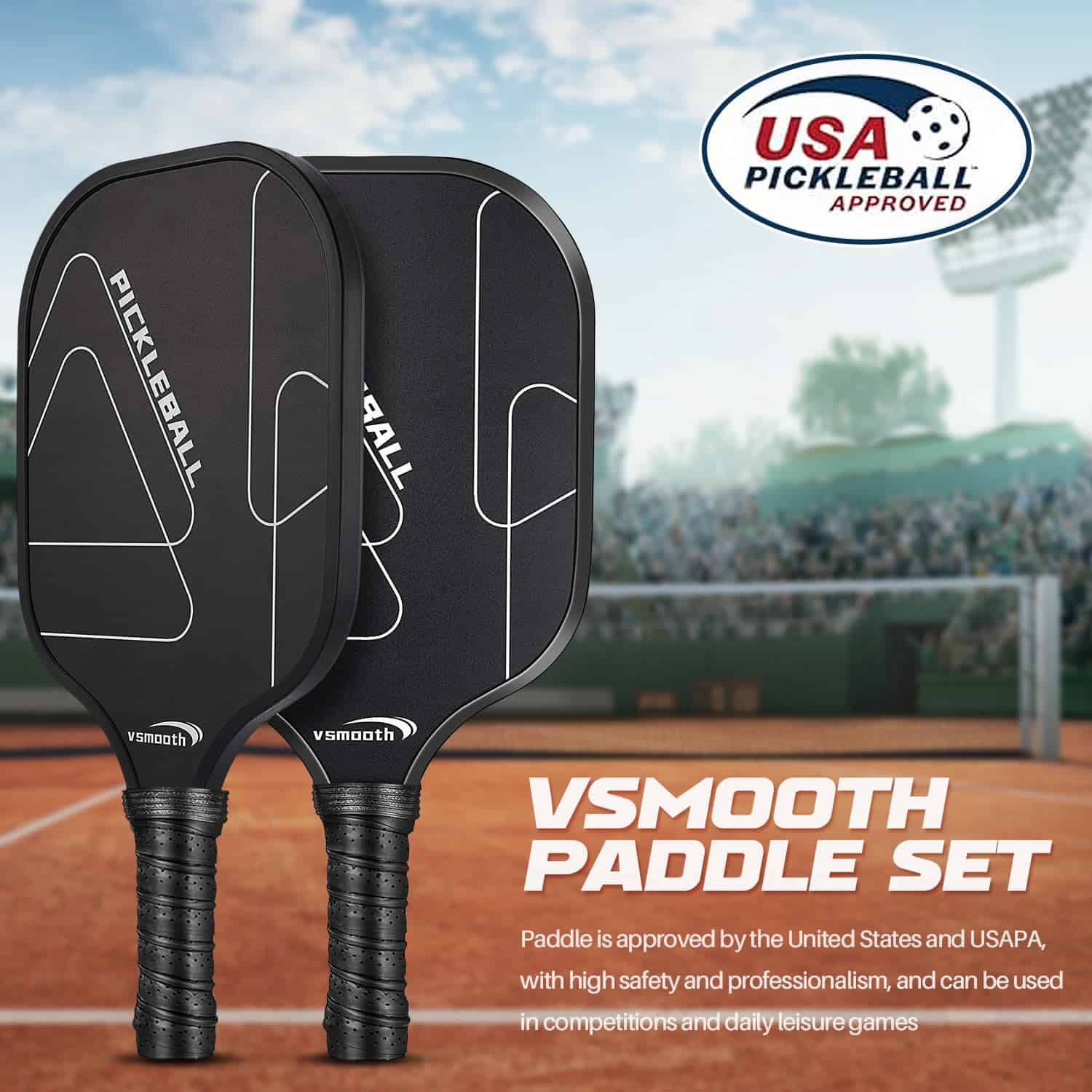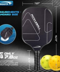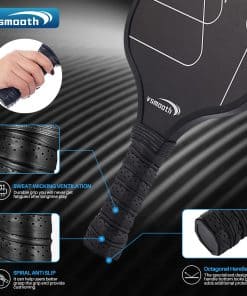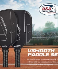 Pala de Pickleball Profesional Vsmooth adopta el último diseño y tecnología de pala, combinando la excelente tecnología de desarrollo tradicional de Vsmooth con el último diseño de pala, logrando una combinación perfecta de alto rendimiento, comodidad, equilibrio y ligereza. Material Potenciador de Potencia La característica de Vsmooth es un panel multicapa que combina la potencia de la tecnología de núcleo de panal de polipropileno y el control del acabado de fibra de vidrio. A diferencia de algunas palas de madera o compuestas, nuestras palas de pickup de fibra de vidrio pueden soportar múltiples usos e impactos, asegurando la durabilidad de todos tus juegos. Contenido del Paquete: 2 Palas de Pickleball 4 Pelotas de Pickleball para Exteriores 1 Bolsa de Transporte Especificaciones: 1. Material: fibra de vidrio 2. Tamaño: longitud del agarre 5.12″