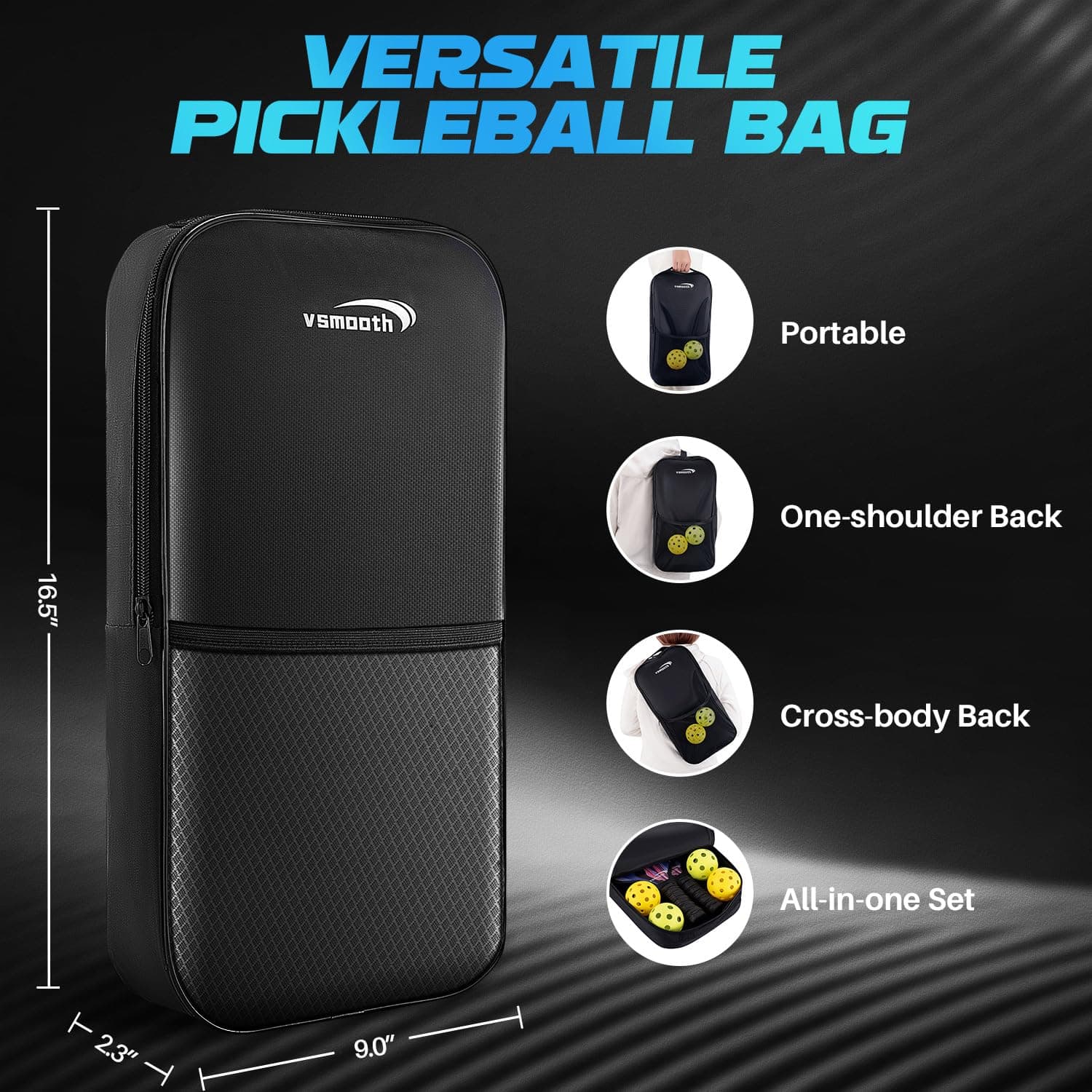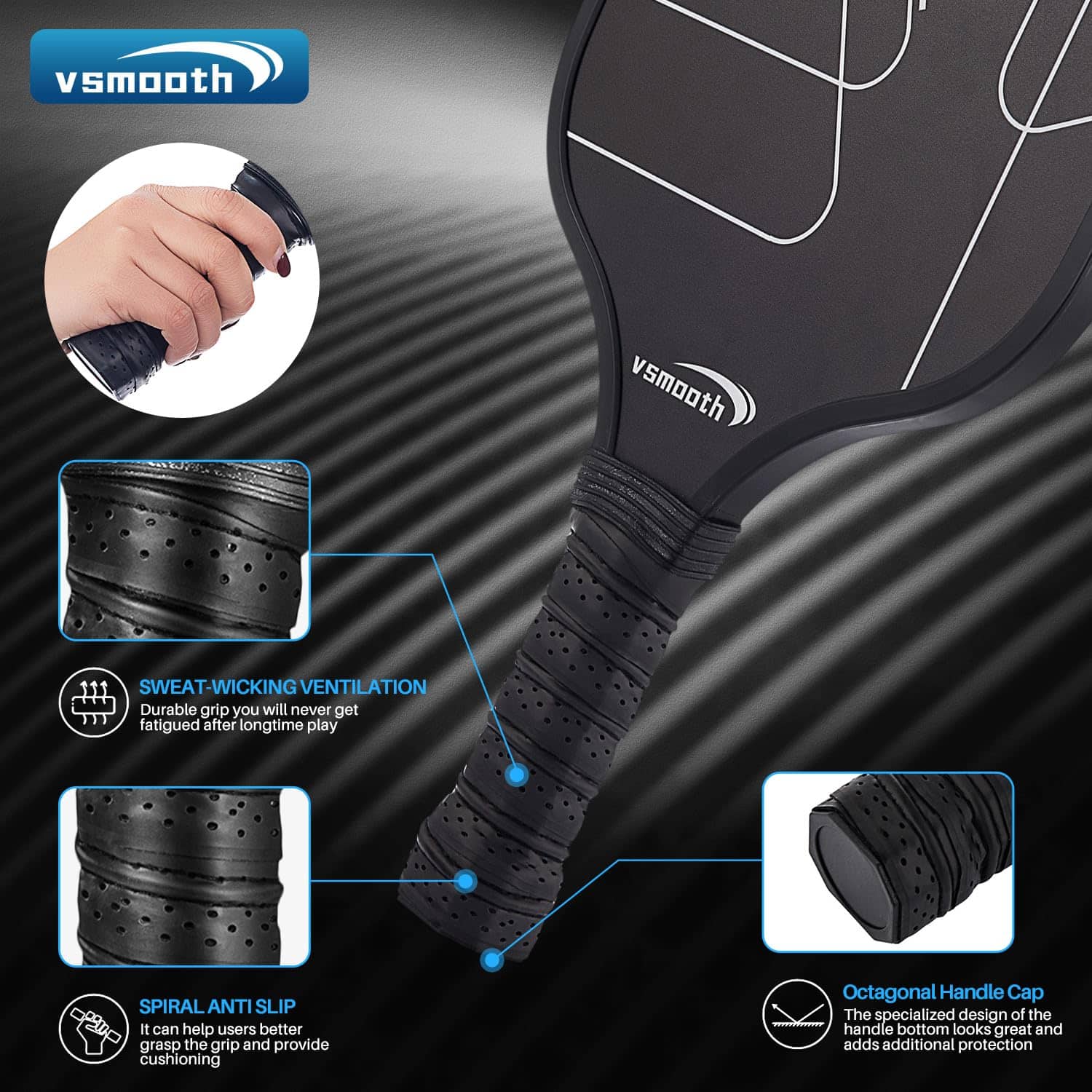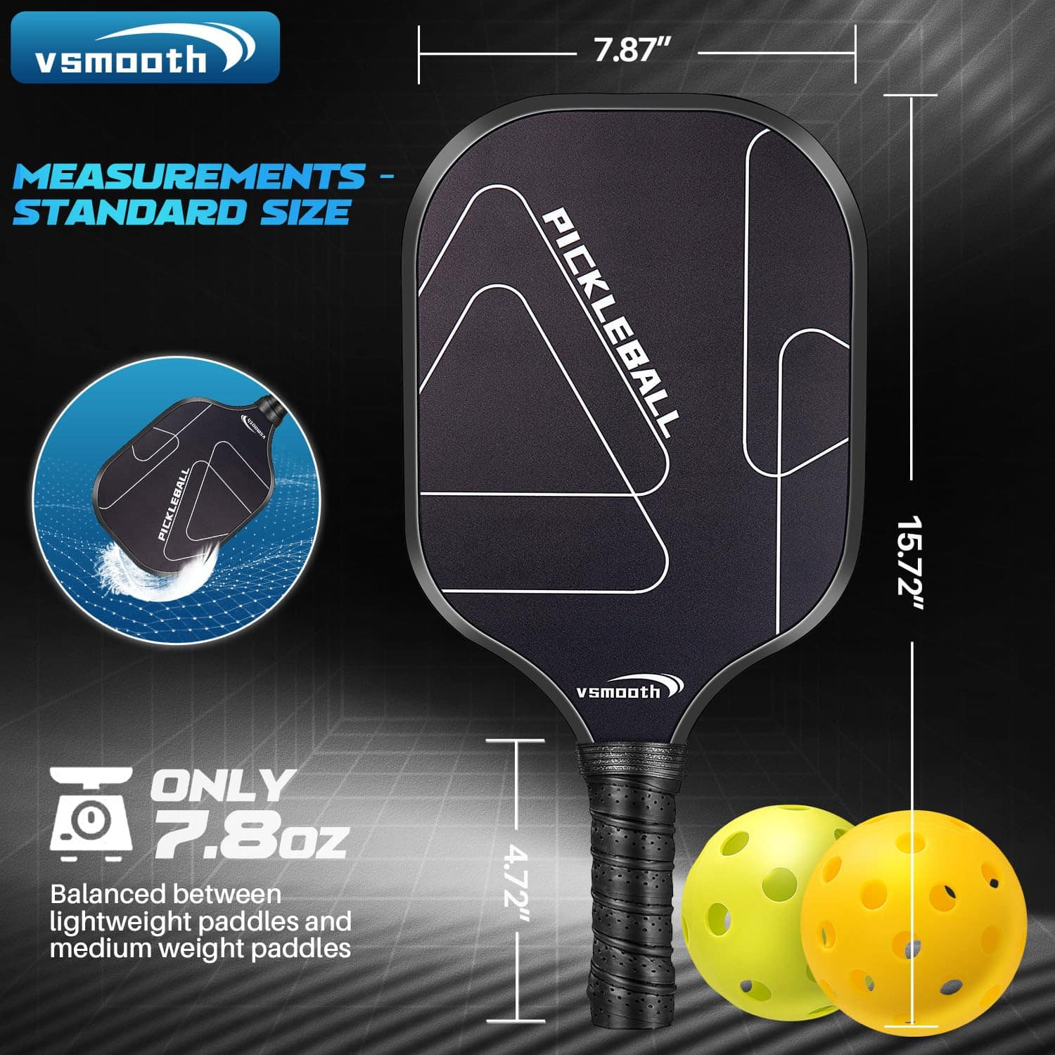 Pala de Pickleball Profesional Vsmooth adopta el último diseño y tecnología de pala, combinando la excelente tecnología de desarrollo tradicional de Vsmooth con el último diseño de pala, logrando una combinación perfecta de alto rendimiento, comodidad, equilibrio y ligereza. Material Potenciador de Potencia La característica de Vsmooth es un panel multicapa que combina la potencia de la tecnología de núcleo de panal de polipropileno y el control del acabado de fibra de vidrio. A diferencia de algunas palas de madera o compuestas, nuestras palas de pickup de fibra de vidrio pueden soportar múltiples usos e impactos, asegurando la durabilidad de todos tus juegos. Contenido del Paquete: 2 Palas de Pickleball 4 Pelotas de Pickleball para Exteriores 1 Bolsa de Transporte Especificaciones: 1. Material: fibra de vidrio 2. Tamaño: longitud del agarre 5.12″
