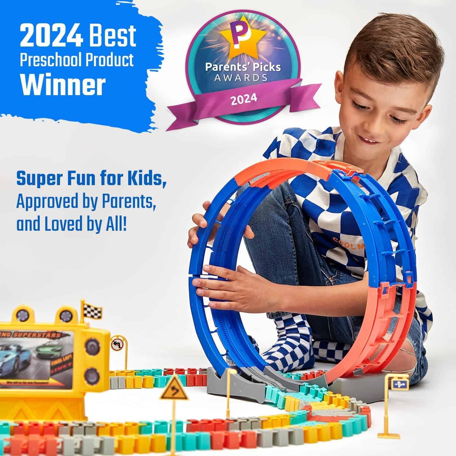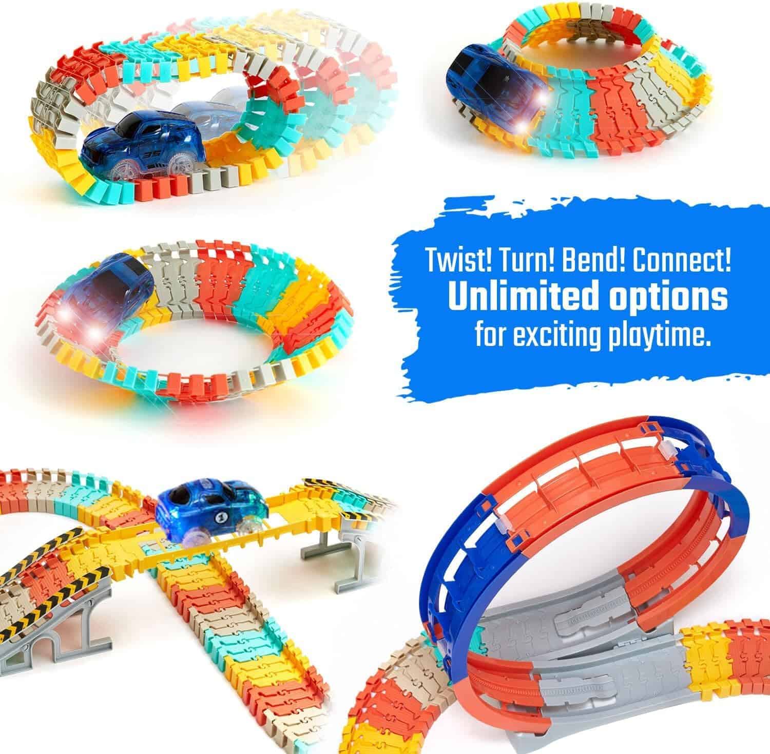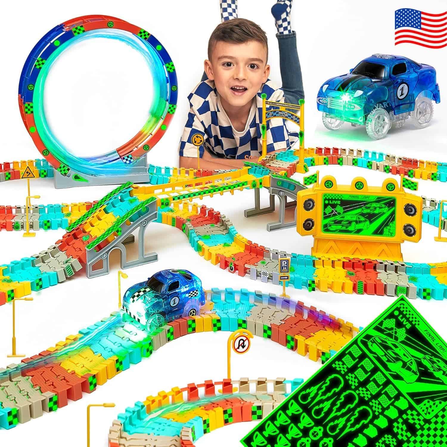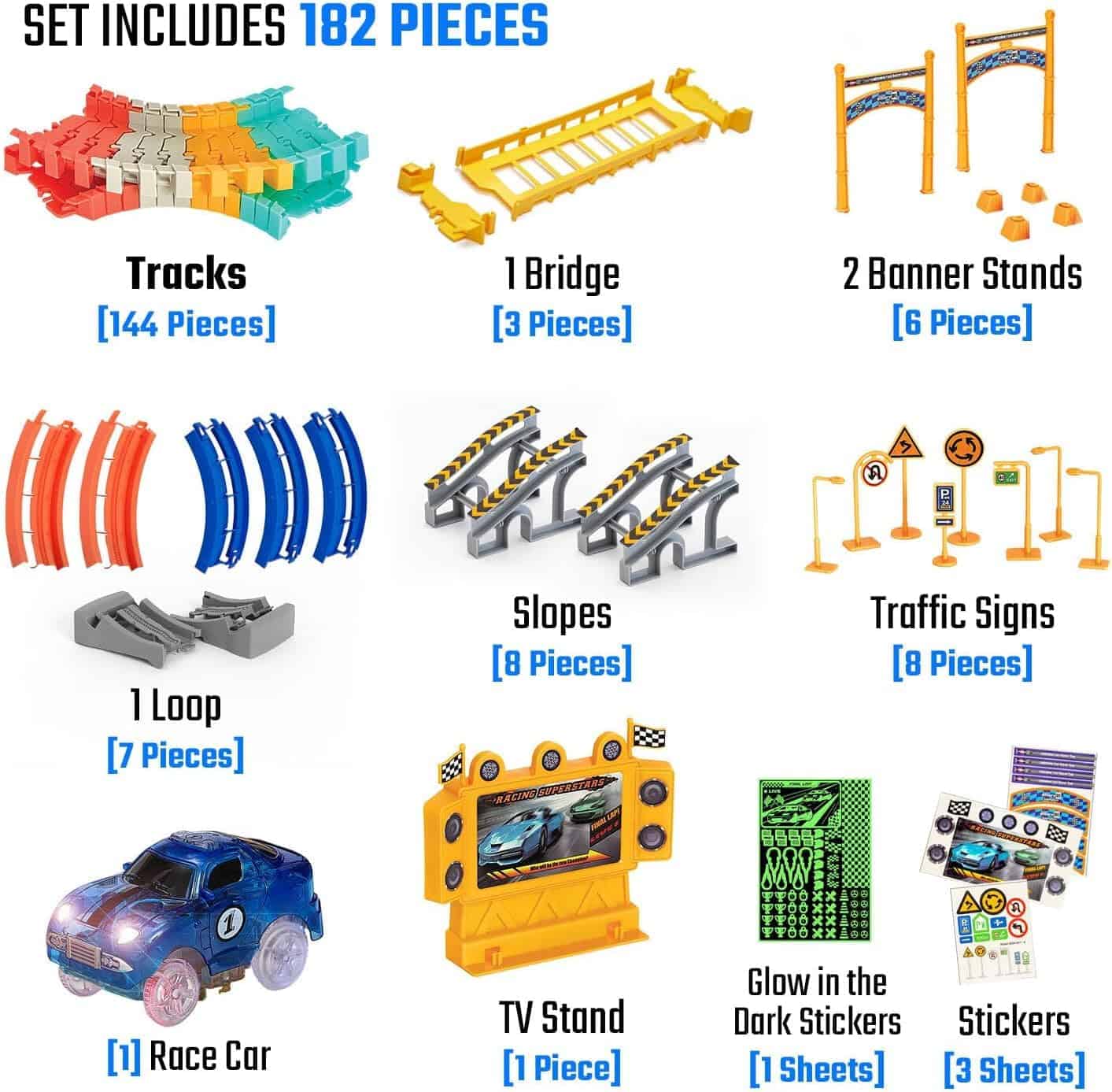 Set de Pista de Carreras que Brilla en la Oscuridad JITTERYGIT – El kit incluye una amplia variedad de elementos para que los niños puedan personalizar su experiencia de juego de carreras. Desde las 144 piezas flexibles que forman la pista, hasta las pegatinas brillantes y la rampa en bucle, este set ofrece diversión ilimitada para pequeños constructores. La posibilidad de crear carreras emocionantes de día y de noche con diseños brillantes y coloridos crea un ambiente creativo y educativo para los niños. Además, la seguridad y resistencia de los materiales utilizados garantizan la durabilidad y el entretenimiento a largo plazo. ¡Con este set, los niños podrán desarrollar habilidades STEM, creatividad e ingenio mientras disfrutan de emocionantes carreras con su familia y amigos!