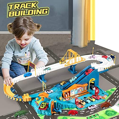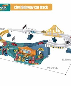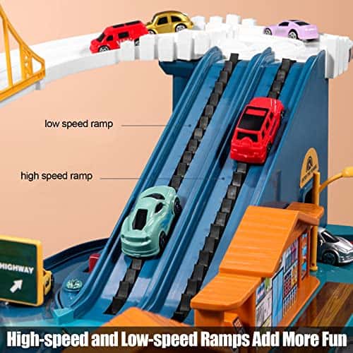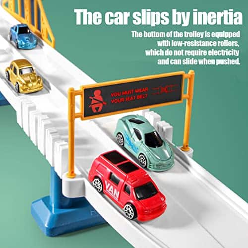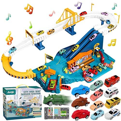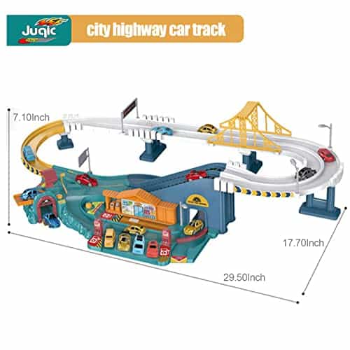 Regalo Premium para niños: Este juguete es el regalo perfecto para niños de 3+ años. Contiene varias pistas y 8 mini coches en una caja de buen tamaño. Simplemente montar puede ejercitar el pensamiento y la habilidad manual de los niños. La parte inferior del coche tiene ruedas de gravedad para mejorar la fuerza de deslizamiento, por lo que puede correr más suavemente en la pista. ¡Definitivamente es un regalo ideal para niños en festividades como Pascua, Día de Acción de Gracias, Cumpleaños, Vacaciones, Fiestas, Halloween, Navidad, etc.! Aprendizaje al Jugar: Esta pista de coches de juguete está equipada con varias instalaciones para mostrar escenarios de tráfico. Por ejemplo, viaductos, pilares de puentes, semáforos, curvas, señales de tráfico, entradas a autopistas, pilas de carga, plazas de aparcamiento, áreas de servicio de autopistas, que son equivalentes a modelos en miniatura de la vida real. Es útil para ayudar a los niños a aprender varios conocimientos comunes sobre el tráfico. Sonido Hace Más Divertido: Este juguete de pista de coches también tiene una función de sonido que se puede encender y apagar según la preferencia del niño. Requiere tres pilas AA (no incluidas). Las ondas de sonido del coche de carrera hacen que el juguete sea mucho más realista, lo que puede atraer la atención de los niños y aumentar la diversión. Doble pistas y dobles rampas de elevador, que pueden experimentar tráfico rápido y lento. Los padres pueden acompañar a sus hijos a jugar juntos y contarles conocimientos de ingeniería. Calidad Confiable y Certificada: Este juego de pista de coches de carreras está hecho de material premium no tóxico e inofensivo que cumple con las normas de EE. UU. para niños pequeños o más grandes. En Juqic, nos dedicamos a garantizar la calidad y seguridad de nuestros juguetes todo el tiempo. Si estás buscando un regalo para niños de preescolar o jardín de infantes, esta será una gran elección de regalo. ¡Debe ser un éxito instantáneo para los niños! 100% Satisfacción del Cliente: La satisfacción del cliente al 100% es nuestro objetivo para poder hacerlo mejor. Por favor, no dudes en contactarnos si nuestros productos no cumplen con tus expectativas. Si tienes alguna sugerencia, por favor no dudes en enviarnos un correo electrónico.