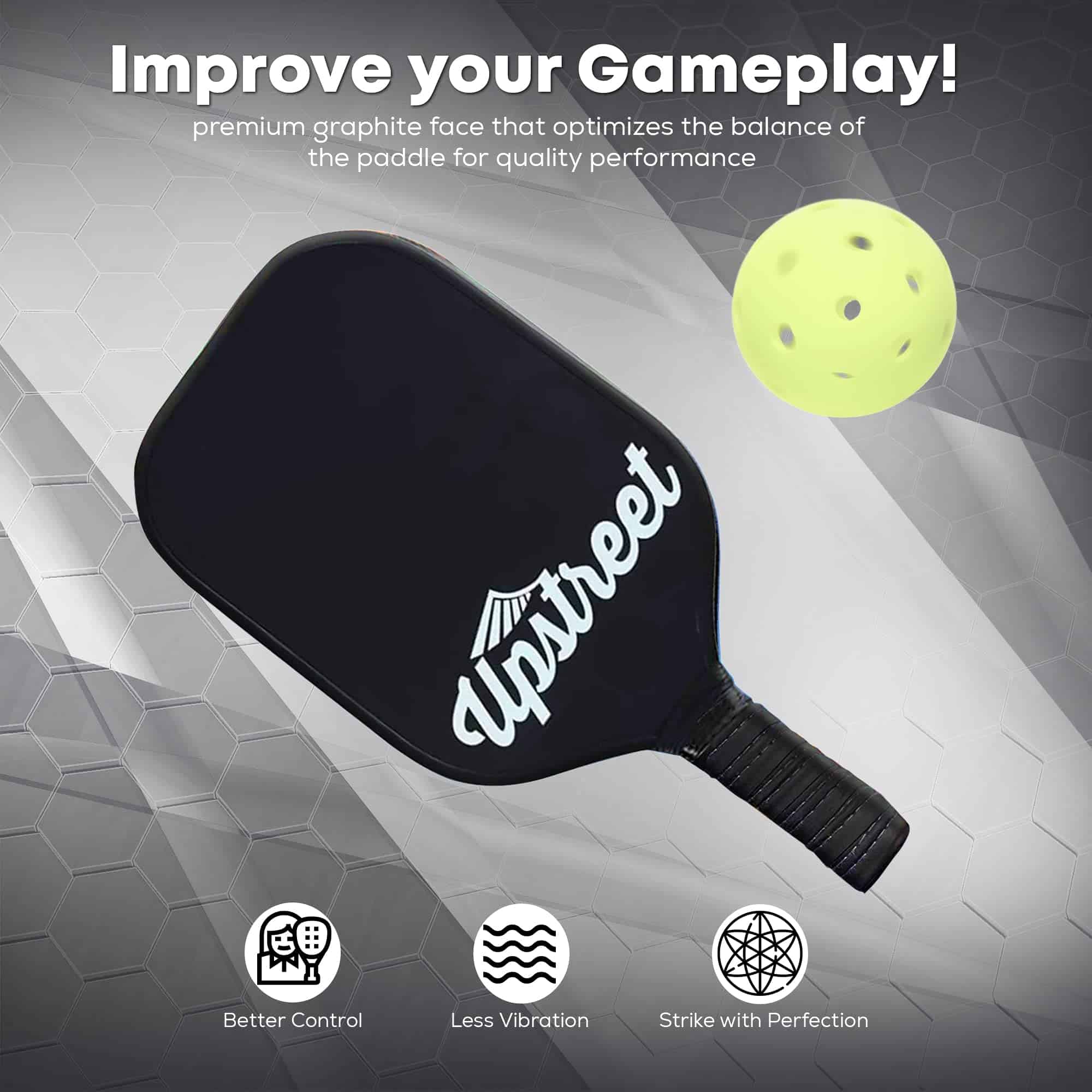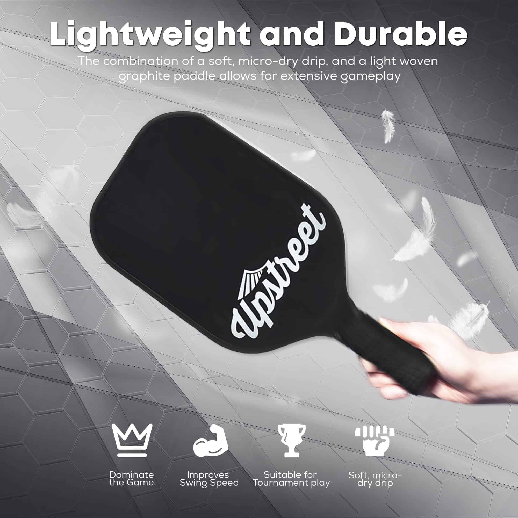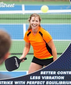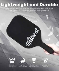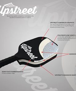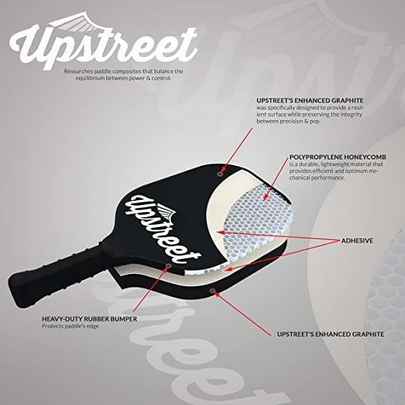1. RAQUETA DE PICKLEBALL BIEN CONSTRUIDA: Utilizamos tecnología de polímero de calidad y una cara de grafito premium para optimizar el equilibrio de esta raqueta para un rendimiento imparable. Cuando utilices la raqueta de pickleball de Upstreet, tu juego alcanzará nuevas alturas y nunca volverás a usar otra raqueta.