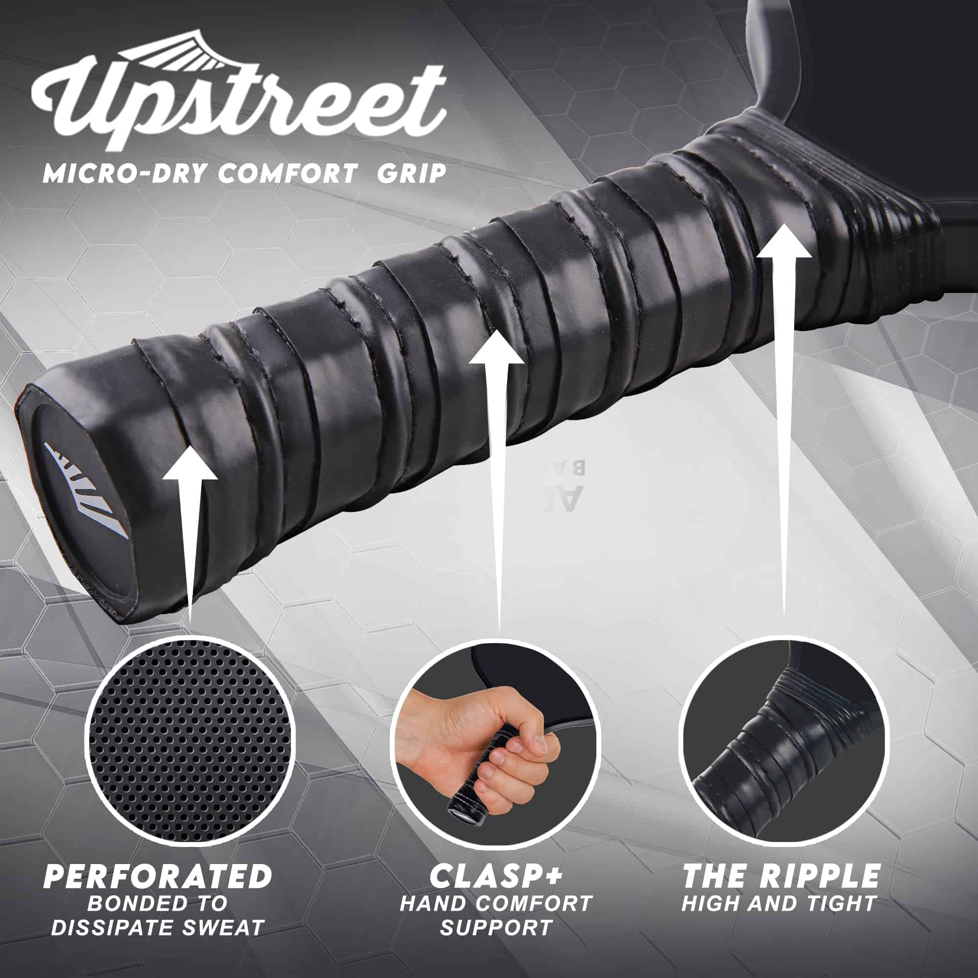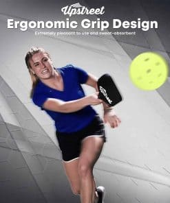 4. DISEÑO DE AGARRE ERGONÓMICO: La raqueta de pickleball de Upstreet tiene un agarre acolchado de alta calidad que es extremadamente agradable de usar y absorbente del sudor. Esta raqueta de pickleball tiene una longitud de agarre de 4.6 pulgadas y un círculo de agarre de 4.4 pulgadas, lo que la hace adecuada para manos de tamaño promedio.