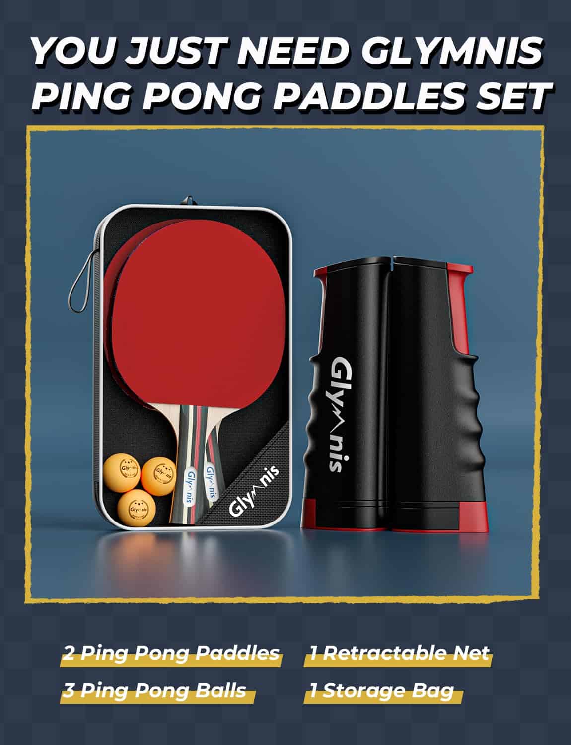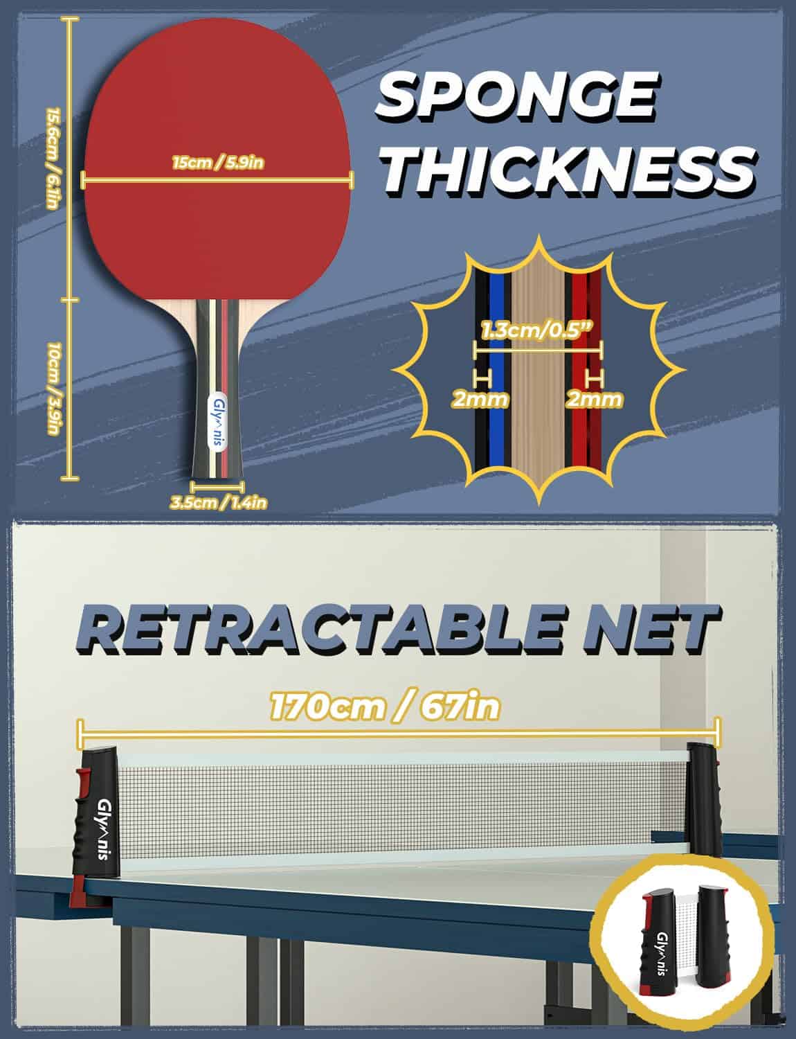 5. REGALO PERFECTO – El set de tenis de mesa Glymnis incluye 2 raquetas de ping pong, 3 pelotas de ping pong, 1 red de tenis de mesa retráctil, 1 bolsa de almacenamiento y 1 manual de usuario, que es un regalo ideal para tu familia y amigos, especialmente para los amantes y aprendices de ping pong. ¡Ven y juega un partido de tenis de mesa juntos!