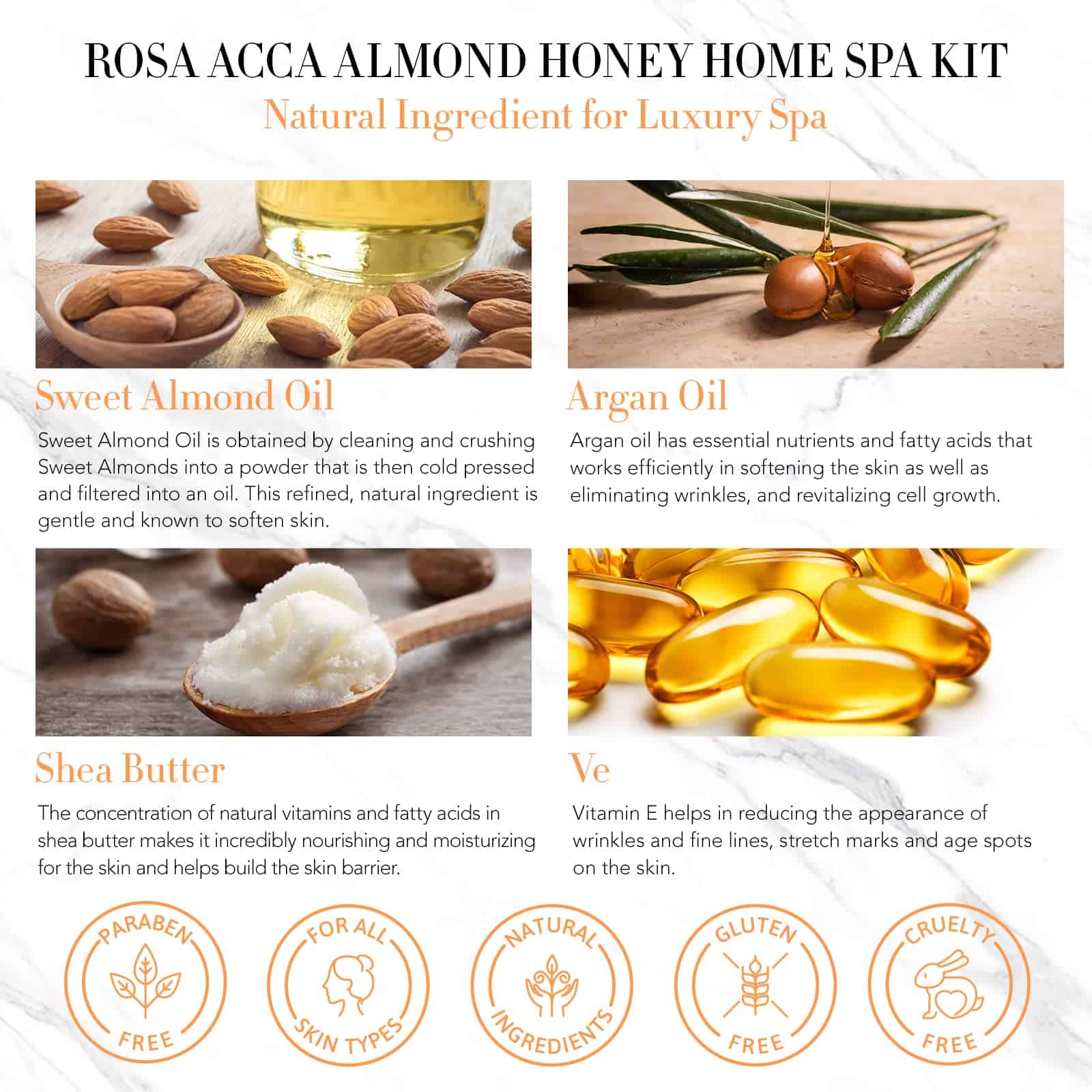1. 20Pcs Set de Regalo de Spa de Lujo El lujoso kit de spa Almendra Miel contiene 20 piezas de productos de baño y spa: Gel de Ducha, Baño de Burbujas, Bombas de Baño, Loción Corporal, Baño de Remojo, Jabón de Baño, Bálsamo Labial, Cinturón de Baño, Piedra Pómez, Máscara de Ojos de Seda, Gorro de Ducha, Peine, Calcetines, Esponja, Pantuflas, Set de Manicura empaquetado en una elegante Caja de Papel Estampada de Leopardo. 2. Experiencia de Baño de Aromaterapia Este dulce aroma a almendra y miel es tropical, romántico, fragante y duradero, ¡y te llevará a un paraíso de burbujas! No solo el cálido aroma a miel llena la habitación para adormecerte en un estado de relajación, sino que la piel también se beneficia enormemente de las propiedades nutritivas del aceite de almendra. 3. Idea de Regalo de Vacaciones Ideal Nuestro set de regalo de baño con aroma a almendra y miel es el regalo perfecto para tus amigos y seres queridos en varias ocasiones: Día de la Madre, Cumpleaños, Navidad, San Valentín, Nuevo Trabajo, Nuevo Bebé, Aniversario, Dama de Honor, Despedida de Soltera, Inauguración, Esposa, Mamá, Abuela, Hermana, Nuera, Mejor Amiga, Compañera de Trabajo, Prima, Tía, Sobrina, Profesora, Cuñada, Empleada o Novia. Será una gran sorpresa recibir un regalo tan hermoso con un aroma dulce. 4. Nutrir la Piel y el Cuerpo El set de regalo de spa de Rosa Acca está formulado con ingredientes naturales que hidratan y refrescan el cuerpo, y revitalizan la mente y el espíritu. Ingredientes nutritivos como la manteca de karité, la vitamina E y el aceite de almendra ayudan a nutrir la piel y retener la humedad. 5. Ingredientes de Calidad Premium Rosa Acca proporciona productos naturales para el cuerpo, el baño y el cuidado de la piel que nutren, embellecen y vigorizan la piel y el estado de ánimo. No contiene parabenos, gluten ni sulfatos. Es 100% Natural, Vegano y Libre de Crueldad. ¡Estamos seguros de que adorarás este lujoso set de regalo de spa para el hogar!