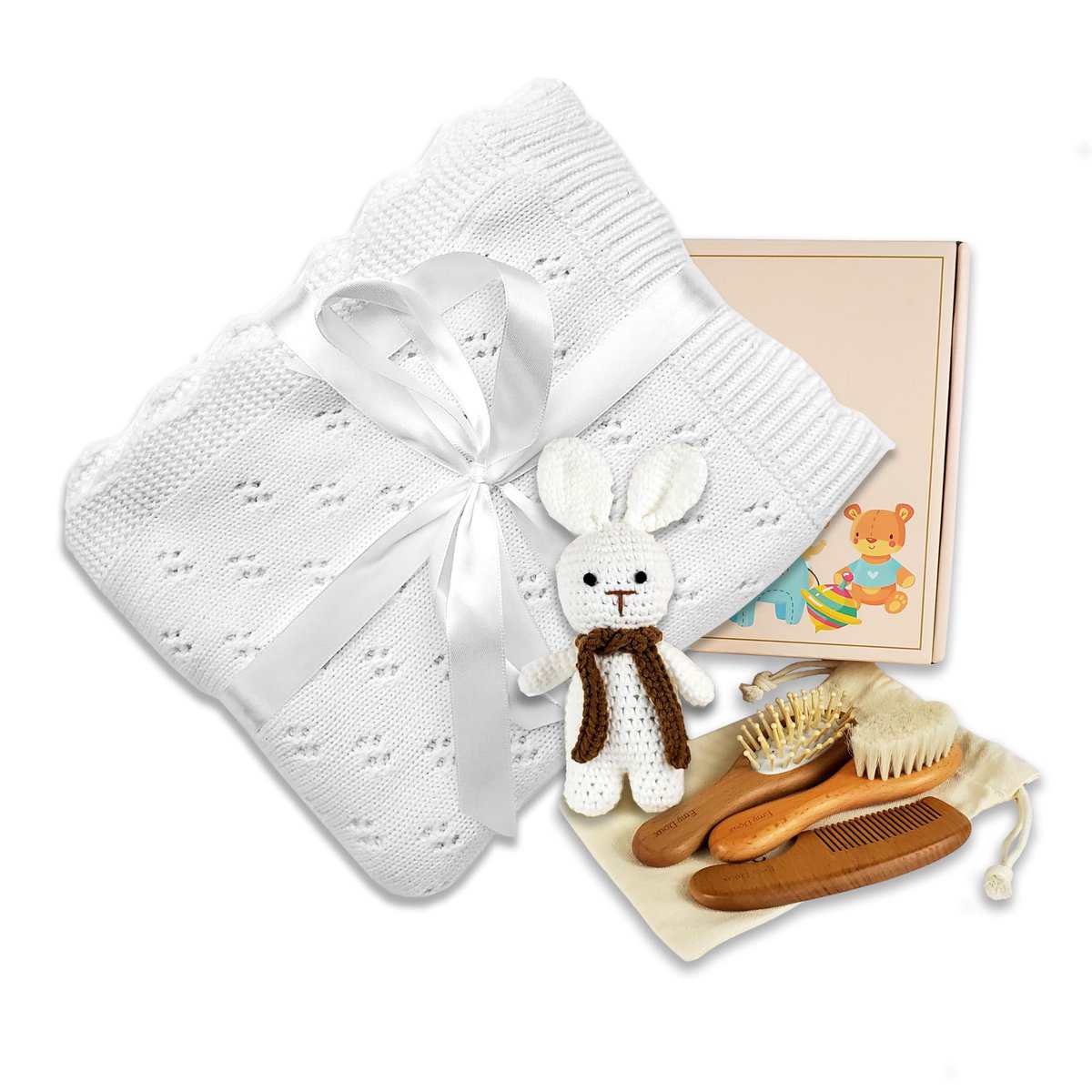 Más detalles sobre la manta de algodón, el juego de cepillo de madera y el conejo de ganchillo. Incluye instrucciones de cuidado y recomendaciones para un uso óptimo. La caja de regalo brinda una presentación elegante y lista para regalar en cualquier ocasión especial para bebés y recién nacidos.