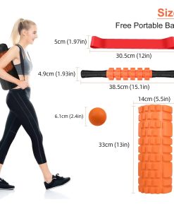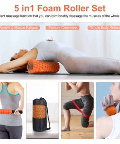 Set de masaje muscular profundo 5 en 1 que incluye 1 rodillo de espuma hueco (33×14 cm), 1 palo de yoga, 1 pelota de masaje, 1 banda de estiramiento y 1 bolsa de almacenamiento.