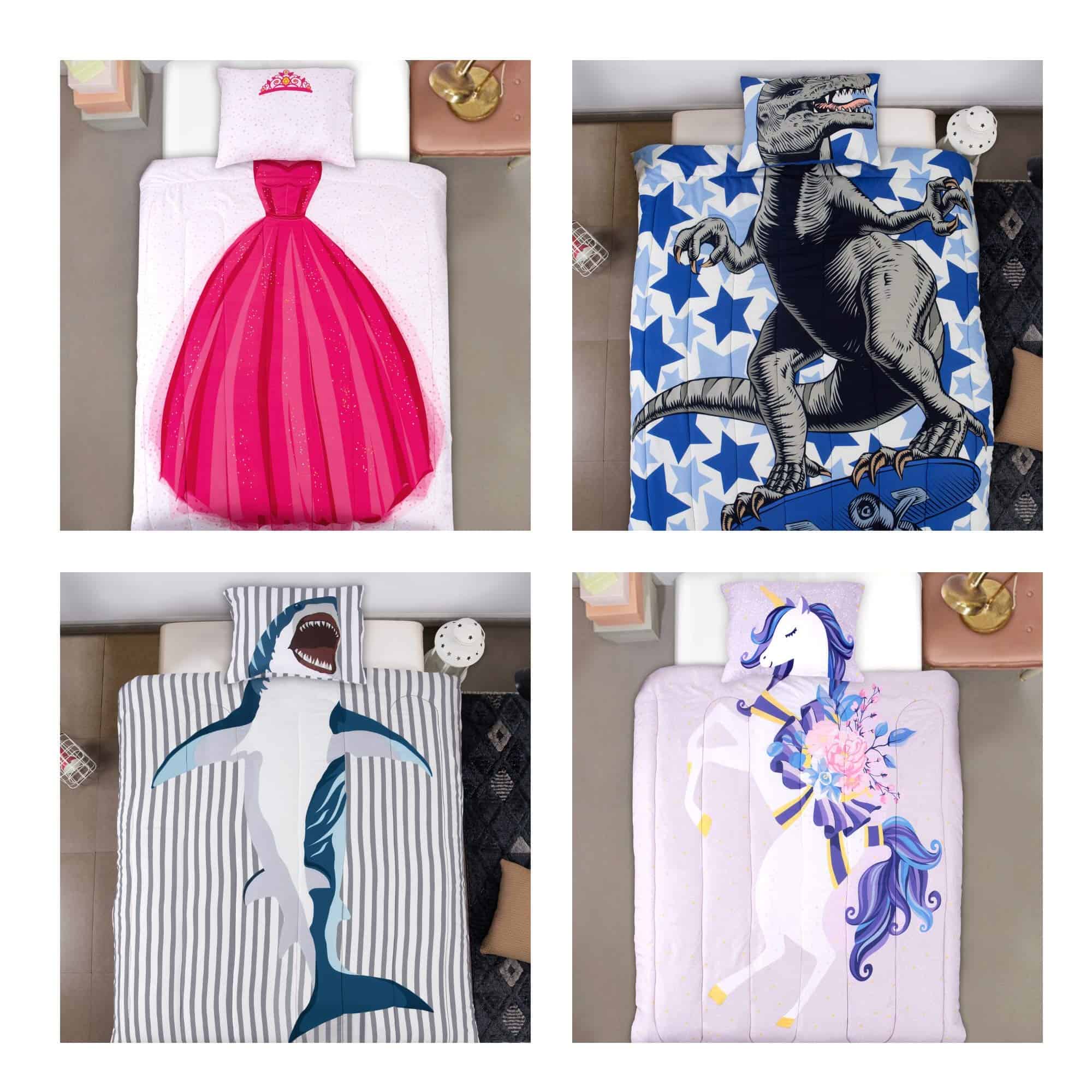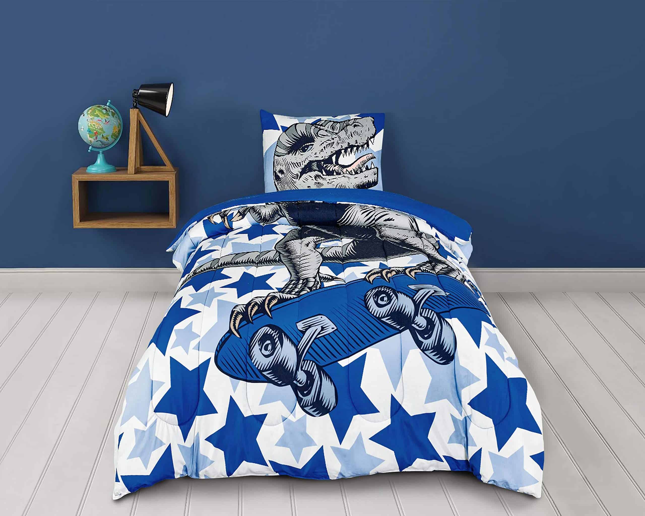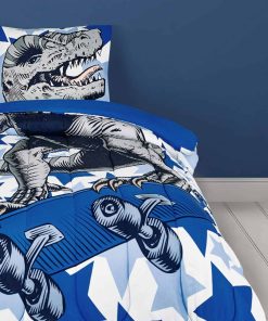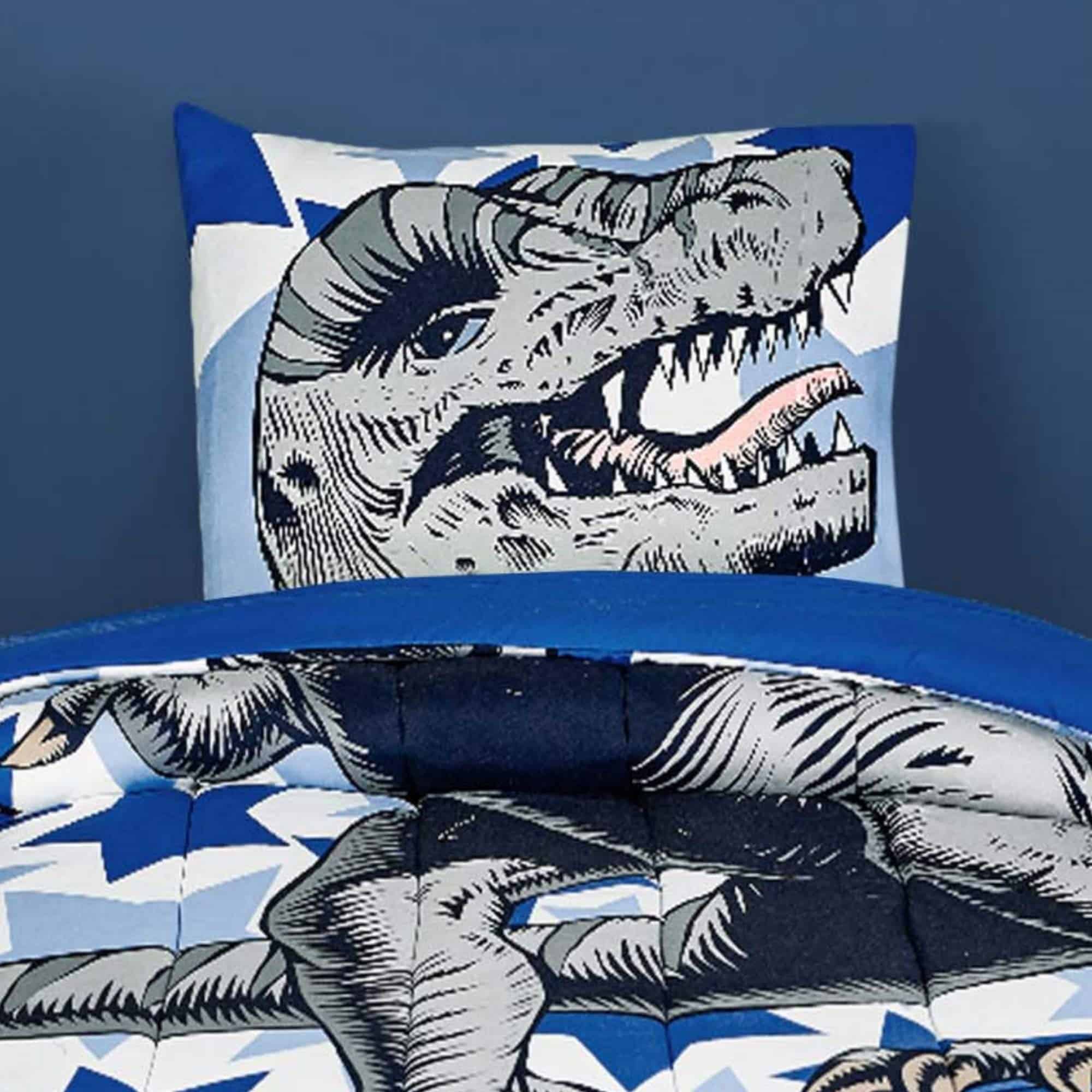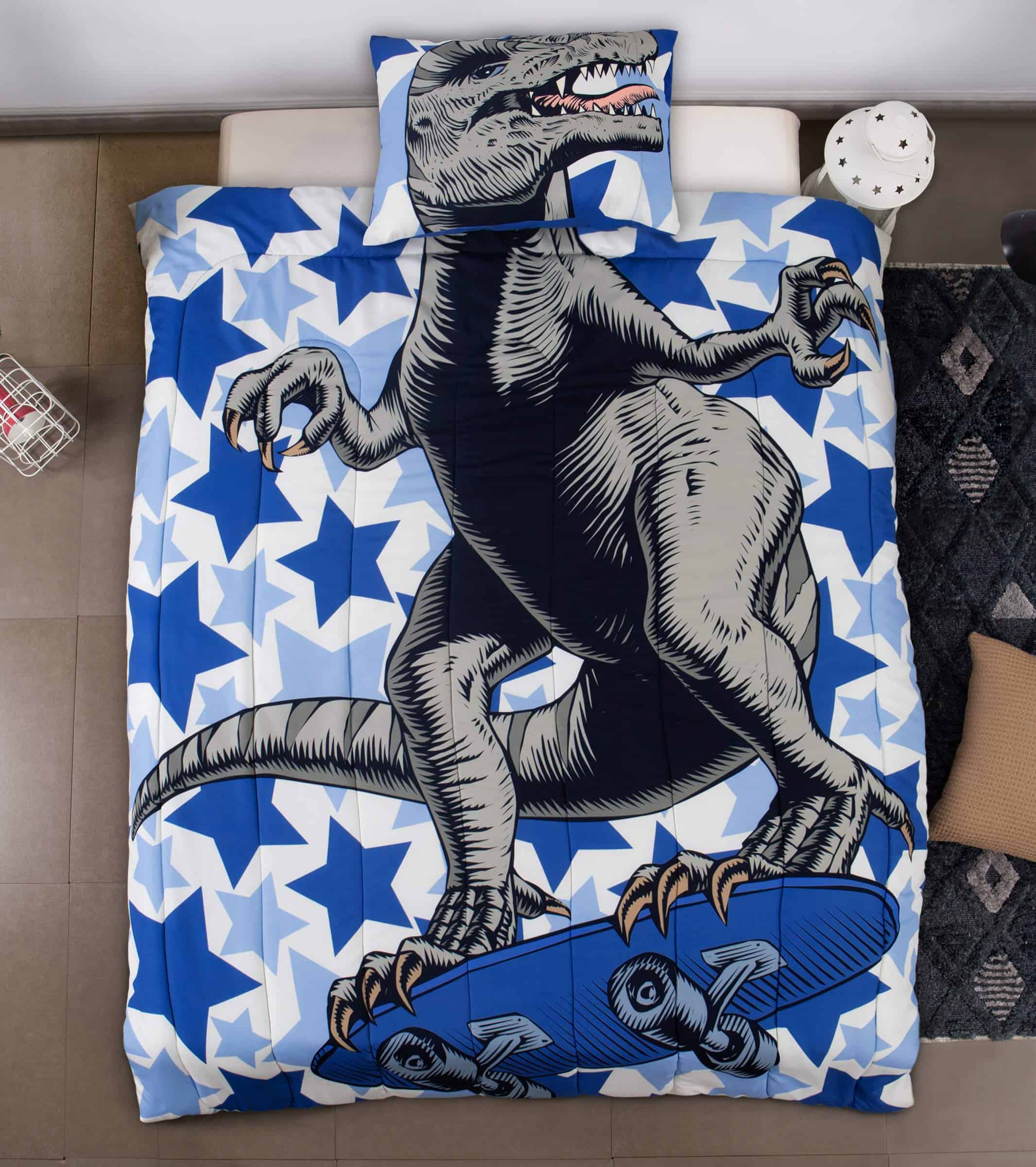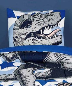Embárcate en una aventura prehistórica con el set de ropa de cama de dinosaurios! Este set épico incluye un edredón de 86″ x 68″ y una funda de almohada de 20″ x 26″, ajustándose perfectamente a camas twin de tamaño estándar. Deja que las imaginaciones de tu pequeño paleontólogo corran desenfrenadas mientras duermen bajo la atenta mirada del amigable T-Rex. El edredón reversible presenta un genial T-Rex en un skate y la funda de almohada estándar completa el set con su cabeza de dino. ¡Prepara a tu súper cool niño para una aventura de tamaño dino con este set de ropa de cama de dinosaurios!