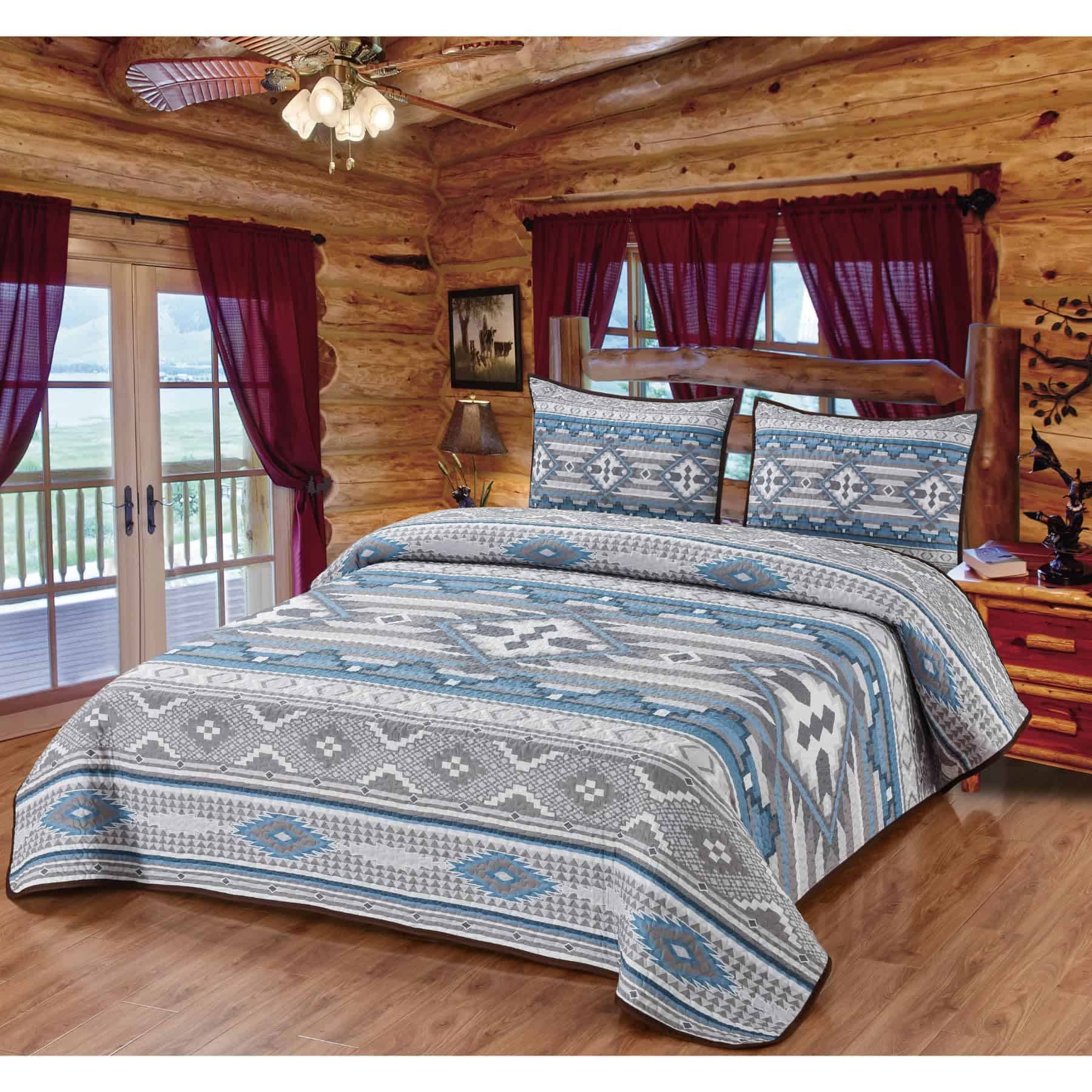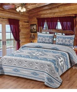 SET DE ROPA DE CAMA KING DECORATIVO con un Diseño Inspirado en el Desierto y un Patrón Geométrico Azul y Gris. MATERIAL: Poliéster Microfibra. TAMAÑO DE CAMA KING: 1 Edredón (108″L x 90″W), 2 Fundas de Almohada (27″L x 20″W). INSTRUCCIONES DE CUIDADO: Lavar a máquina en frío, Ciclo suave, No usar lejía ni lavado en seco, Mantener alejado de la luz solar directa, Secar a baja temperatura. DECORACIÓN DEL HOGAR DEL SUROESTE perfecta para una Cabaña o Lodge.