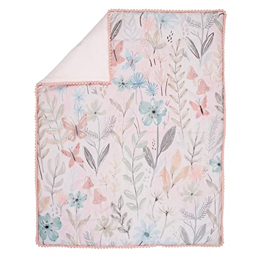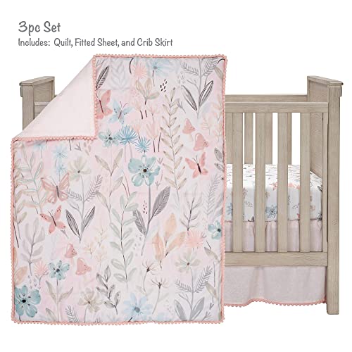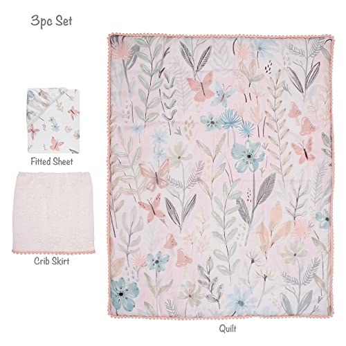 El set de ropa de cama para cuna Baby Blooms de Lambs & Ivy en 3 piezas es perfecto para darle un toque de elegancia y ternura a la habitación de tu bebé. Incluye un edredón acolchado, una suave sábana ajustable de algodón transpirable al 100% y una falda para cuna coordinada. El diseño personalizado de acuarela floral con mariposas le da un aspecto fresco y encantador al set. La sábana ajustable de algodón transpirable garantiza un sueño confortable para tu pequeño. La paleta de colores suaves de azul celeste, blush, taupe cálido, rosa claro y gris suave crea un ambiente tranquilo y acogedor en la habitación. Además, el adorno de borlas en el edredón y la falda para cuna añade un toque de sofisticación a la decoración. Este set de ropa de cama para cuna es ideal para crear un espacio acogedor y elegante para tu bebé.