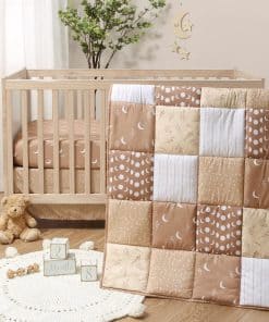 2. Set completo: Este set de 3 piezas incluye un edredón de cuna bellamente elaborado, una sábana ajustada para cuna y un faldón a juego, ofreciendo un look elegante y coordinado para tu vivero.