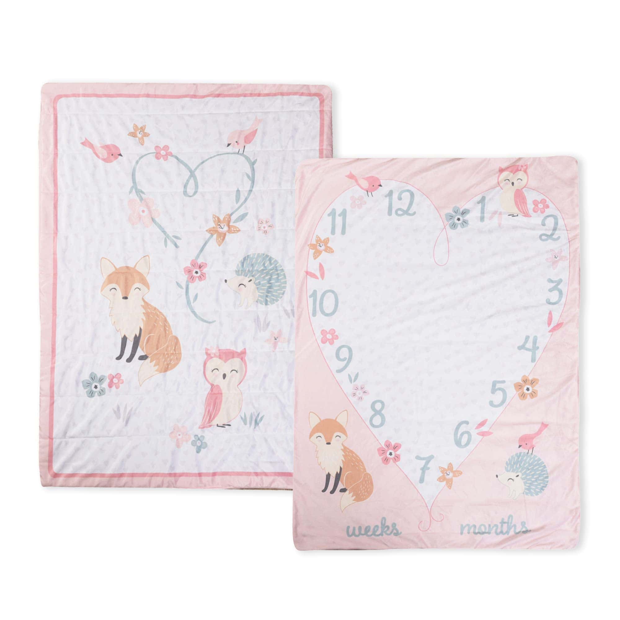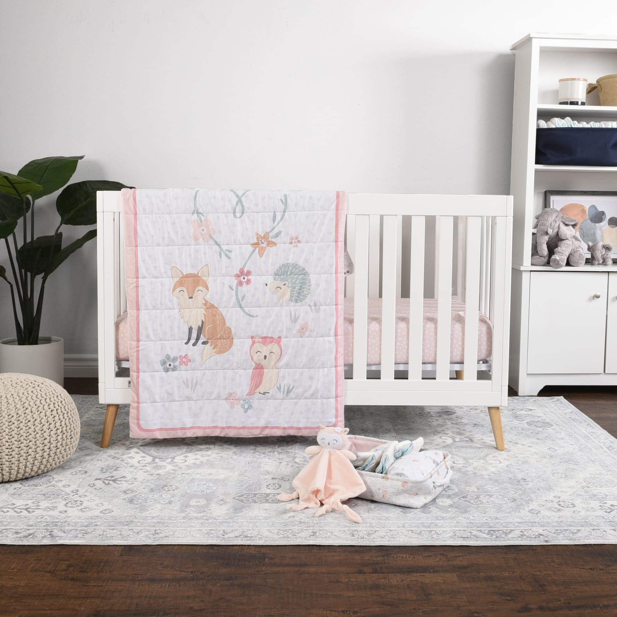 Lleva a casa este encantador set de 5 piezas para el dormitorio del bebé. ¡Es hora de decorar el espacio para dormir de tu pequeño y llevar su sueño a un nuevo nivel de comodidad! La manta reversible de hitos te permite capturar el crecimiento de tu hijo en su primer año de vida, manteniéndolos acogedores y cálidos. Con una adorable bolsa de almacenamiento, un buddy blankie y sábanas ajustadas a juego, este set es perfecto como regalo para padres nuevos o futuros.