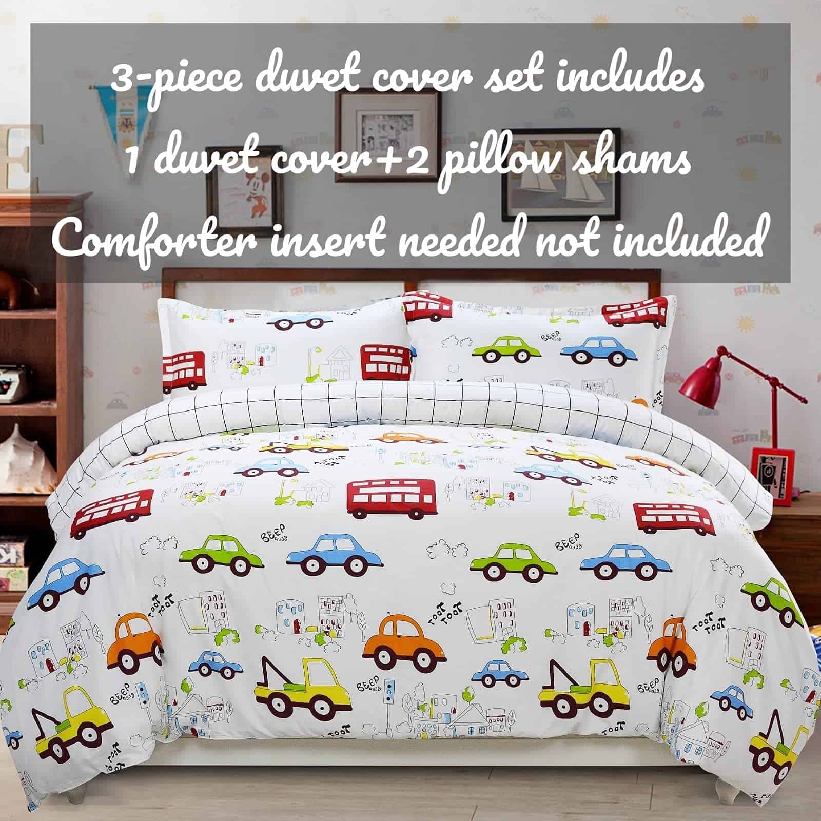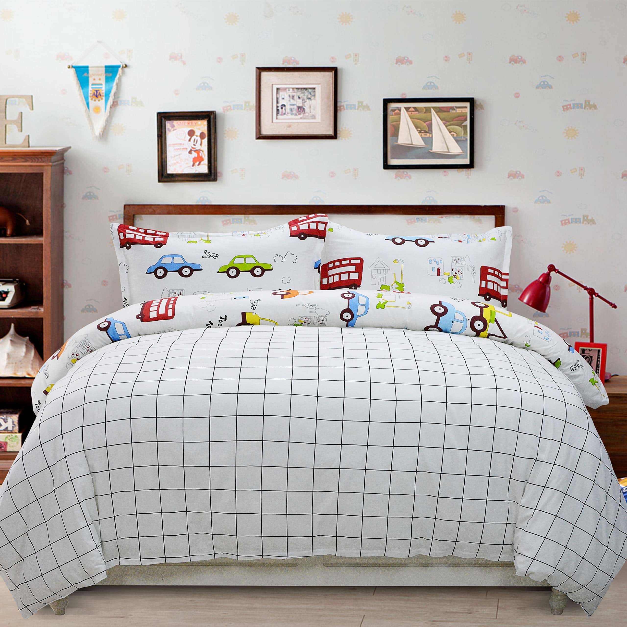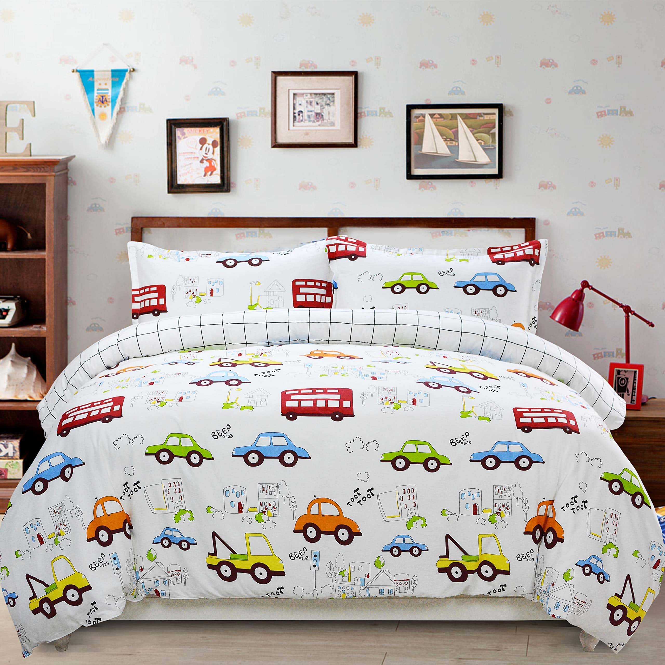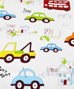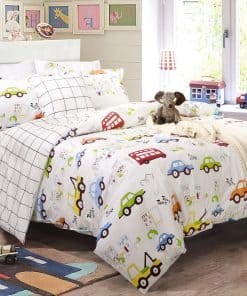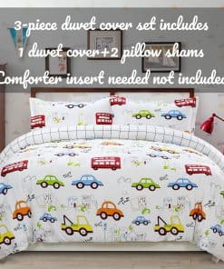 Este set de ropa de cama para niños está diseñado con coches y camiones en un divertido estampado de dibujos animados. Fabricado con 100% algodón natural, garantiza un tacto suave y transpirable para la piel de tus pequeños. El juego incluye una funda nórdica con cierre de cremallera y lazos en las esquinas, junto con dos fundas de almohada tamaño estándar. Es duradero y fácil de mantener, lavable a máquina en frío y secado a baja temperatura. Agrega un toque divertido y funcional a la habitación de tus hijos con este adorable set de ropa de cama.