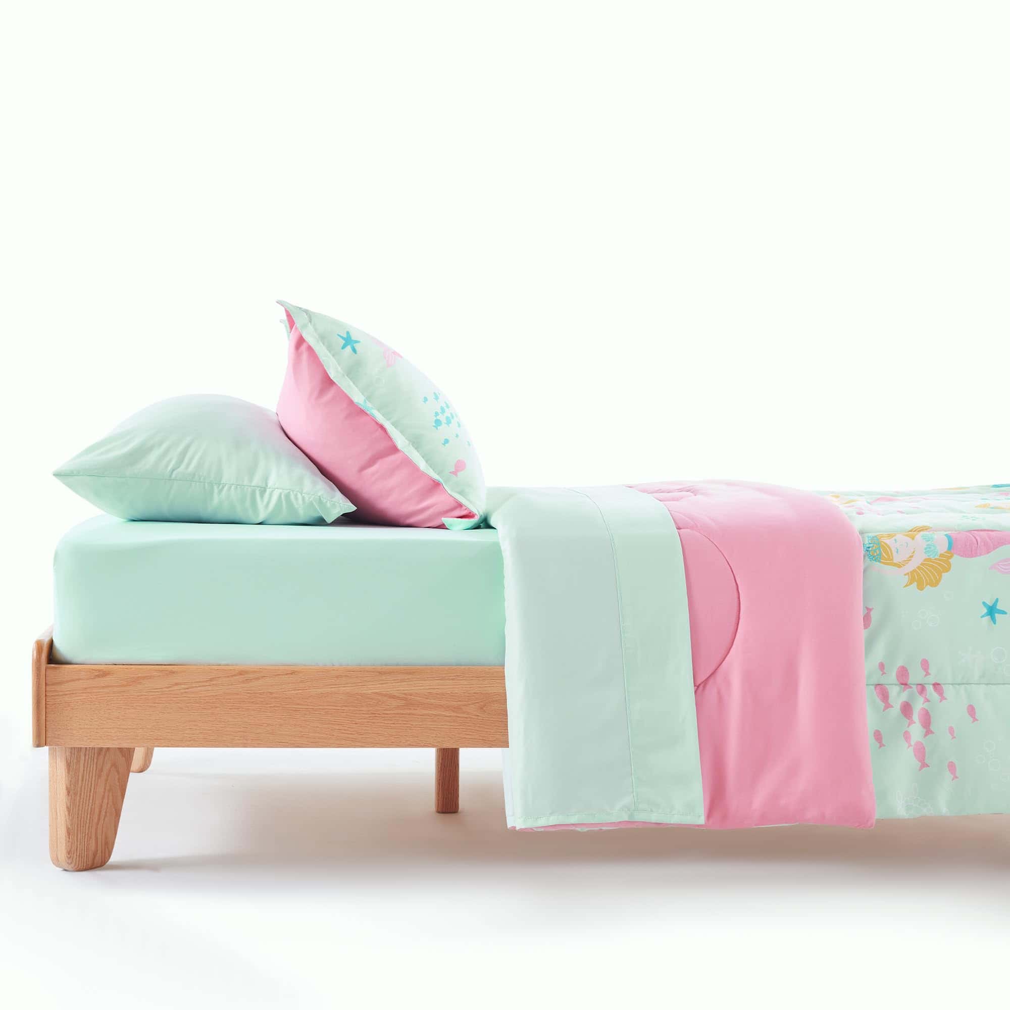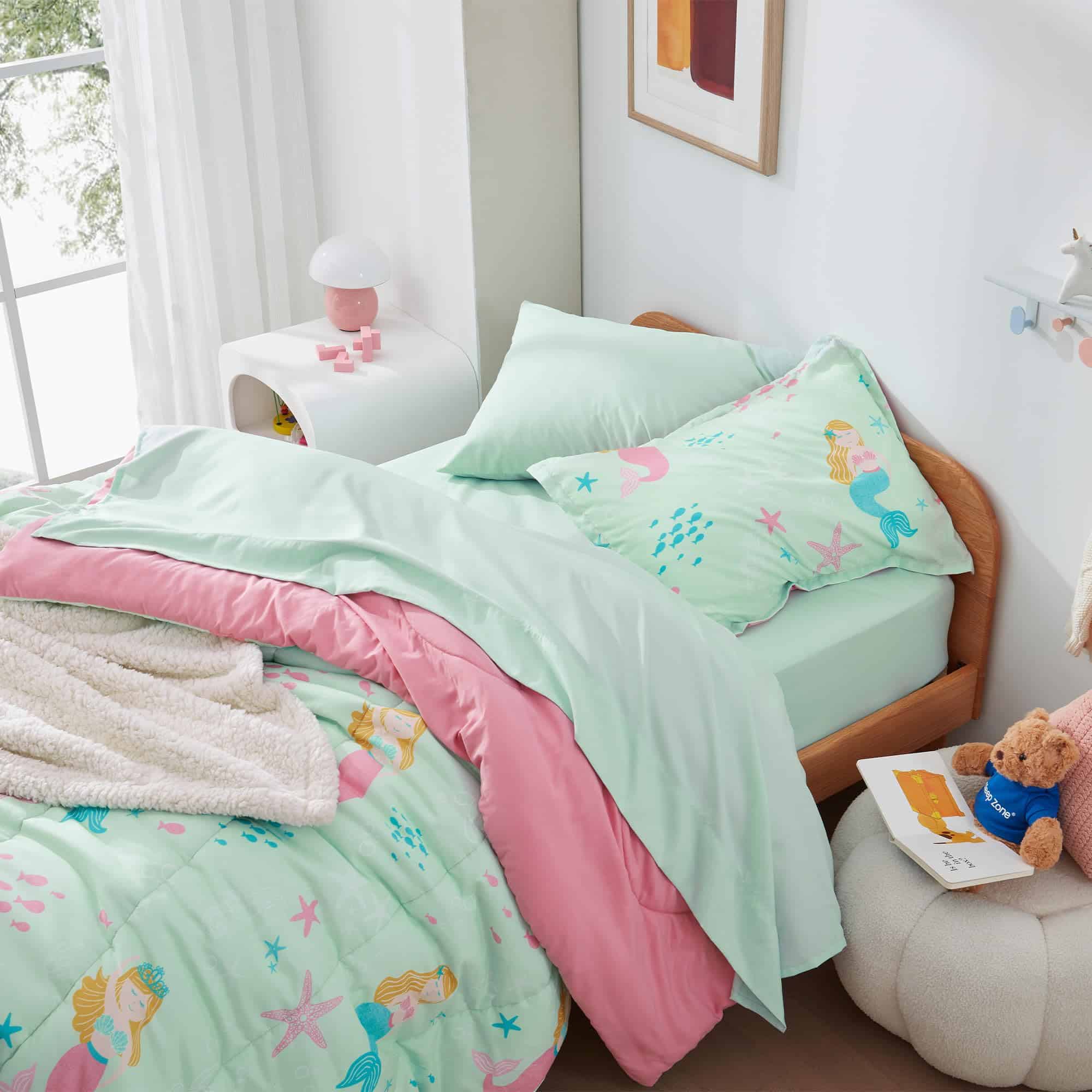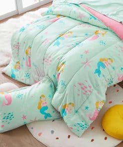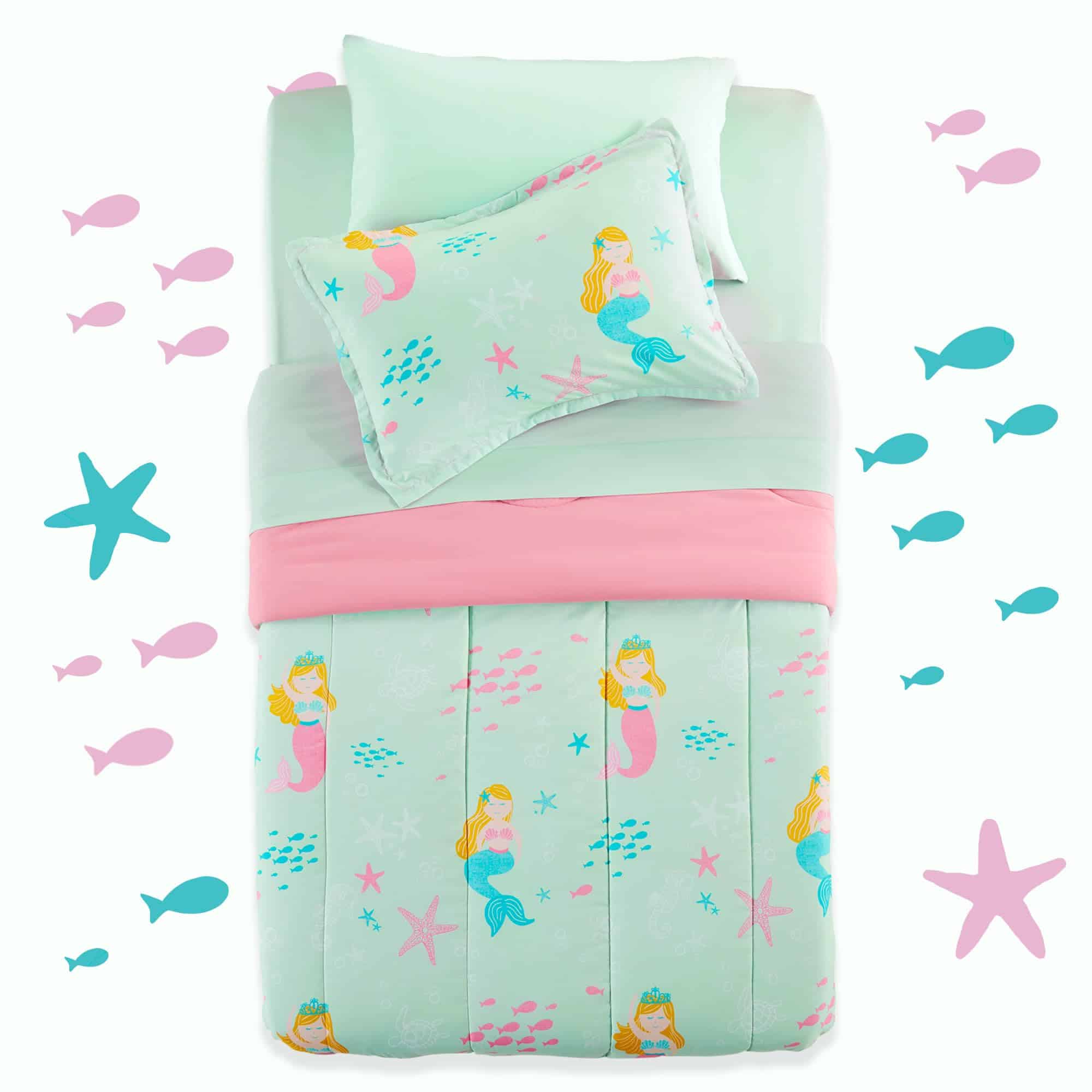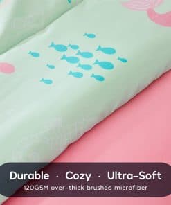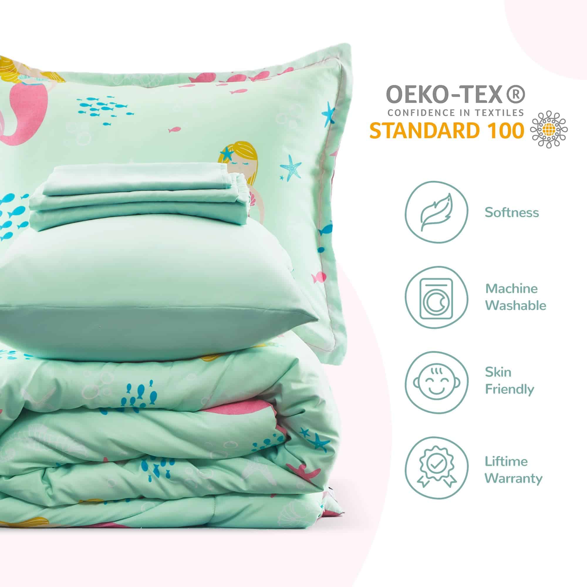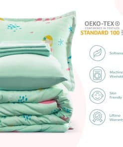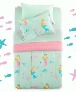 Cada niña sueña con ser una princesa y con este juego de ropa de cama SLEEP ZONE para niños, esa fantasía se hará realidad. El diseño súper lindo incluye princesas sirenas, estrellas de mar, tortugas, caballitos de mar y peces pequeños que crean un mundo marino fantástico en la parte superior del edredón. La tela del edredón es microfibra cepillada gruesa que se siente súper suave y cómoda al tacto. El relleno de 200gsm mezclado con fibra refrescante INVISTA es transpirable y esponjoso como dormir en una nube. Además, es ligero, silencioso y sin olor para una experiencia de sueño perfecta. La construcción duradera y el diseño de acolchado clásico mantienen el edredón ajustado al cuerpo, mientras que el elegante ribete no solo se ve hermoso, sino que también previene la rotura de los bordes. La costura precisa y duradera evita que los rellenos se apelmacen incluso después de varios lavados. Este juego de ropa de cama incluye 7 piezas en tamaño Full/Queen: 1 edredón de 90×90 pulgadas, 1 sábana ajustable de 60x80x14 pulgadas, 1 sábana plana de 90×102 pulgadas, 2 fundas de almohada de 20×26 pulgadas y 2 fundas de cojín de 20×30 pulgadas. SLEEP ZONE tiene más de 40 años de experiencia en el diseño y fabricación de ropa de cama de alta calidad. Los productos están certificados según el estándar Oeko-Tex 100 para estar libres de productos químicos dañinos. Puede comprar con confianza sabiendo que está adquiriendo un producto de excelente calidad y con un servicio al cliente excepcional. Si tiene alguna pregunta o problema, no dude en contactarnos, estaremos encantados de atenderlo en un plazo de 24 horas.