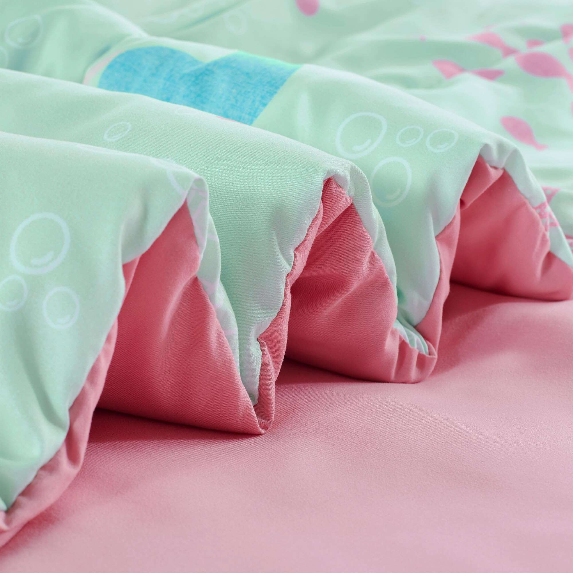 1. DISEÑO LINDO PARA NIÑOS – Cada niña sueña con ser una princesa. Utilizamos una variedad de elementos y colores para diseñar este juego de ropa de cama súper lindo para niñas. La parte superior del edredón está diseñada con princesas sirenas, estrellas de mar, tortugas, caballitos de mar y peces pequeños para crear un mundo marino fantástico. 2. MULLIDO COMO NUBE Y ULTRA-SUAVE – La tela del edredón es microfibra cepillada gruesa, se siente súper suave y cómoda. El relleno es de fibra resiliente de 200gsm mezclada con fibra refrescante INVISTA, súper transpirable y esponjoso como dormir en una nube. Ligero, silencioso y sin olor. 3. DURADERO Y LAVABLE – El diseño de acolchado clásico lo mantiene ajustado al cuerpo. El elegante ribete no solo se ve hermoso, sino que también previene eficazmente la rotura del borde. La costura precisa y duradera evita que los rellenos se apelmacen incluso después de muchos lavados. Proceso de teñido e impresión amigable con la piel, excelente solidez del color. Lavar a máquina en frío, no usar blanqueador, secar en secadora a baja temperatura. 4. EL SET DE ROPA DE CAMA INCLUYE – 7 Piezas Tamaño Completo/Queen – 1 edredón de 90×90 pulgadas, 1 sábana ajustable de 60x80x14 pulgadas, 1 sábana plana de 90×102 pulgadas, 2 fundas de almohada de 20×26 pulgadas, 2 fundas de cojín de 20×30 pulgadas. 5. PROMESA DE SATISFACCIÓN – SLEEP ZONE tiene más de 40 años de experiencia en el diseño y fabricación de ropa de cama de alta calidad. Nuestros productos están certificados según el estándar Oeko-Tex 100 para estar libres de productos químicos dañinos. Puede comprar con confianza bajo nuestra excelente calidad de producto y servicio al cliente. Si tiene alguna pregunta o problema, no dude en contactarnos, le responderemos en un plazo de 24 horas.