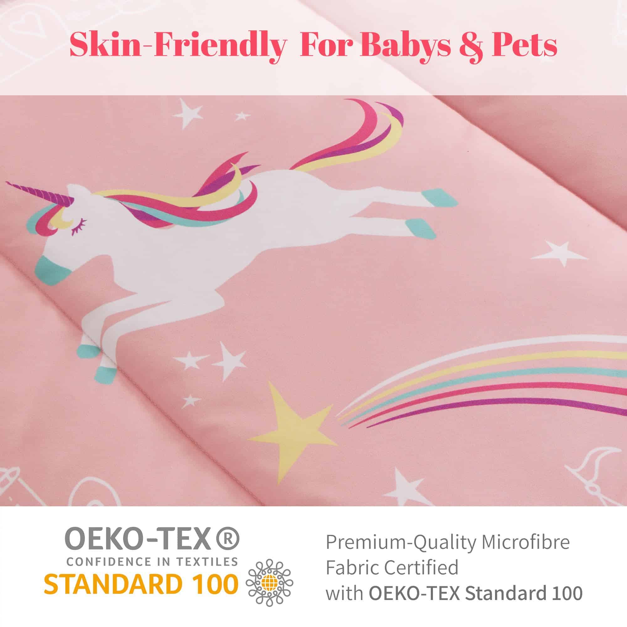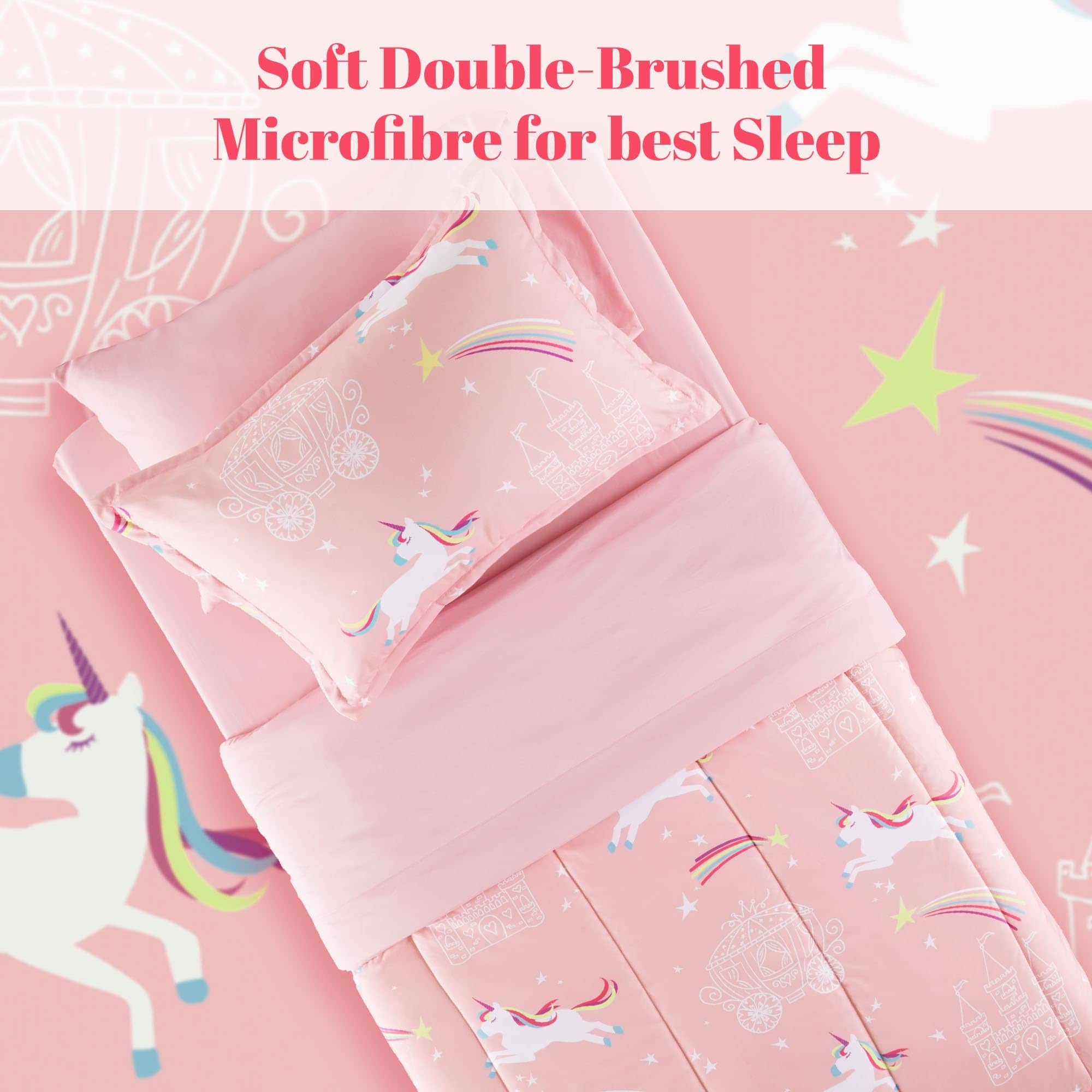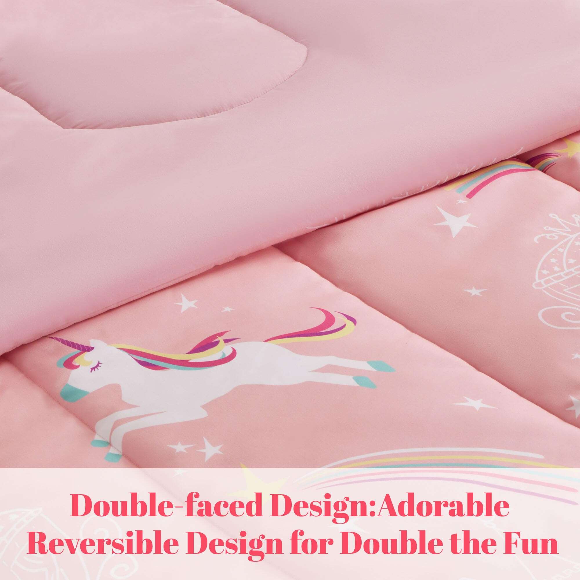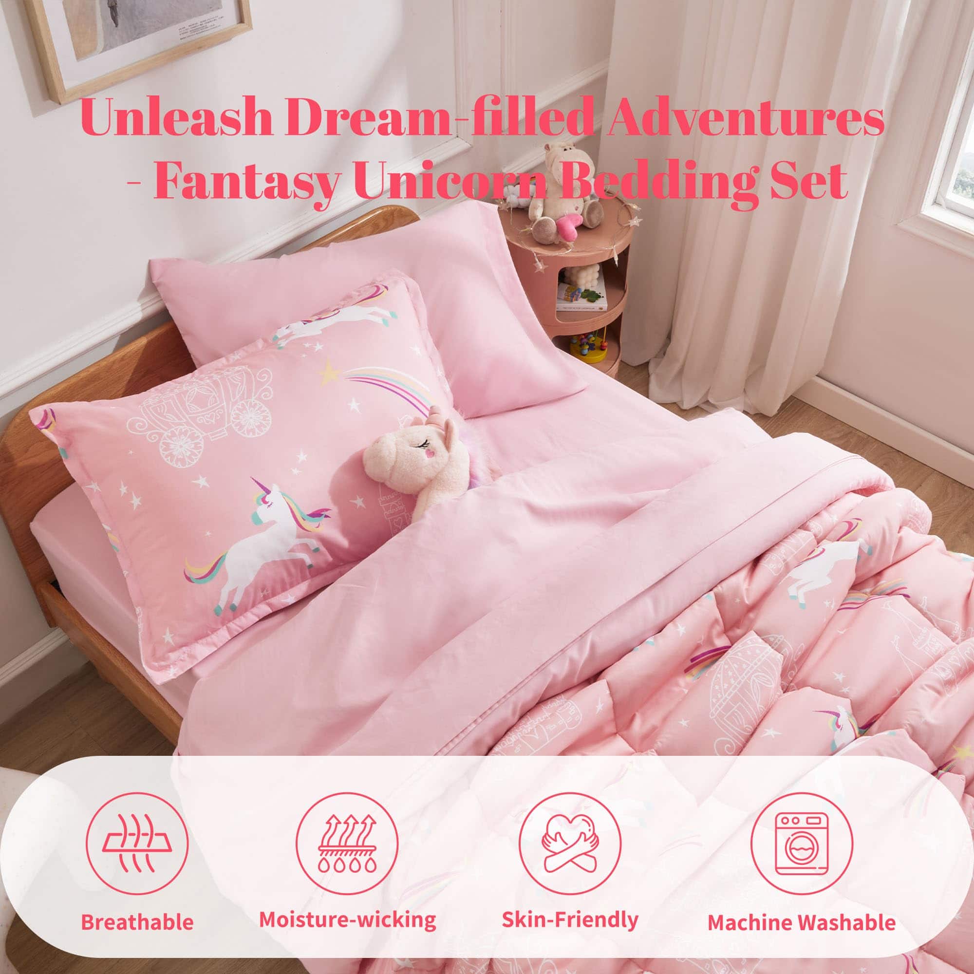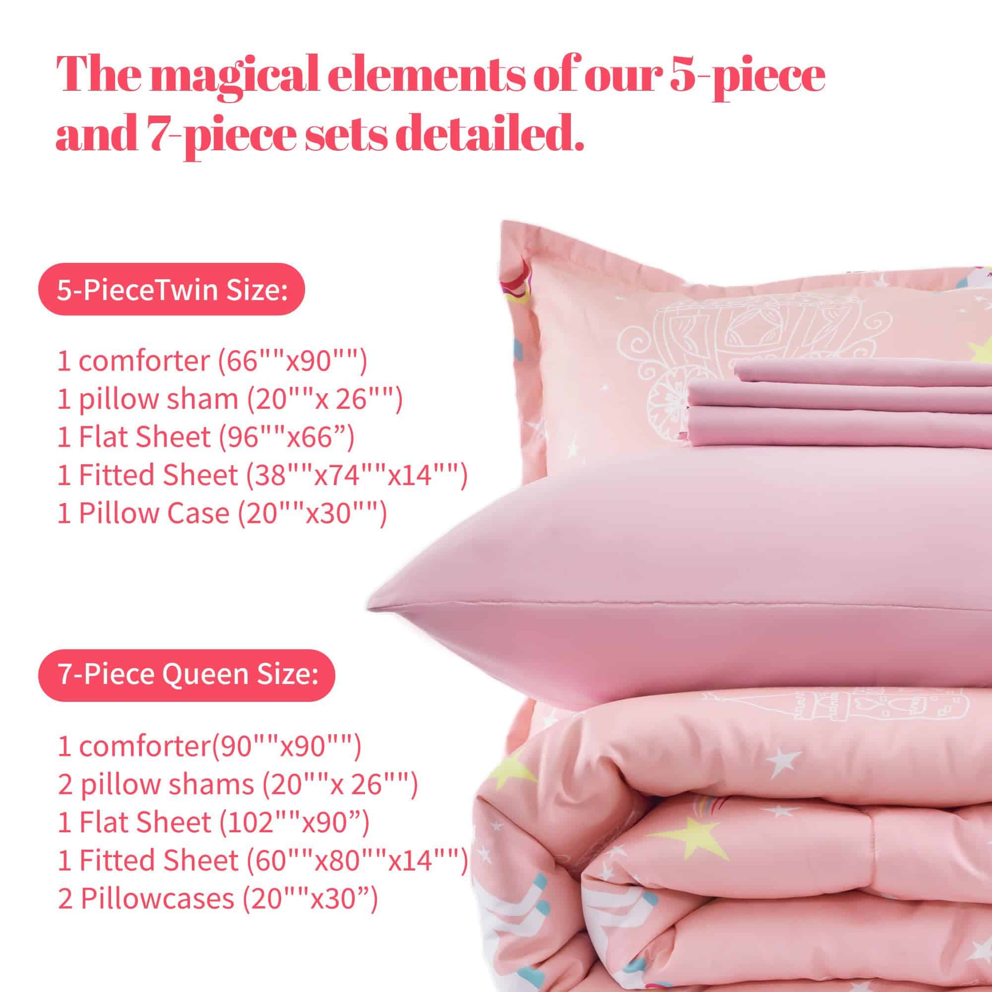 1. CALIDAD EXCEPCIONAL – Elaborado con la microfibra más suave y relleno con cálido 100gsm 5D Fibra hueca enrollada, nuestro edredón ofrece un refugio acogedor y esponjoso. Con propiedades antiarrugas, duraderas y estampados vibrantes en 3D que no se decoloran, nuestro juego de ropa de cama garantiza un confort duradero. 2. DISEÑO ENCANTADOR – Deje que su hijo duerma en un cuento de hadas, rodeado de castillos rosados y pegasos coloridos. Nuestro patrón de ‘Unicornio de Ensueño’, sobre un fondo rosado, brinda una experiencia digna de una princesa. Es un suave recordatorio del amor ilimitado de un padre por su hijo, convirtiendo su sueño en un viaje mágico. 3. REGALO PERFECTO – Envíe a su hijo a dormir con nuestro encantador juego de edredón de unicornio, un regalo de ensueño para cualquier niña. Con el encantador diseño de castillo y unicornio, ofrece tanto confort como alegría. Ya sea para la escuela o el hogar, esta ligera y portátil colcha brinda comodidad y sueños mágicos a cualquier entorno. 4. FACILIDAD DE CUIDADO Y DURABILIDAD – Nuestro duradero juego de ropa de cama está diseñado para durar y es lavable a máquina. Para el mantenimiento, opte por un ciclo de lavado suave y frío en la máquina. Seque al aire/o en secadora a baja temperatura para preservar la calidad y suavidad. Evite blanquear o remojar para mantener viva la magia del diseño de unicornio. 5. CAMA EN UNA BOLSA – Embarque en un sueño mágico con nuestro juego de tamaño Queen completo, que incluye 1 edredón (90″x90″), 2 fundas de almohada (20″x26″), 1 sábana plana (102″x90″), 1 sábana ajustable (60″x80″+14″), y 2 fundas de almohada (20″x30″).