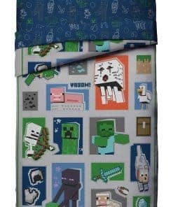 Set de ropa de cama Twin de 5 piezas que incluye edredón reversible, sábana plana, sábana ajustable, funda de almohada y funda de cojín con personajes coloridos de Minecraft como Creeper, Fantasma, Zombi y Enderman. Hecho de microfibra de poliéster cepillada 100% ultra suave y resistente a la decoloración para una noche de sueño cómoda. La ropa de cama de tamaño Twin es perfecta para habitaciones de niños, habitaciones de invitados, casas de vacaciones o vehículos recreativos. Lavado a máquina en frío, secado en secadora a baja temperatura. Producto con licencia oficial de Minecraft.