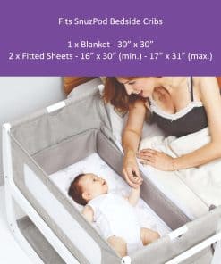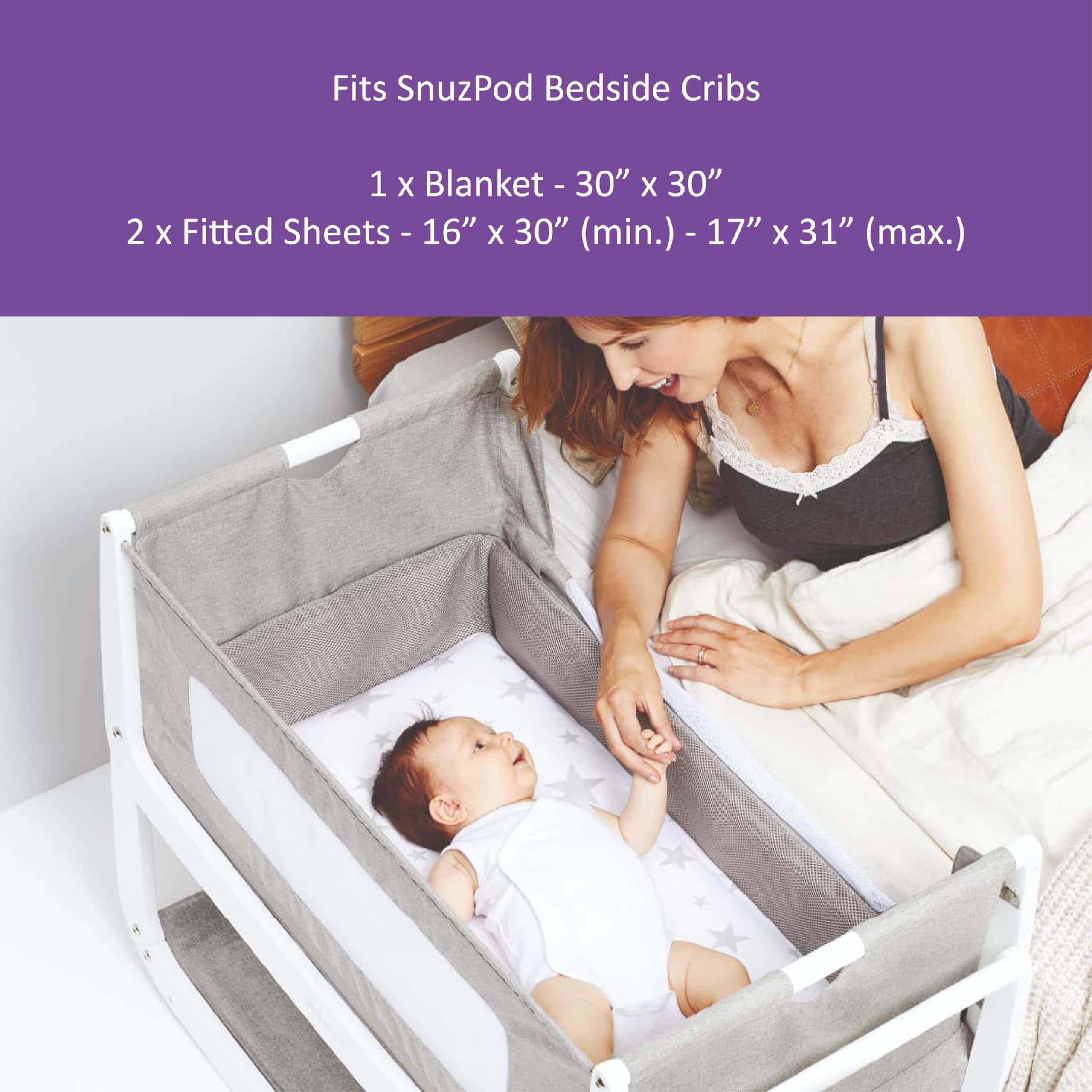 3. AJUSTE CEÑIDO: La manta mide 30 x 30 mientras que las sábanas ajustadas son de 16 x 30 (mín.) 17 x 31 (máx.) para adaptarse perfectamente a las cunas de colecho SnuzPod. También en una gama de divertidos y coloridos patrones neutrales en cuanto al género para combinar con cualquier decoración.
