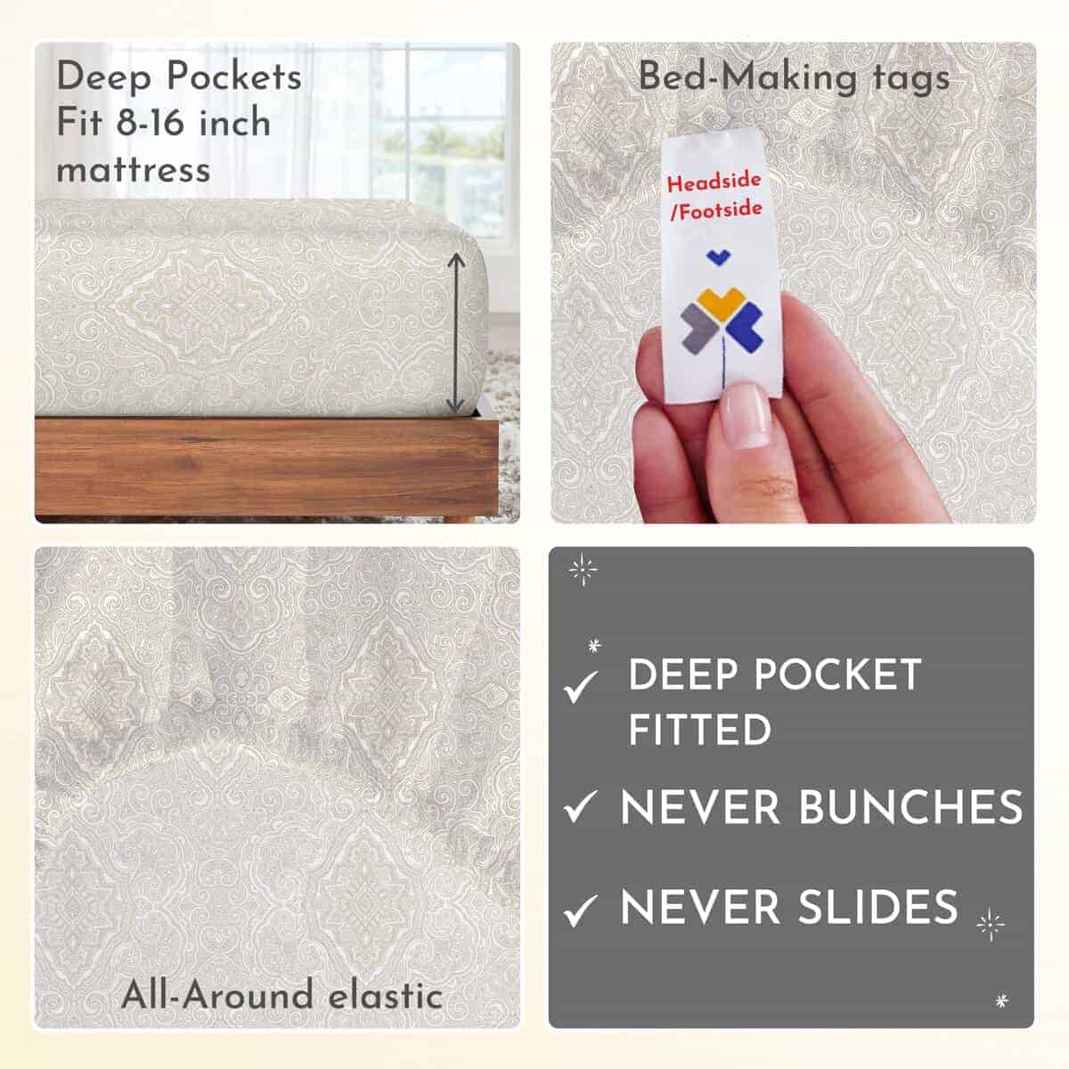 Descubre la Combinación Perfecta de Estilo y Confort con Juegos de Sábanas Estampadas Agrega un toque de personalidad a tu ropa de cama con nuestros juegos de sábanas estampadas de algodón sateen 100% de 400 hilos. Estas sábanas ofrecen un confort increíble y presentan estampados claros y bien definidos que expresan sutilmente tu estilo personal. Priorizamos tanto el estilo como la practicidad, asegurando que nuestras sábanas estampadas cumplan altos estándares de calidad y durabilidad. La tela naturalmente lujosa y suave proporciona un sueño confortable, mientras que los colores vibrantes perduran en el tiempo, evitando la decoloración o el sangrado con los lavados. Nuestros juegos de sábanas estampadas están elaborados con el mejor algodón sateen con calidad de impresión inigualable. El tejido de alta densidad de la tela lo hace ideal para estampados hermosos y de buen gusto, con colores perfectamente equilibrados evitando cualquier error de impresión o patrones estridentes. Estos juegos de sábanas han sido elaborados de manera experta, con costuras de calidad y bolsillos de 16 pulgadas de profundidad para adaptarse a colchones de 8 a 16 pulgadas. El elástico fuerte y seguro asegura que tus sábanas permanezcan en su lugar, incluso después de años de uso. Personaliza tu Dormitorio – Realza tu ropa de cama con nuestras sábanas estampadas, que cuentan con una variedad de florales y rayas divertidas. Destaca tu personalidad y agrega un toque de color a tu dormitorio. Es hora de expresarte con nuestras sábanas estilosas y prácticas.