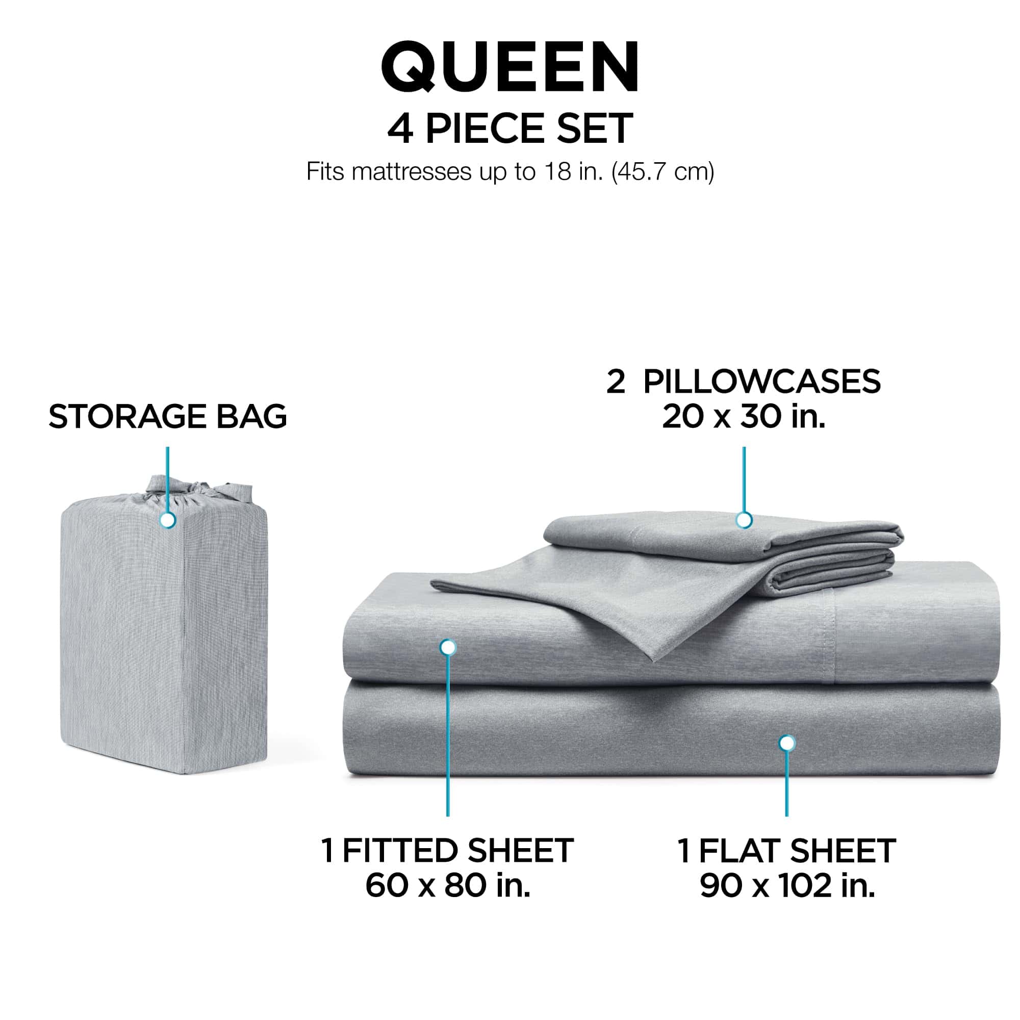Sábana Plana: 80% Nailon, 20% Polietileno, Punto, 180 g/m2 Sábana Ajustable/Funda de Almohada: 100% Poliéster, Punto, 150 g/m2 Juego de 4 piezas incluye: (1) sábana plana, (1) sábana ajustable, (2) fundas de almohada (El tamaño individual es un juego de 3 piezas con (1) funda de almohada)