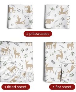 ¡Tenga una temporada navideña aún más especial con nuestro juego de sábanas de renos reina! El juego incluye dos fundas de almohada, una sábana plana y una sábana ajustable. La sábana plana tiene unas dimensiones de 102 x 90 pulgadas, la sábana ajustable mide 80 x 60 pulgadas y las dos fundas de almohada son de 20 x 30 pulgadas.
