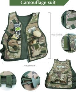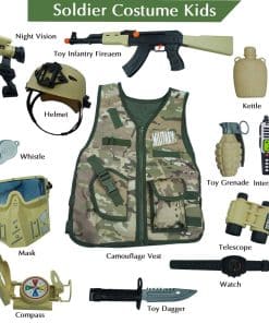 RedCrab se preocupa más por la calidad de los juguetes que tú. ¡RedCrab Toys será la mejor opción para ti! Este set de disfraz de guerra del desierto de camuflaje militar está hecho con materiales de alta calidad y fáciles de limpiar. Construido para durar y listo para crecer con tus hijos, ofreciendo años de diversión. Paquete incluido: 1 chaleco con cremallera de camuflaje 1 pistola de juguete 1 máscara de juguete 1 casco de combate de juguete 1 visión nocturna de juguete (con luz) 1 tetera militar de juguete 1 daga de juguete 1 interfono de juguete 1 reloj de juguete 1 brújula de juguete 1 silbato de juguete 1 granada de juguete 1 telescopio de juguete Tamaño: Chaleco militar: 47 x 38 cm / 18.5 x 15 pulgadas Pistola de juguete: 51.5 x 14.5 cm / 20.3 x 5.7 pulgadas Casco de combate de juguete: 22 x 19.5 cm / 8.7 x 7.7 pulgadas Máscara de juguete: 15 x 17 cm / 5.9 x 6.7 pulgadas Información: No apto para niños menores de 3 años. Para ser utilizado bajo la supervisión directa de un adulto. Riesgo de asfixia debido a piezas pequeñas. Tenga en cuenta; el casco es solo para actividades recreativas. No lo use como un elemento de seguridad.