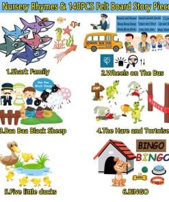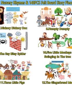 Gran Set de Tablero de Fieltro para Cuentos: El set de tablero de fieltro para contar cuentos incluye 1 bolsa portátil de fieltro y 12 piezas de fieltro con temas de cuentos de hadas. Familia de tiburones; Ruedas del autobús; Baa, oveja negra; La liebre y la tortuga; 5 patitos; BINGO; Hickory Dickory Dock; Humpty Dumpty; La araña Itsy Bitsy; 5 monitos columpiándose en el árbol; Los tres cerditos; El hombre de jengibre. Ellos son los cuentos de hadas favoritos para los preescolares. Además, el tablero de fieltro para cuentos es una gran herramienta para que los padres y maestros se comuniquen y jueguen con los niños.