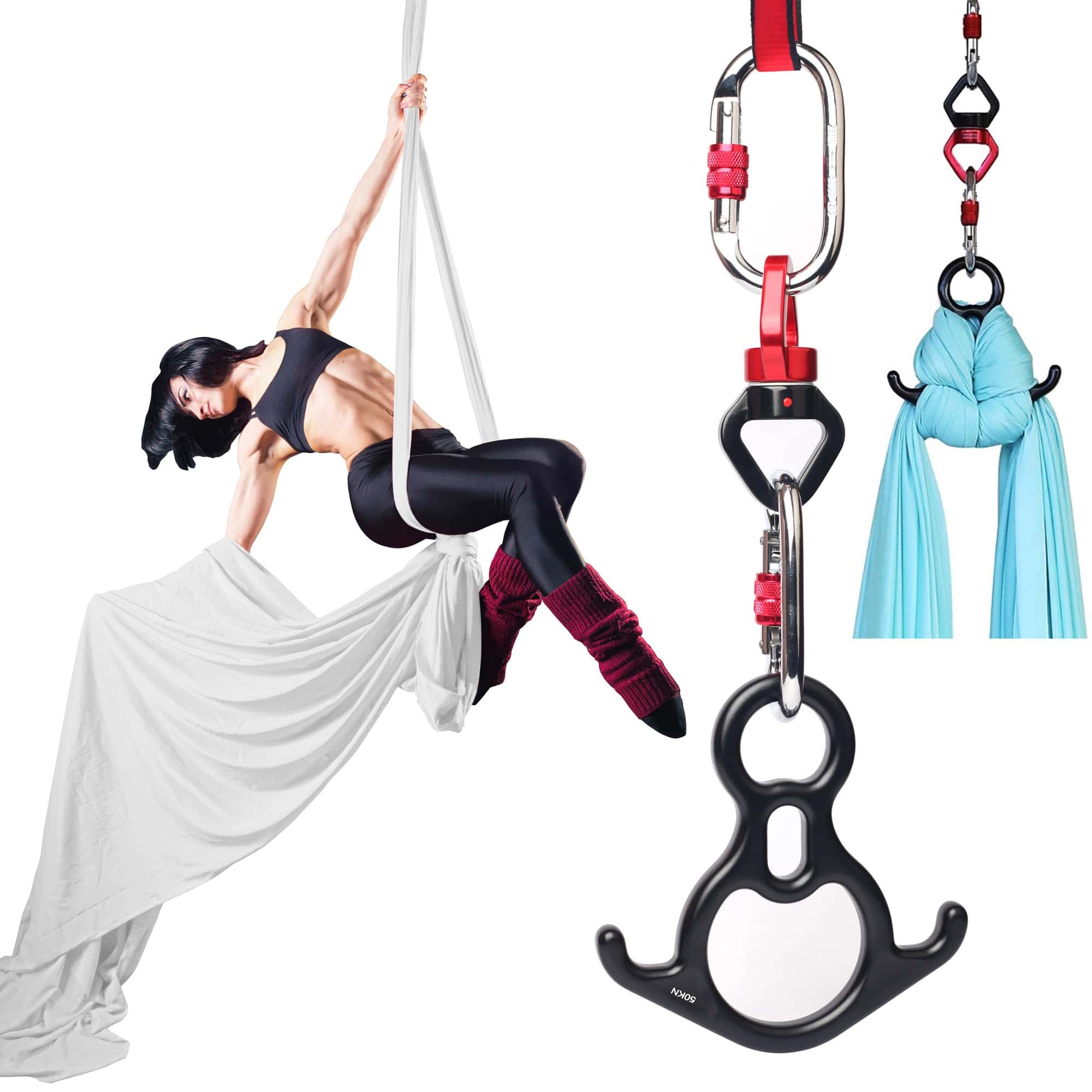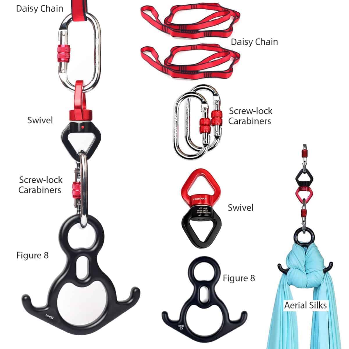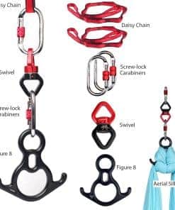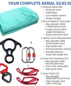 2. Fácil de Configurar: Este set de inicio incluye todo lo que necesitas para empezar con las telas aéreas, incluyendo un juego de equipo de anclaje resistente e instrucciones claras sobre cómo configurarlo. Tu set incluirá: 2 x cadenas de margaritas, 1 x Figura 8/Descensor, 1 x Giratorio, y 2 x Mosquetones de bloqueo de tornillo de acero, 1x Guía de Instrucciones.