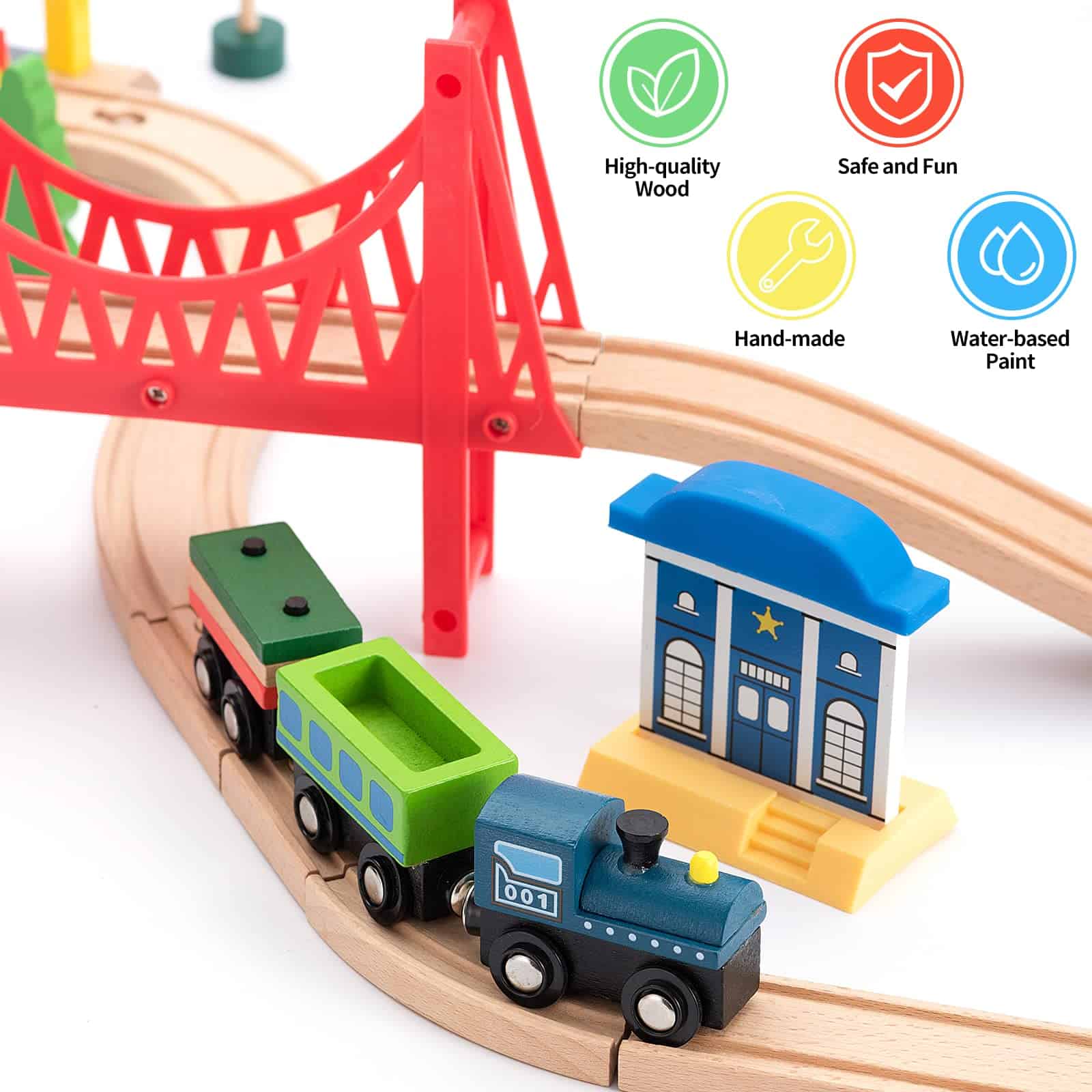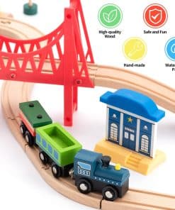Este set de tren de madera BetDEF de 65 piezas es ideal para niños y niñas que disfrutan de jugar con trenes y desarrollar su creatividad. Incluye vías de tren, varios trenes con accesorios, un helicóptero, casas de policía y otros elementos que permiten a los niños construir su propio sistema de tráfico. Fabricado con madera de abedul y haya natural, este set de tren es seguro para los niños, ya que no contiene sustancias tóxicas. Además, es compatible con varias marcas de trenes, lo que brinda versatilidad y diversión continua. ¡Hazte con este set de tren de madera BetDEF y permite que los niños exploren su imaginación y creatividad mientras se divierten!