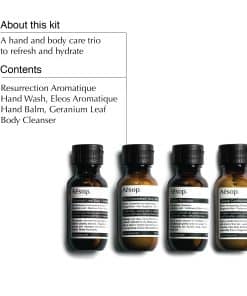 Este set de viaje de Aesop es perfecto para llevar tus productos principales de cuidado del cabello y del cuerpo a donde vayas. Contiene 4 envases de 1.7oz / 50mL cada uno, que te ayudarán a mantenerte fresco durante tus viajes. ¡No te pierdas la oportunidad de llevar contigo los mejores productos de Aesop para lucir impecable en todo momento!