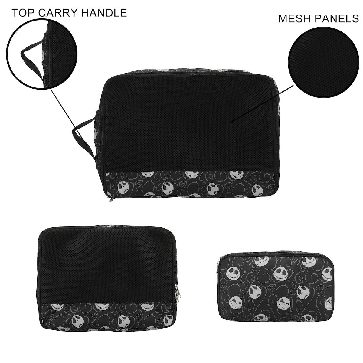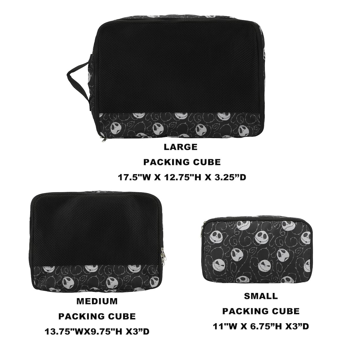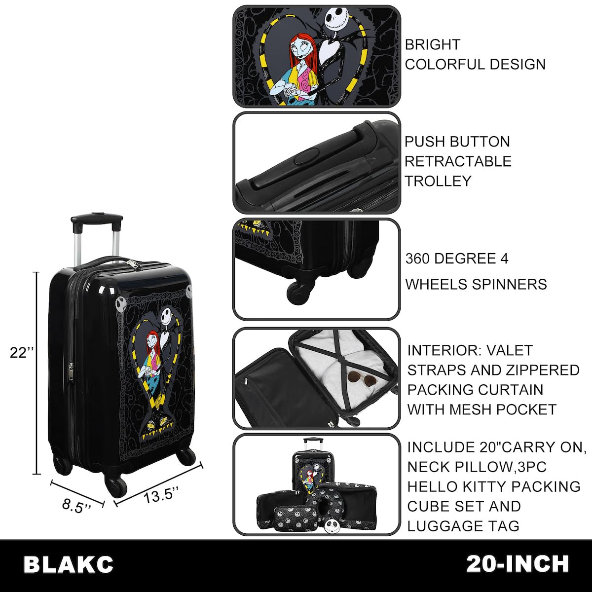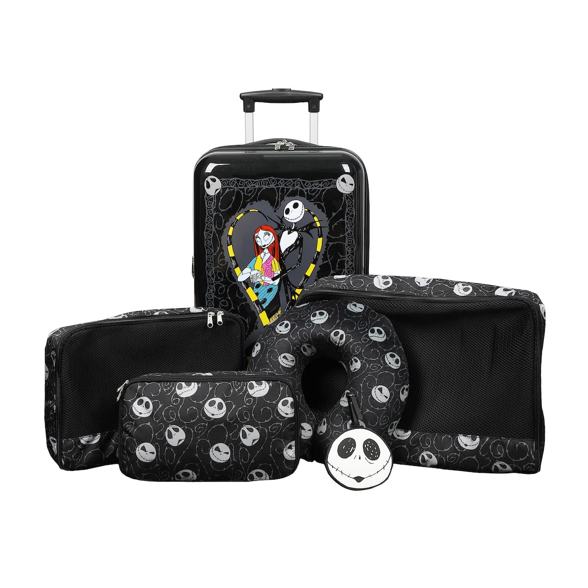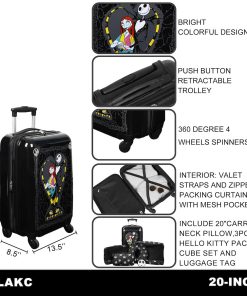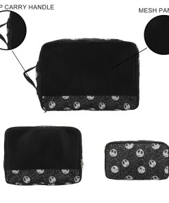 Viaja con un toque de magia de Halloween Town con este set de viaje de 4 piezas de Pesadilla Antes de Navidad. El set incluye un equipaje de 20″ negro con ruedas, un asa trolley retráctil y correas interiores con cortinas de empaque con cremallera, una almohada de cuello negra con una impresión de la cabeza de Jack, tres cubos de empacado de diferentes tamaños con el mismo diseño y una etiqueta de equipaje con la forma de la cabeza de Jack. Todos los artículos son fáciles de limpiar, mezclando estilo y funcionalidad para los fanáticos de la icónica película.