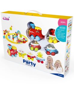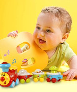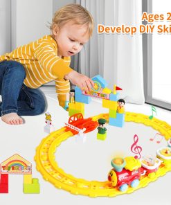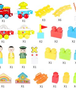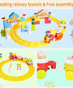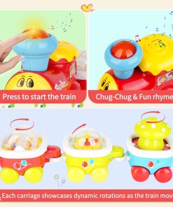 Los niños presionan la pequeña chimenea del tren y luego el tren se mueve. 4 pequeños trenes de carga tienen una variedad de diferentes dinámicas, cuando el tren comienza acompañado de música alegre, las luces coloridas de la chimenea se iluminan.
