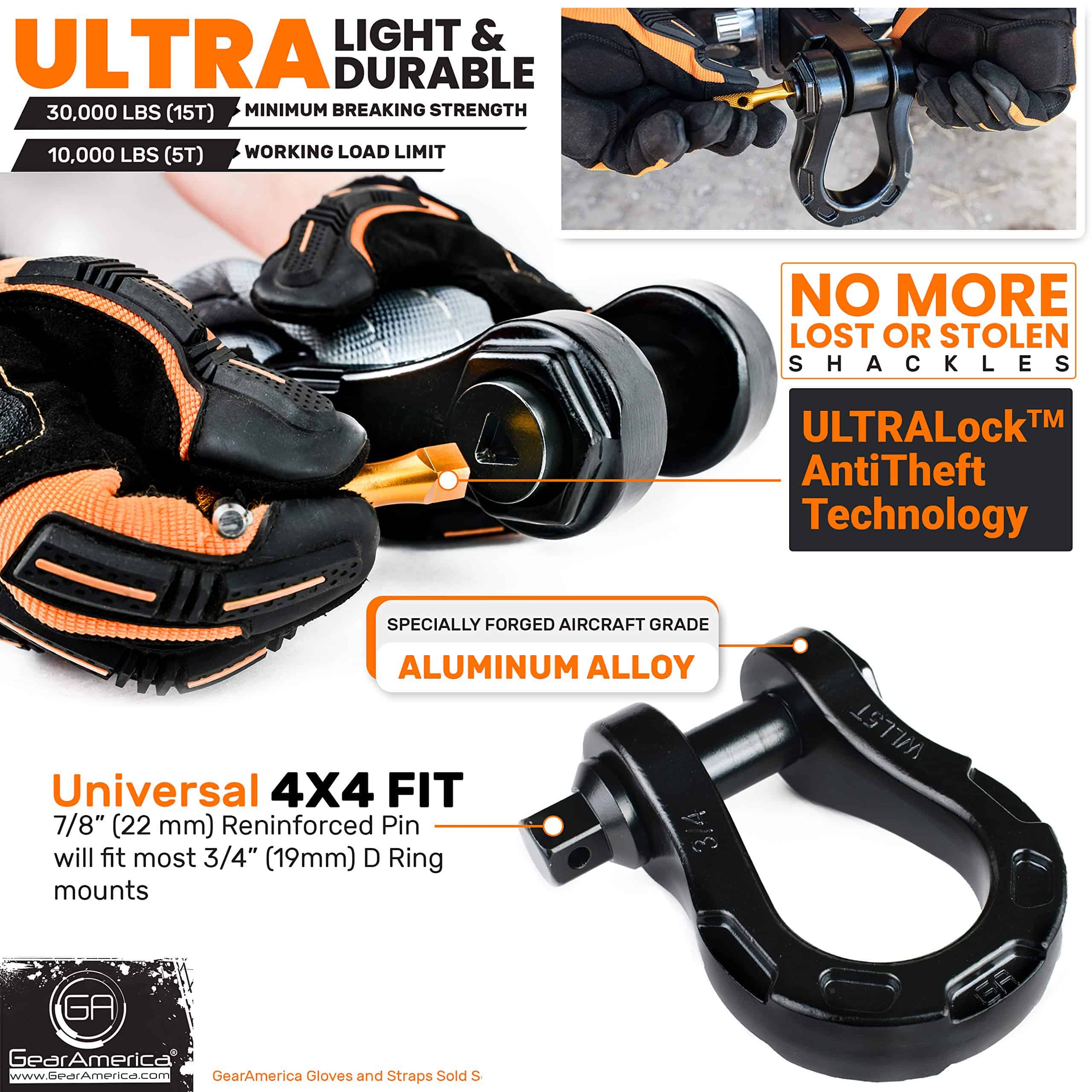 2. ULTRA FUERTES Y ULTRA LIGEROS: Con una Resistencia a la Rotura Mínima de 15 Toneladas y un Límite de Carga de Trabajo de 5 Toneladas, estos Ultra Shackles son tan fuertes como una anilla en D de acero con solo la mitad del peso.