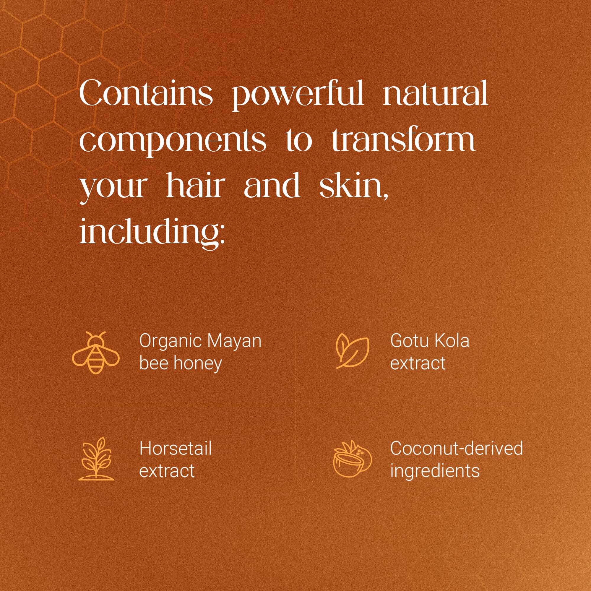Este lujoso champú de miel de abeja maya está elaborado con miel de abeja maya recolectada de forma sostenible en pequeñas granjas orgánicas en Yucatán, México. Con una fórmula ancestral diseñada para nutrir y revitalizar, transforma mechones opacos y sin vida en cabello vibrante y saludable. Libre de ingredientes agresivos como parabenos, ftalatos, siliconas y sulfatos, este champú ofrece una experiencia de limpieza suave que respeta tu cabello y cuero cabelludo. Enriquecido con extractos naturales como Centella asiática, Cola de Caballo y extractos de coco, fortalece, nutre y mejora la salud general de tu cabello, promoviendo un brillo natural y una textura suave. Este champú de miel es un favorito de los huéspedes de hotel en los principales hoteles de México, brindando un toque de lujo y una experiencia tipo spa a tu rutina diaria de cuidado del cabello.