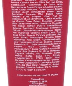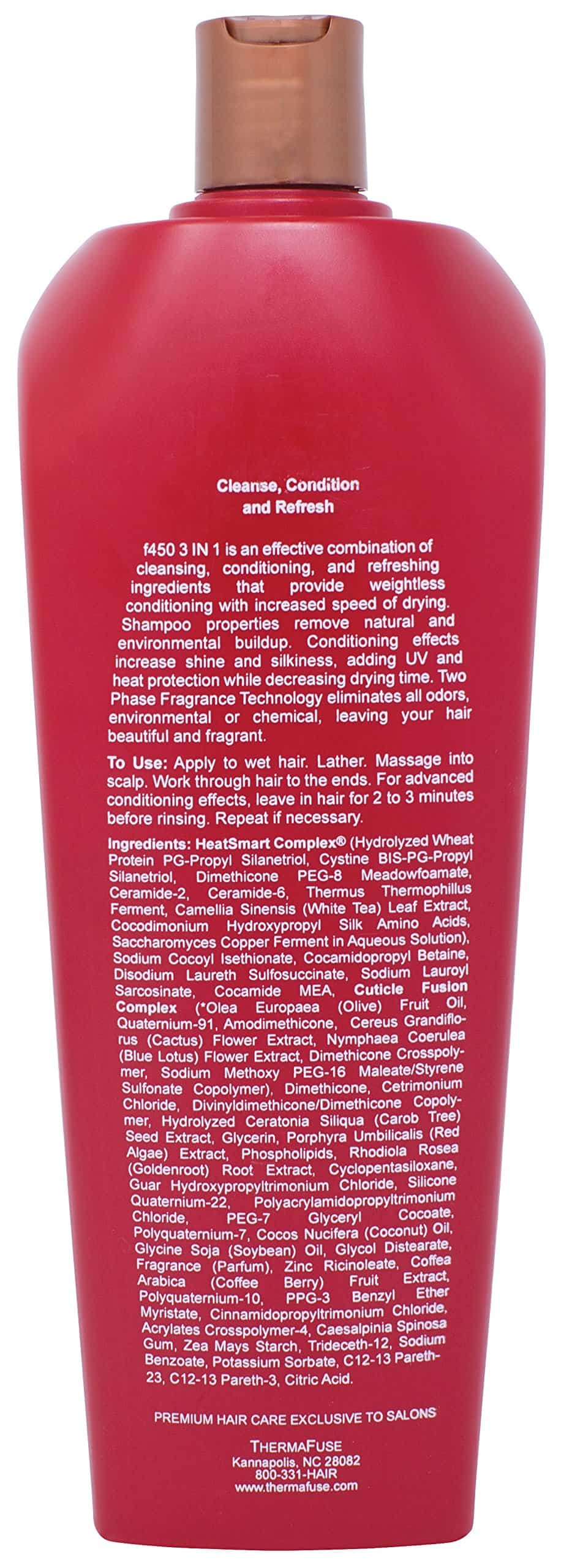 Shampoo y acondicionador 3 en 1 Thermafuse f450 de 33.8 oz. Este producto acondiciona y refresca el cabello, proporcionando humedad y nutrientes para que tu cabello se sienta suave mientras controla el frizz. Cierra la cutícula del cabello para dar brillo a cabellos dañados y elimina todos los olores del cabello de los servicios químicos y depósitos ambientales. Este producto es libre de sulfatos y cloruro de sodio, lo que lo convierte en un limpiador hidratante que limpia suavemente el cabello y el cuero cabelludo sin secar ni dañar. Es seguro para usar después de tratamientos de alisado y queratina, siendo el shampoo ideal para uso diario. Presenta tecnología de fragancia de dos fases, creada como una excelente fórmula para controlar olores no deseados. Es perfecto para después del gimnasio o después de tratamientos químicos que dejan un olor residual, pudiéndose usar regularmente o un par de veces a la semana como parte de tu régimen de belleza. Este producto es suave pero efectivo, con un pH de cinco punto cinco que es lo suficientemente alto para limpiar el cabello pero no para eliminar los aceites naturales del cabello y cuero cabelludo. Desenreda el cabello y deja una sensación y aroma frescos y uniformes.